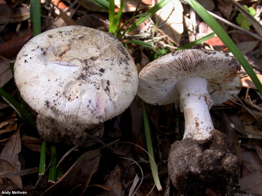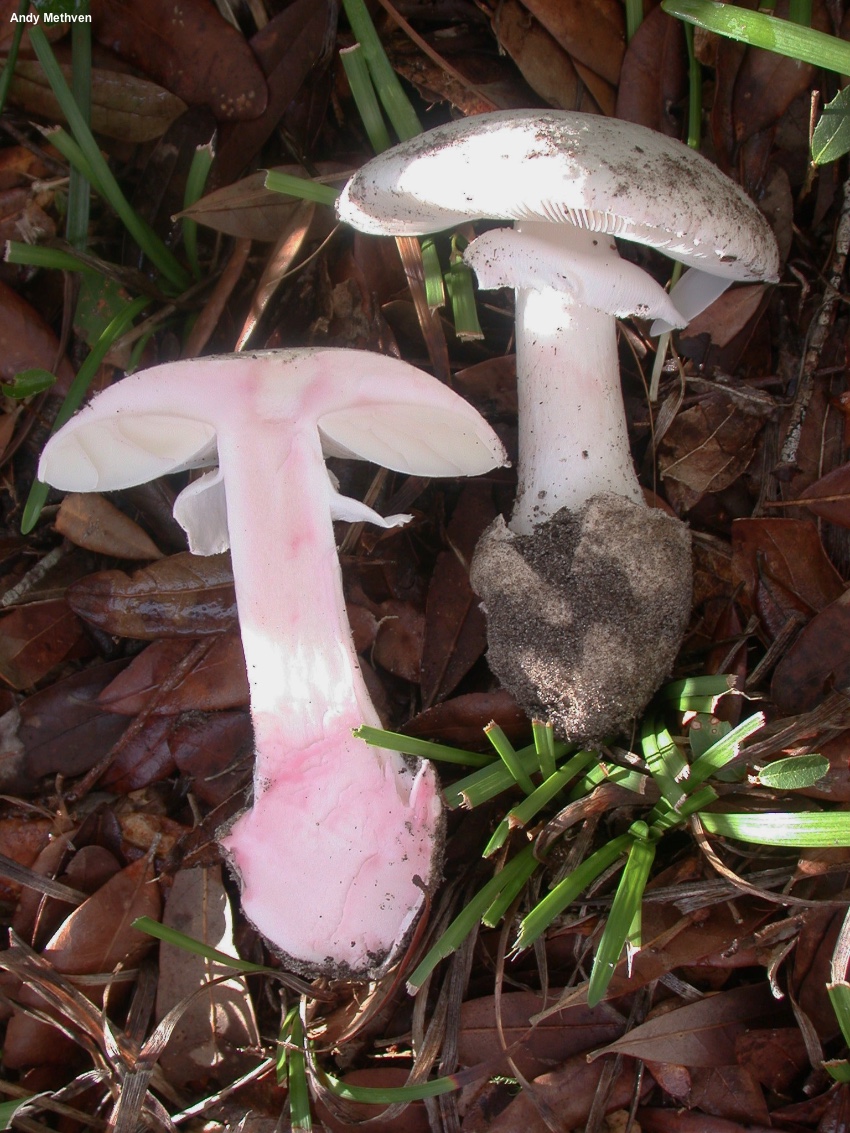 Amanita mutabilis [ Basidiomycota > Agaricales > Amanitaceae > Amanita . . . ] by Michael Kuo "The quick change of color when the stem is wounded is different from anything I have observed in Amanita," wrote the mycologist who first described Amanita mutabilis (Beardslee 1919). "The change is much quicker and much more distinct than in A. rubescens. Three minutes seemed to be the usual period for developing a deep carmine." The prompt pink to purplish red bruising, the white cap and stem, and the way the volva forms a rimmed upper edge on the stem's bulb characterize this gorgeous species, which is distributed from Texas to Florida and New Jersey. Thanks to Andy Methven for collecting, documenting, and facilitating study of Amanita mutabilis. Description: Ecology: Mycorrhizal with oaks and pines in pine-oak forests; summer and fall; fairly widely distributed from Texas to Florida and New Jersey. The illustrated and described collection is from Georgia. Cap: 6–10 cm across; convex, expanding to broadly convex, planoconvex, or flat; bald; tacky when fresh; white, bruising pink; with one to several flat, whitish to faintly grayish patches; the margin not lined. Gills: Free from the stem or nearly so; white; close; bruising pink; short-gills present. Stem: 6–11 cm long; 1–2 cm thick; fairly equal above a swollen base (3–4 cm thick); dry; finely silky; white; bruising pink; with a white, fragile, skirtlike ring and a white volva that features a rimmed upper edge. Flesh: White; quickly staining pink on exposure. Odor: Not distinctive. Microscopic Features: Spores 11–13.5 x 7–8 µm; ellipsoid; smooth; hyaline in KOH; amyloid. Basidia 4-sterigmate. Hymenial cystidia not found. Subhymenium inflated-ramose. Pileipellis a cutis of elements 2.5–7.5 µm wide, hyaline in KOH. REFERENCES: Beardslee, 1919. (Tulloss, 1984; Weber & Smith, 1985; Jenkins, 1986; Metzler & Metzler, 1992; Tulloss, continuously updated.) Herb. Kuo 08272001 (portion of ASM 12461). This site contains no information about the edibility or toxicity of mushrooms. |