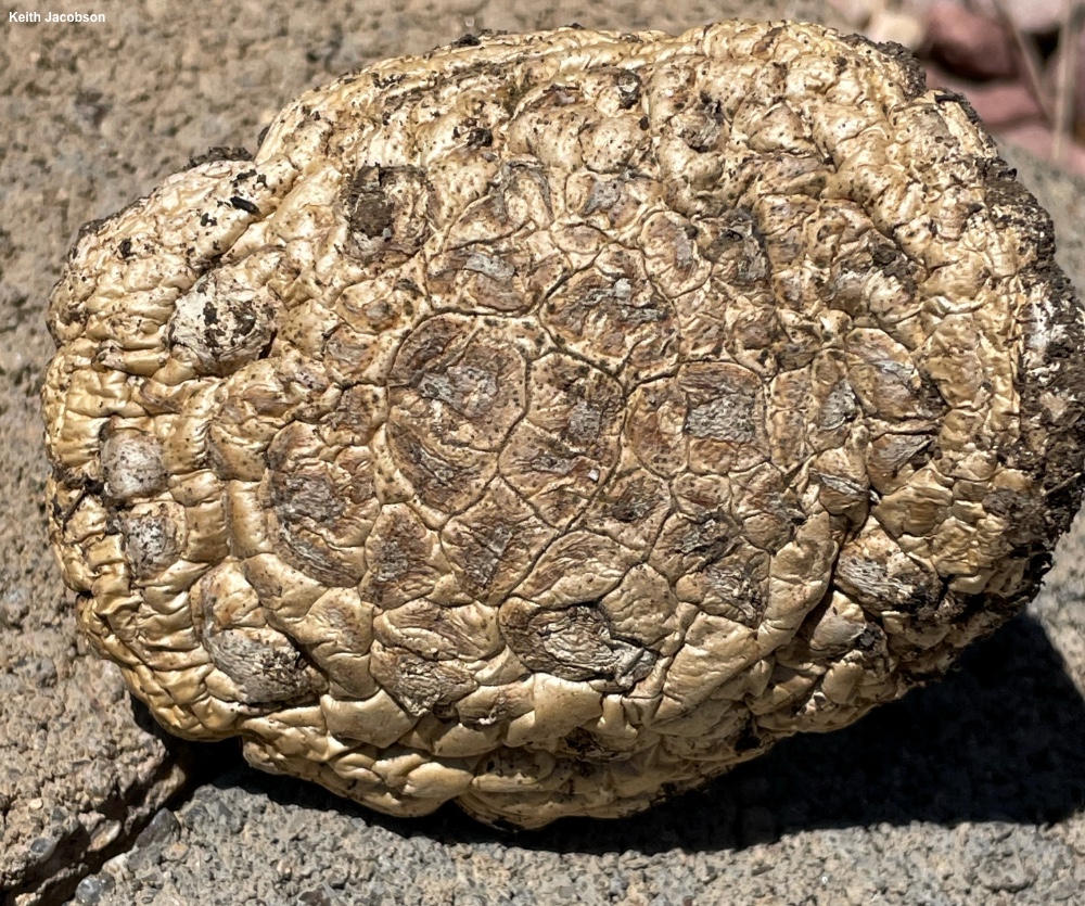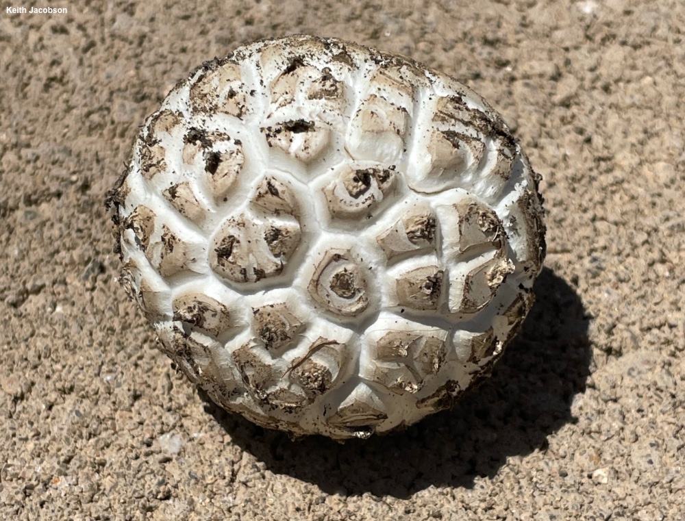 Amanita prairiicola [ Basidiomycota > Agaricales > Amanitaceae > Amanita . . . ] by Michael Kuo This is an atypical species of Amanita, since it is not associated with trees in a symbiotic, mycorrhizal relationship; instead, Amanita prairiicola is a saprobe that decomposes litter (primarily senescent grass roots). Thus, like Amanita thiersii, it is found in grassy areas, often far from trees, and was given the Latin epithet prairiicola ("prairie loving") when it was first described from Kansas. Distinguishing features for Amanita prairiicola include its whitish cap, with brownish warts, the creamy gills that are free from the stem, the collapsing ring and brownish patches of veil on the stem—and, under the microscope, its elongated-ellipsoid, amyloid spores. Similar grassland amanitas include Amanita thiersii, which is covered with powdery white shagginess and has a Midwestern range that probably only overlaps in Texas and Oklahoma (if at all), and the West Coast's Amanita pruittii, which is more gray and has more warts, along with a striate ring. Amanita subcaligata is another western grasslands, but it is less similar, since its colors are pinkish to pinkish orange and its more slender stem is sheathed with scales of veil. There may be several cryptic species hanging out within Amanita prairiicola; one of these, at a minimum, has been tentatively separated and given a provisional name by Amanita expert Rod Tulloss. Amanita malheurensis is a synonym, as is Saproamanita prairiicola. Thanks to Keith Jacobson for documenting, collecting, and preserving Amanita prairiicola for study; his collection is deposited in The Herbarium of Michael Kuo. Description: Ecology: Saprobic, appearing in grasslands, growing alone or gregariously; originally described from Kansas; distributed in North America from the Great Plains westward to Colorado, the southwestern United States, and southern California; also known from Argentina. The illustrated and described collection is from Colorado. Cap: 5–11 cm across; convex, expanding to broadly convex or planoconvex; dry; white to pale brownish, with brownish to grayish brown, flattened warts; developing cracks and fissures in arid conditions; the margin not lined. Gills: Free from the stem or nearly so; creamy, becoming brownish when past maturity; close; short-gills frequent. Stem: 5–9 cm long; 1–2 cm thick; fairly equal; dry; finely fibrillose; whitish to pale brownish; with a collapsing white ring; universal veil remnants present as brownish patches. Flesh: White; unchanging when sliced. Odor: Not distinctive. Spore Print: Creamy white. Microscopic Features: Spores 10–12 x 6.5–7.5 µm; elongated-ellipsoid; smooth; hyaline in KOH; amyloid. Basidia about 40 x 10 µm; clavate; 4-sterigmate. Hymenial cystidia not found. Pileipellis not differentiated; cap surface a layer of smooth, hyaline elements 5–15 µm wide, with velar sphaerocysts in chains. REFERENCES: C. H. Peck, 1897. (Bas, 1969; Jenkins, 1986; Miller et al., 1990; Tulloss, 2000; Tulloss, 2007; Cripps, Evenson & Kuo, 2016; Redhead et al., 2016; Tulloss et al., 2016; Tulloss, continuously updated.) Herb. Kuo 05232101. This site contains no information about the edibility or toxicity of mushrooms. |