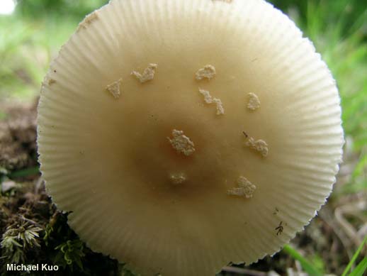 Amanita russuloides [ Basidiomycetes > Agaricales > Amanitaceae > Amanita . . . ] by Michael Kuo North American mycological pioneer Charles Peck thought this mushroom looked like a russula--presumably, something like Russula pectinatoides, with a strongly "tuberculate-striate" (simultaneously lined and pimply) cap margin. In this sense Amanita russuloides is definitely russula-like, especially when viewed from the top. Amanita russuloides appears east of the Great Plains, and features a dull yellow to straw colored cap, scattered grayish to whitish warts, a fragile ring that often disappears, and a small basal bulb that often features a collarlike rim. Not a lot separates Amanita russuloides from the North American version of Amanita gemmata--but the latter is apparently limited to western North America. Additionally, the cap of Amanita russuloides turns pinkish orange with KOH while the cap of Amanita gemmata displays a negative reaction; the spores of Amanita russuloides are slightly smaller; Amanita russuloides is, on average, less stocky; and the cap margin of Amanita russuloides is substantially more striate. Amanita russuloides should also be compared with Amanita multisquamosa (cap whitish with a yellowish center, warts more numerous, margin less prominently lined). Description: Ecology: Mycorrhizal with conifers and hardwoods, but especially fond of oaks; often found in grassy areas; growing alone, scattered, or gregariously; summer and fall; possibly widely distributed east of the Great Plains. Cap: 3-9 cm; convex to broadly convex, flat, or shallowly depressed in age; thin-fleshed; sticky when fresh but soon dry; brownish yellow when very young, becoming pale yellow to straw yellow or, in old age, nearly whitish; with a few whitish to grayish warts that often disappear entirely; bald; the margin lined and pimply for 1-3 cm. Gills: Free from the stem or nearly so; white to creamy; crowded or close; short-gills occasional. Stem: 4-9 cm long; 0.5-1.5 cm thick; tapering slightly to the apex; whitish; bald or finely hairy; whitish, discoloring brownish; with a fragile whitish ring that can appear fairly high on the stem or nearly at the bottom and often disappears entirely; terminating in a small basal bulb; with fragile white volval remnants that form a few vague rings or, more often, a collarlike rim. Flesh: White; unchanging. Odor: Not distinctive. Chemical Reactions: KOH on cap surface orange to pinkish orange. Spore Print: White. Microscopic Features: Spores 8-10.5 x 5.5-8 µ; smooth; broadly elliptical; inamyloid. Basidia 4-spored; without clamps. Pileipellis an ixocutis of elements 2.5-8 µ wide. Lamellar trama bilateral; subhymenium cellular. REFERENCES: (Peck, 1873) Saccardo, 1887. (Murrill, 1913; Beardslee, 1914; Kauffman, 1918; Smith, Smith & Weber, 1979; McNeil, 2006.) Herb. Kuo 08010303, 08180602, 05290704, 06280804, 06041304. This site contains no information about the edibility or toxicity of mushrooms. |