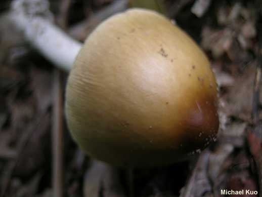Amanita sinicoflava [ Basidiomycetes > Agaricales > Amanitaceae > Amanita . . . ] by Michael Kuo This subtly beautiful Amanita is a member of the Amanita vaginata group; like the other species in the group it lacks a ring and features a strongly lined cap margin, as well as a sacklike volva. Amanita sinicoflava can be separated from the others without a microscope on the basis of its "Chinese yellow" to olive tan or olive yellow cap and its volva, which usually stains gray to black by maturity. It often features a small, darker (and usually raised) area over the center of the cap. It is fairly widely distributed east of the Great Plains, and appears under hardwoods or conifers. Description: Ecology: Mycorrhizal with various conifers and hardwoods; growing alone or gregariously; summer and fall; fairly widely distributed east of the Great Plains. Cap: 2.5-7 cm; bell-shaped, expanding to broadly bell-shaped, convex, or nearly flat; sticky or dry; sometimes with a few whitish or grayish patches that are easily lost; olive tan to olive yellow, often darker over the center; the margin prominently lined. Gills: Free from the stem or nearly so; close or nearly crowded; whitish, developing grayish tones with age. Stem: 6-14 cm long; up to just over 1 cm thick; tapering slightly to the apex; without a basal bulb; white; discoloring a little brownish on handling; base encased in a loose but fairly persistent sacklike volva that is initially white but discolors grayish to blackish with maturity, beginning with the upper edge. Flesh: Whitish; unchanging. Odor: Not distinctive. Spore Print: White. Chemical Reactions: KOH on cap surface negative. Microscopic Features: Spores 8-15 µ; globose or subglobose; smooth; inamyloid. Basidia primarily 4-spored; without basal clamps. Pileipellis a cutis or ixocutis of filamentous hyphae. Lamellar trama bilateral; subhymenium ramose to cellular. REFERENCES: Tulloss, 1988. (Phillips, 1991/2005; Roody, 2003; McNeil, 2006; Tulloss, 2013.) Herb. Kuo 09029505, 07110704, 07140702, 07011302. Further Online Information: This site contains no information about the edibility or toxicity of mushrooms. |