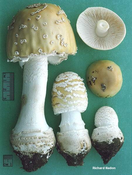 Amanita velatipes [ Basidiomycetes > Agaricales > Amanitaceae > Amanita . . . ] by Michael Kuo Amanita velatipes is a hefty eastern North American species featuring a dull yellow cap with a brownish center and many whitish warts, along with a distinctive stem base that is ringed with a collar and/or concentric rings of universal veil material. The species should be compared with Amanita russuloides, Amanita multisquamosa, and Amanita muscaria var. guessowii, all of which are also found in eastern North America and can appear similar. Several western North American species (especially Amanita gemmata and Amanita pantherina) look similar but appear over 2,000 miles away in widely different ecosystems and thus should not lead to confusion. Thanks to the New York Botanical Garden Herbarium for facilitating my study of the collection cited and described below. Description: Ecology: Mycorrhizal with hardwoods and conifers; growing alone, scattered, or gregariously; summer and fall; northeastern North America, ranging west to Michigan and south to the southern Appalachians. Cap: 5-18 cm; oval or egg-shaped at first, becoming convex, broadly convex, or nearly flat; sticky at first or when wet; bald underneath numerous whitish warts that are initially arranged more or less concentrically and which may disappear in wet weather; brownish when very young or over the center, but soon dull tan to creamy yellow. Gills: Free from the stem or attached to it; white; crowded; short-gills frequent. Stem: 8-20 cm long; 0.5-2 cm thick; more or less equal above; terminating in a basal bulb that usually features a folded-over rim of universal veil material on the upper edge, along with concentric bands of veil material; with a sturdy white ring; bald or finely silky above the ring, finely hairy to shaggy below; whitish. Flesh: White throughout; unchanging when sliced. Odor: Not distinctive. Spore Print: White. Microscopic Features: Spores 8-13 x 6-8 µ; ellipsoid; smooth; inamyloid. Basidia 4-spored; rarely clamped. Pileipellis an ixocutis of hyphae 2-8 µ wide. Lamellar trama bilateral; subhymenium ramose. REFERENCES: Atkinson, 1900. (Jenkins, 1986; Phillips, 1991/2005; Horn, Kay & Abel, 1993;Roody, 2003; McNeil, 2006.) Herb NY 49002 (HEB 9118). This site contains no information about the edibility or toxicity of mushrooms. |