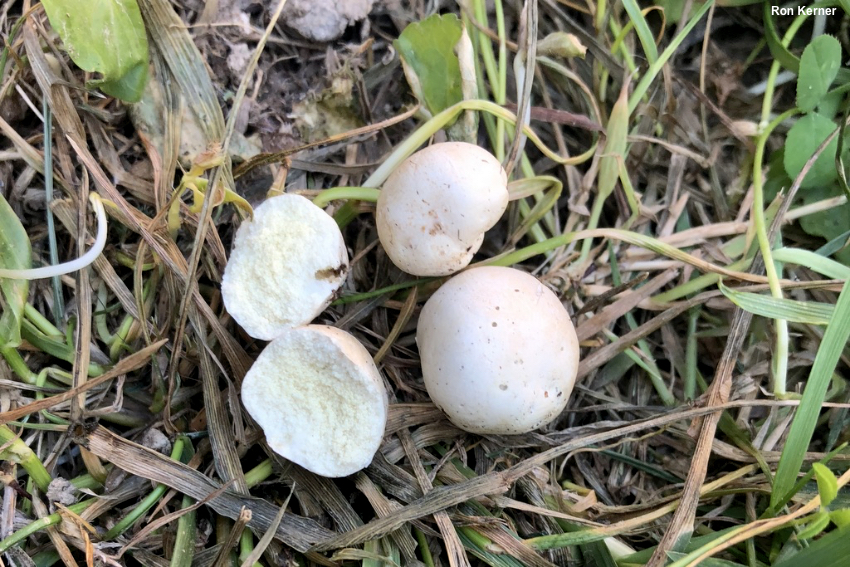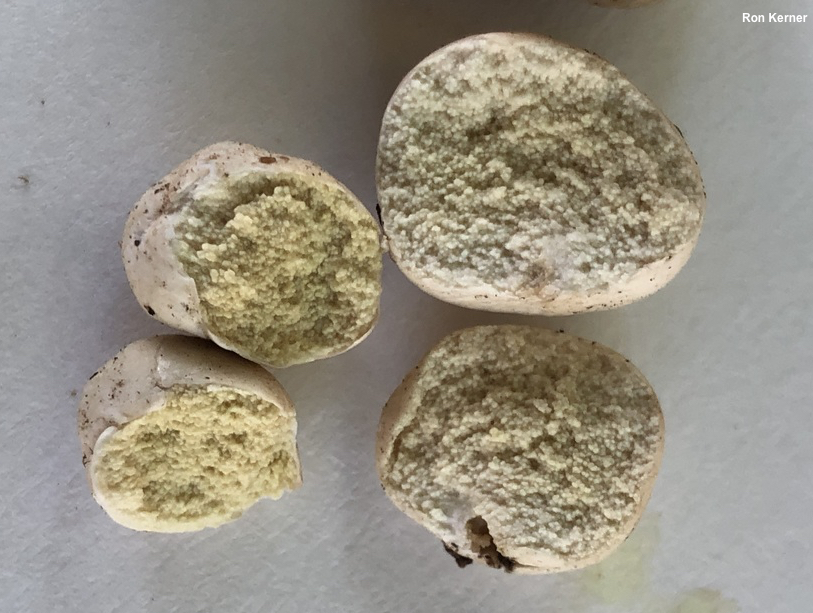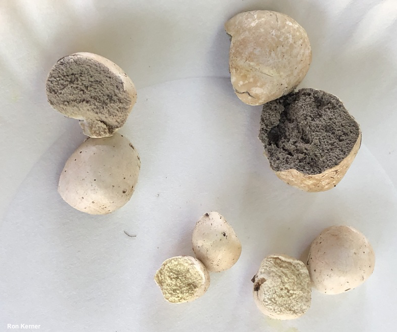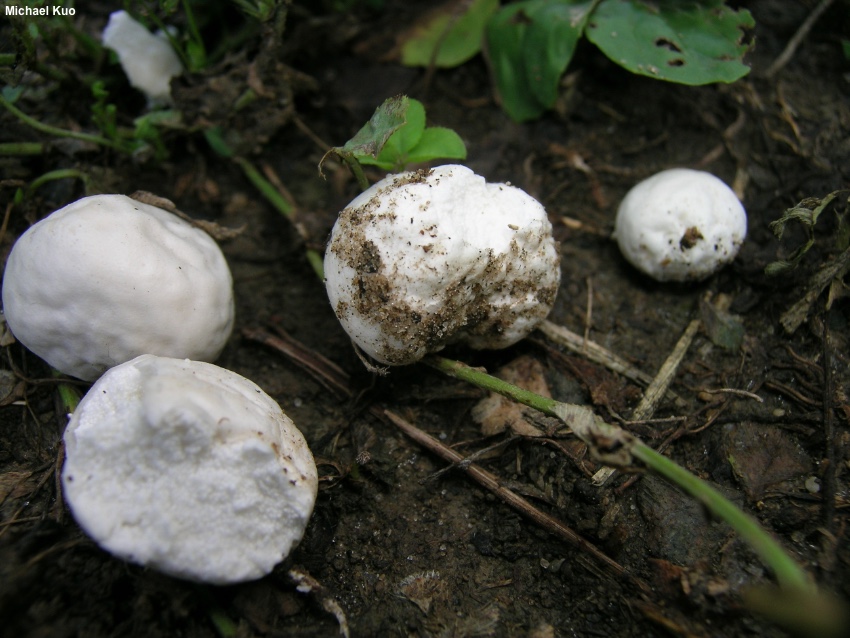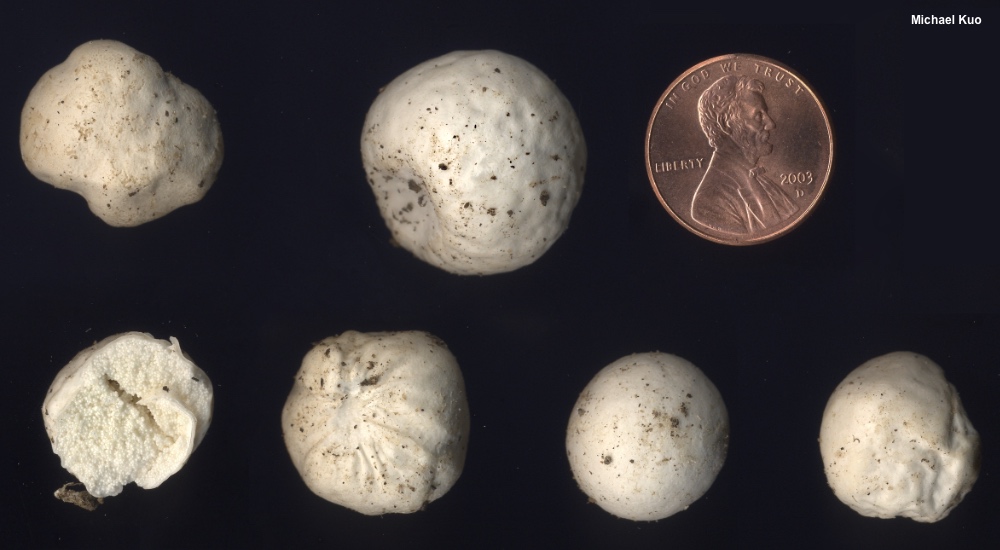 Arachnion album [ Basidiomycota > Agaricales > Agaricaceae > Arachnion . . . ] by Michael Kuo A lot of small, drab puffballs look like Arachnion album and, as Alexander Smith (1951) wrote, "the average collector is likely to pass it by unless [s]he is making a special search for it." My friend Ron Kerner, however, is no average collector; he noticed the interesting features that separate Arachnion album from the masses—an interior that becomes gray and is composed of tiny, sand-grain-like particles—and sent me his collection to study. This prompted me to go through my 30 or so unidentified puffball collections (they just pile up and I never seem to get to them; would you believe there are more than 110 russulas awaiting lab work?) and, lo and behold, there was a 13-year-old collection of Arachnion album still waiting for me to study and identify it. The little sand-grain-ish particles in the interior of Arachnion album are called peridioles (the same term used to describe the "eggs" in bird's nest fungi) because they are tiny packets in which spores are produced. Under the microscope, this makes Arachnion album very distinctive; the peridioles are discreet, often rupturing in a mount. In North America, Arachnion album is relatively common in grassy areas east of the Rocky Mountains—and it is occasionally reported from Oregon. Thanks to Ron Kerner for collecting, documenting, and preserving some the illustrated and described specimens; his collection is deposited in The Herbarium of Michael Kuo. Description: Ecology: Saprobic; terrestrial; growing gregariously in or near grassy areas (lawns, pastures, ditches, golf courses, and so on); summer and fall; widely distributed and fairly common east of the Rocky Mountains; rarely reported from Oregon. The illustrated and described collections are from Illinois and Indiana. Fruiting Body: Shaped like a ball, or nearly so; 1–2.5 cm across; 1–2.5 cm high; whitish to very pale brownish when fresh, becoming brownish with old age; surface bald; skin paper thin; interior composed of tiny sand-like granules—white at first, then yellowish, then light gray and eventually dark gray; sterile base absent. Odor and Taste: Not distinctive. Microscopic Features: Spores 3–5 x 3–4 µm; broadly ellipsoid or occasionally subglobose, with or without a short (1–2 µm) pedicel; smooth; hyaline to greenish-yellowish in KOH. Capillitium and paracapillitium not found. Peridioles 250–500 x 200–300 µm; ellipsoid or subglobose; brownish yellow; filamentous hyaline hyphae 2–8 µm wide present on the surfaces. REFERENCES: Schweinitz, 1822. (Saccardo, 1888; Coker & Couch, 1928; Lander, 1934; Smith, 1951; Miller & Miller, 1988; Lincoff, 1992; Trierveiler-Pereira, Kreisel & Baseia, 2010; Miller, Grand & Tredway, 2011.) Herb. Kuo 08160503, 06291801. This website contains no information about the edibility or toxicity of mushrooms. |