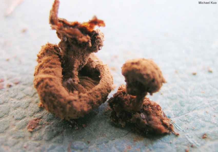 Asterophora lycoperdoides [ Basidiomycota > Agaricales > Lyophyllaceae > Asterophora . . . ] by Michael Kuo This fascinating mushroom is a parasite on other mushrooms—primarily species of blushing russulas like Russula densifolia. It pops right out of the top of its victim, usually when the Russula has blackened and begun to decay. Believe it or not, there are other mushrooms that parasitize russulas and are superficially similar, including species of Collybia and another species of Asterophora, Asterophora parasitica. Among these parasites, Asterophora lycoperdoides is unique in having a cap surface that soon becomes covered with brown powder. See the key to mycotrophs for more help separating these species. The powdery cap of Asterophora lycoperdoides is the result of its aggressive reproductive strategy. Like quaking aspen trees, which hedge their odds by reproducing not only through "normal" sexual means (flowers, seeds, and so on) but also by cloning themselves asexually (saplings arising from root systems), Asterophora lycoperdoides is ready to survive with or without genetic diversity. Its poorly formed gills bear basidia and produce sexual spores—but the cells on the cap surface also produce asexual chlamydospores, ready to clone the organism, resulting in the orangish brown powder that covers everything. Nyctalis asterophora is a former name. Thanks to Sue Moody for documenting, collecting, and preserving Asterophora lycoperdoides for study; her collection is deposited in The Herbarium of Michael Kuo. Description: Ecology: Parasitic on species of Russula and Lactarius (especially Russula dissimulans, Russula densifolia, and closely related blushing russulas); growing alone or gregariously; usually appearing when the victim has begun to blacken and decay; found in a variety of forests since the victims are mycorrhizal with both hardwoods and conifers; summer, fall, and winter (in warmer climates); originally described from France, and found throughout Europe; widely distributed in North America but apparently more common east of the Great Plains; also known from Central America, northern Africa, and Asia. The illustrated and described collections are from Illinois and Minnesota. Cap: 4–20 mm across; convex or nearly round; dry; at first whitish and a little bit roughened or lumpy, becoming covered with dense, orangish brown powder. Gills: Attached to the stem; thick; distant; sometimes poorly formed or vein-like; whitish or grayish; eventually covered with orangish brown powder. Stem: 4–30 mm long; 2–5 mm thick; more or less equal; dry; bald or finely fuzzy; whitish to brownish; eventually covered with orangish brown powder; basal mycelium white. Flesh: White; unchanging when sliced. Odor: Mealy. Microscopic Features: Basidiospores 5–6 x 4–5 µm; ellipsoid; smooth; hyaline in KOH; inamyloid. Basidia 25–28 x 3–6 µm; subclavate; 4-sterigmate. Cystidia not found. Hyphae near the cap surface 3–9 µm wide; walls 0.5 µm thick; smooth; hyaline in KOH; occasionally clamped at septa; contextual hyphae similar but inflated up to 18 µm wide. Chlamydospores 16–20 x 14–17 µm including ornamentation; nodulose-spiny (stellate) but otherwise smooth; hyaline to faintly yellowish in KOH. REFERENCES: (Bulliard, 1784) Ditmar, 1809. (Smith, Smith & Weber, 1979; Phillips, 1981; Arora, 1986; Breitenbach & Kränzlin, 1991; Phillips, 1991/2005; Lincoff, 1992; Horn, Kay & Abel, 1993; Barron, 1999; Roody, 2003; McNeil, 2006; Miller & Miller, 2006; Trudell & Ammirati, 2009; Kuo & Methven, 2010; Uzun et al., 2010; Blanco-Dios, 2011; Buczacki et al., 2012; Hofstetter et al., 2014; Kuo & Methven, 2014; Desjardin, Wood & Stevens, 2015; Siegel & Schwarz, 2016; Baroni, 2017; Gminder & Böhning, 2017; Elliott & Stephenson, 2018; Kalamees, 2018; He et al., 2019; Læssøe & Petersen, 2019.) Herb. Kuo 07310701, 08102001. This site contains no information about the edibility or toxicity of mushrooms. |