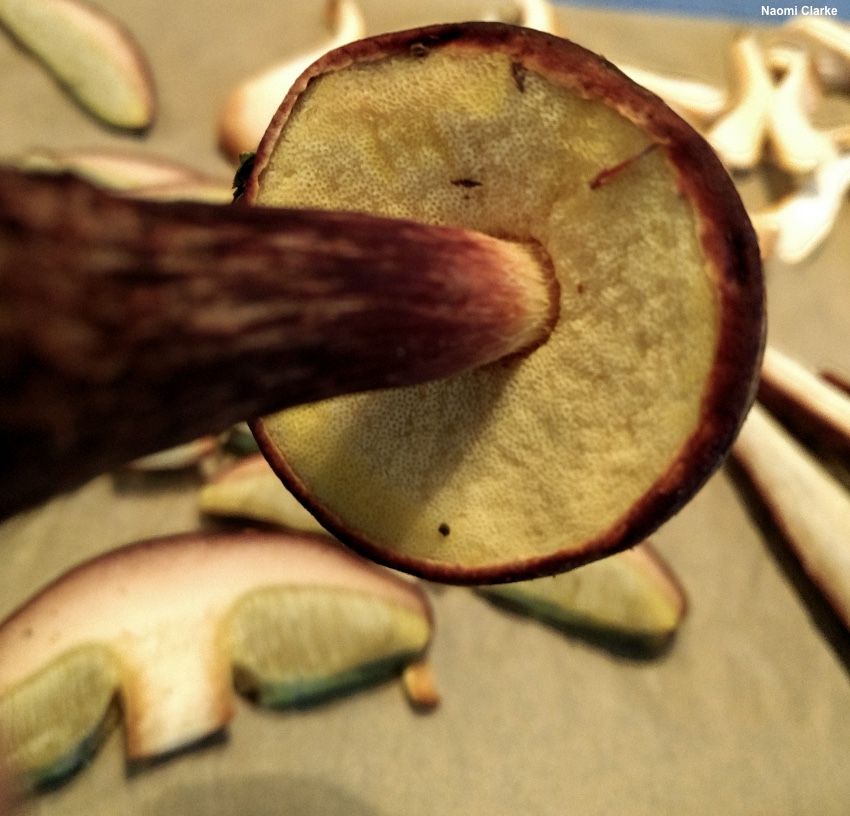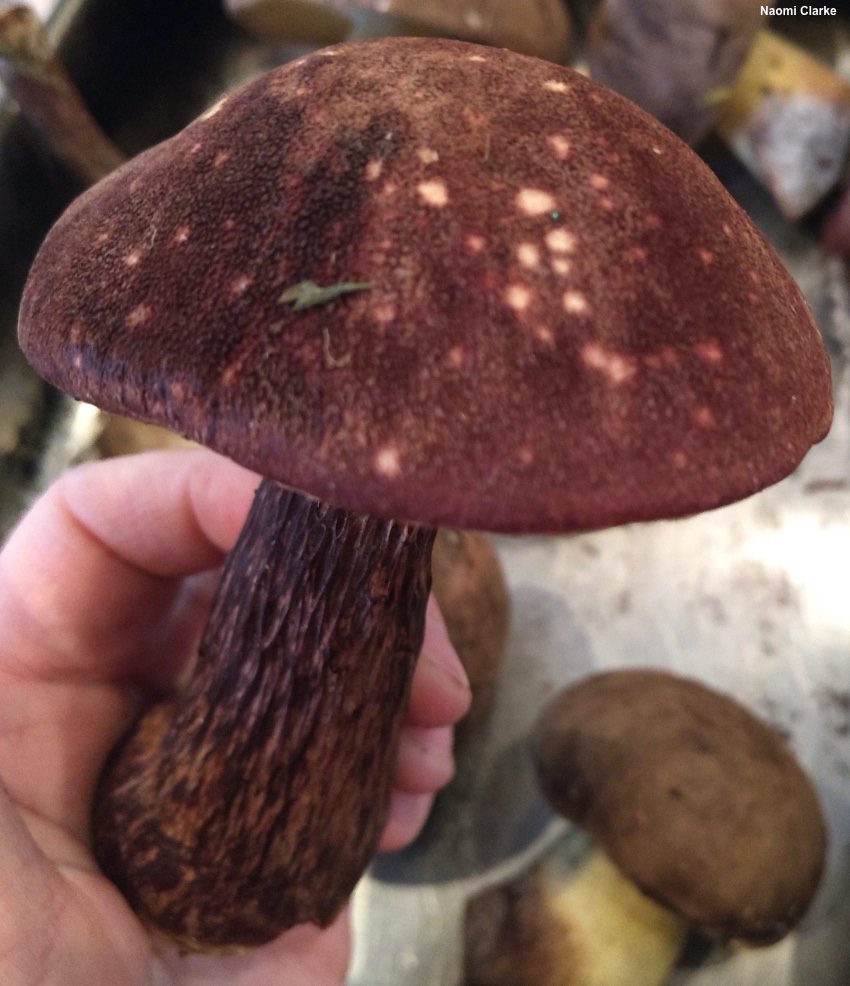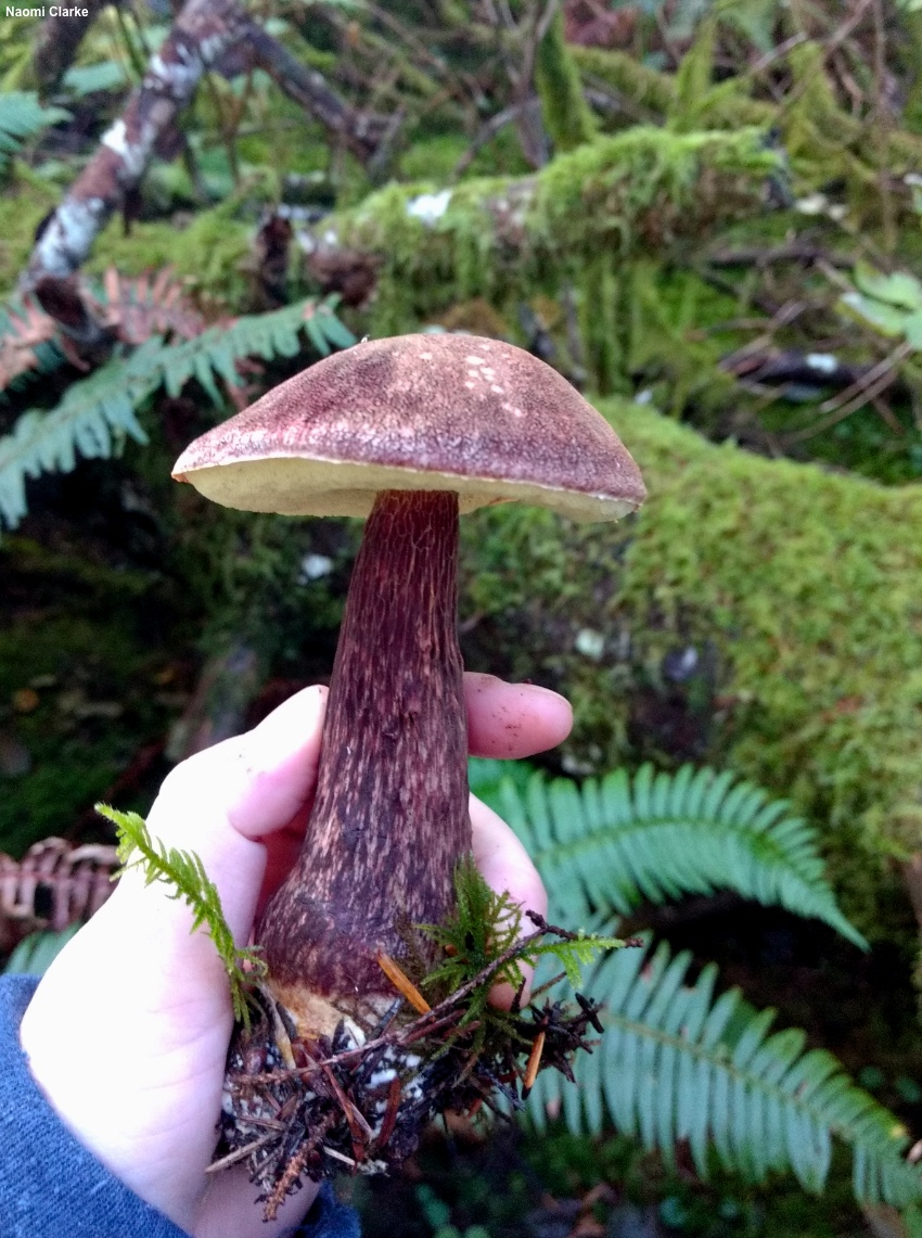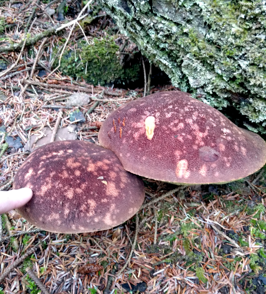 Aureoboletus mirabilis [ Basidiomycota > Boletales > Boletaceae > Aureoboletus . . . ] by Michael Kuo Aureoboletus mirabilis is a denizen of hemlock forests in the Pacific Northwest, from northern California to Alaska. Unlike most boletes it is usually found growing on or near well-decayed, moss-covered stumps. Its dark brown to dark reddish brown cap has a granular-felty texture; its yellow pore surface does not change color when bruised; and its gorgeous stem is dark brown streaked with paler areas, and usually coarsely reticulate near the apex. Under the microscope Aureoboletus mirabilis features large spores, long cystidia, and a trichoderm. Boletus mirabilis, Boletellus mirabilis, and Xerocomus mirabilis are synonyms. Thanks to Naomi Clarke for documenting, collecting, and preserving Aureoboletus mirabilis for study; her collection is deposited in The Herbarium of Michael Kuo. Description: Ecology: Mycorrhizal; associated with hemlocks; growing alone, scattered, or gregariously on well-decayed, mossy hemlock stumps and logs—or terrestrially in the vicinity of hemlock stumps; fall and winter; distributed from northern California to Alaska. The illustrated and described collection is from Oregon. Cap: 8–16 cm; convex, becoming broadly convex or slightly bell-shaped; dry; granular-felty, becoming finely scaly with age; brownish red to brownish purple; the margin with an overhanging, sterile portion. Pore Surface: Bright to dull yellow when young; becoming olive yellow as spores mature; not bruising; about 1 pore per mm at maturity; tubes to 2 cm deep. Stem: 7–10 cm long; 1.5–3 cm thick; club-shaped, especially when young; solid; yellow at apex but elsewhere dark brown to dark reddish brown, streaked with paler areas; not bruising; bald below and sometimes overall, but usually coarsely reticulate over the upper portion. Flesh: Whitish to pale yellowish; sometimes purplish under the cap cuticle; not staining on exposure. Odor and Taste: Not distinctive. Spore Print: Olive brown. Microscopic Features: Spores 16–22 x 6–8 µm; fusiform; smooth; golden in KOH. Basidia 4-sterigmate; about 40 x 12.5 µm; clavate. Hymenial cystidia 60–80 x 7.5–12.5 µm; cylindric to fusiform; smooth; thin-walled; hyaline in KOH. Pileipellis a trichoderm; elements 4–8 µm wide, smooth or slightly encrusted, hyaline to golden in KOH; terminal cells subclavate, or cylindric with rounded apices. REFERENCES: (Murrill, 1912) Halling, 2015. (Thiers, 1966; Snell & Dick, 1970; Smith & Thiers, 1971; Thiers, 1975; Smith, Smith & Weber, 1981; Arora, 1986; Phillips, 1991/2005; Both, 1993; Lincoff, 1992; Bessette, Roody & Bessette, 2000; Miller & Miller, 2006; Trudell & Ammirati, 2009; Wu et al., 2014; Desjardin, Wood & Stevens, 2015; Halling et al., 2015; Siegel & Schwarz, 2016.) Herb. Kuo 08091505. This site contains no information about the edibility or toxicity of mushrooms. |