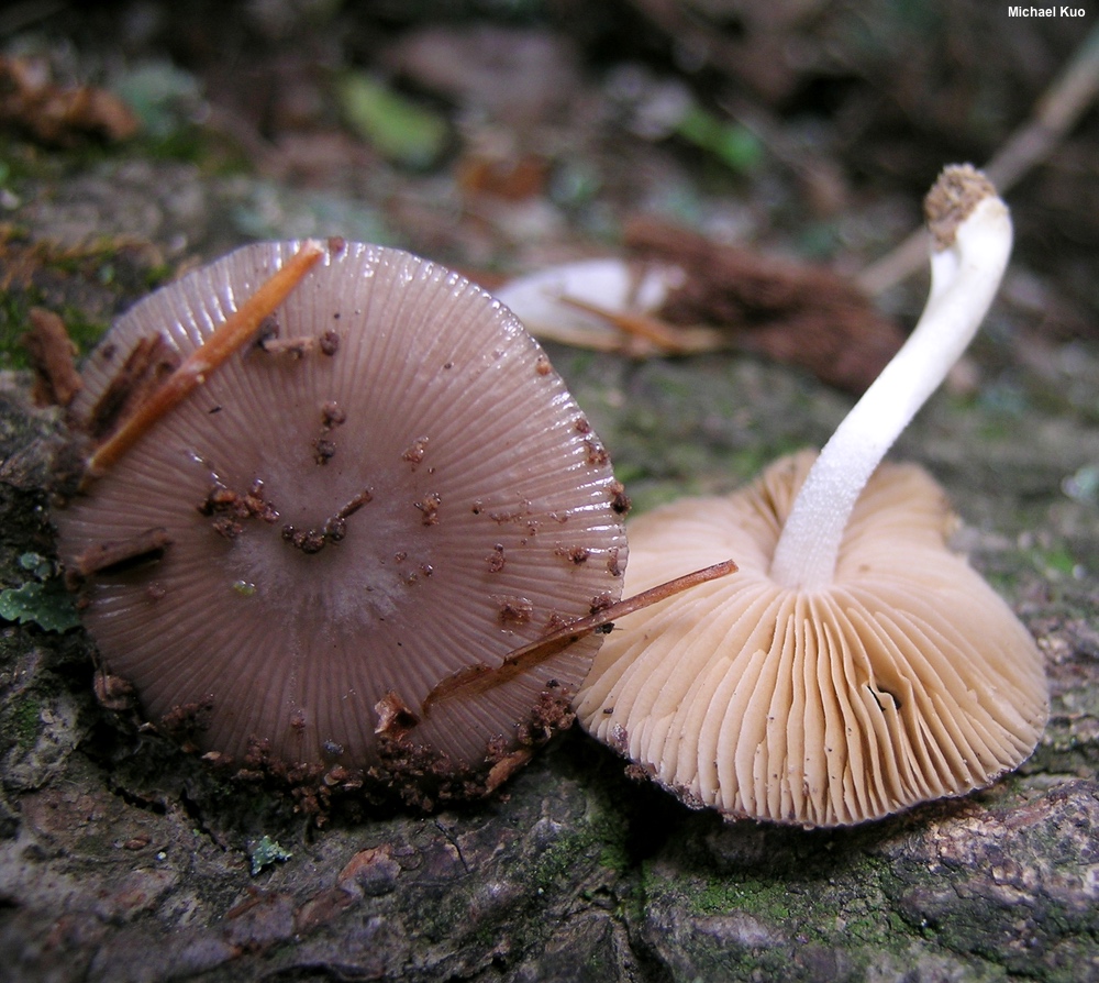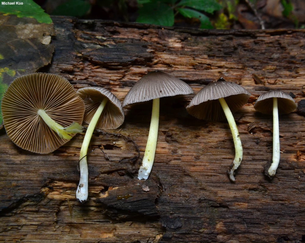 [ Basidiomycota > Agaricales > Bolbitiaceae > Bolbitius . . . ] Bolbitius reticulatus by Michael Kuo, 30 October 2023 Bolbitius reticulatus grows on wood or woody debris—including woodchips—in Europe and North America. Its cap is sticky, fragile, and deeply lined, and its spore print is cinnamon brown. Some forms are pale grayish, and are reminiscent of the dry-capped, pink-spored Pluteus longistriatus. Other forms are purple or lilac—and intermediate forms are collected with some frequency. To add to the confusion, both grayish and purple-brown forms sometimes develop a prominently veined-reticulate cap surface (hence the species epithet reticulatus). To reflect these substantial differences in features, varieties of Bolbitius reticulatus have been named over the years, including aleuriatus and pluteoides (sometimes these taxa are elevated to species rank), but recent DNA-based research supports using "a wide species concept for B. reticulatus, without subdividing it into traditionally accepted varieties and forms" (Malysheva et al. 2015, 12). Description: Ecology: Saprobic, decomposing the deadwood of hardwoods—decaying logs in woodland settings, and woodchips in urban settings; growing alone or scattered; summer and fall (and over winter in warm climates); originally described from Europe (Persoon 1789); widespread in Europe and in North America. The illustrated and described collections are from Illinois and Missouri. Cap: 1–3 cm; convex to broadly conic, becoming broadly bell-shaped to broadly convex and eventually nearly flat; fragile; gray to purple-gray or purple at first, becoming grayish tan to gray or lilac gray, often with a darker center; sticky when fresh; bald; strongly lined, often nearly all the way to the center. Gills: Free from the stem or very narrowly attached to it; close; short-gills frequent; whitish at first, becoming faintly pinkish to brownish, then cinnamon brown. Stem: 2.5–4 cm long; 1–3 mm thick; equal; fragile; hollowing; finely scaly to powdery, or more or less bald; white to yellowish or yellow. Flesh: Insubstantial; whitish; unchanging when sliced. Odor: Not distinctive. Chemical Reactions: KOH on cap surface negative. Spore Print: Dull cinnamon brown. Microscopic Features: Spores 9–11 x 4.5–5.5 µm; amygdaliform to subellipsoid, with a small pore; smooth; thick-walled; brown in KOH. Basidia abruptly clavate; 4-sterigmate. Brachybasidioles present. Cheilocystidia irregularly cylindric or subclavate; smooth; thin-walled; hyaline in KOH. Pleurocystidia not found. Pileipellis hymeniform; terminal cells clavate, obpyriform, or saccate; smooth; hyaline to brown in KOH. REFERENCES: (C. H. Persoon, 1798) A. Ricken, 1915. (Fries, 1821; Kauffman, 1918; Phillips, 1981; Watling, 1982; Arora, 1986; Schalkwijk-Barendsen, 1991; Hansen & Knudsen, 1992; Arnolds, 2005; McNeil, 2006; Miller & Miller, 2006; Buczacki et al., 2013; Kuo & Methven, 2014; Desjardin, Wood & Stevens, 2015; Malysheva et al., 2015; Siegel & Schwarz, 2016; Gminder & Böhning, 2017; Hausknecht & Vesterholt, 2018; Læssøe & Petersen, 2019; Kaygusuz, 2022.) Herb. Kuo 09121401. This site contains no information about the edibility or toxicity of mushrooms. |