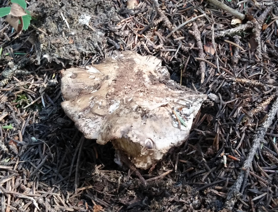 However, there is a serious error in logic involved with this statement. Yes, "the literature" in North America suggests the presence of Boletopsis leucomelaena--but it does not suggest that any random study of six poorly documented specimens from a continent 2500 miles wide, none of which was noted to occur under spruce, will fail to turn up a phylogenetic match with Boletopsis leucomelaena--a species the authors agree is exclusively associated with spruce. Only a thorough study of many well-documented collections, including ones noted by collectors to have occurred under spruce, could approach a conclusion about whether Boletopsis leucomelaena occurs in North America. Are you an enterprising mycology graduate student in need of a thesis project? This could be your ticket to fame and fortune! Description: Ecology: Mycorrhizal with spruces; growing alone, scattered, or gregariously; summer and fall; North American distribution uncertain, but possibly to be expected wherever spruces occur naturally. The illustrated and described collection is from a spruce forest in Colorado. Cap: 5-8 cm across; convex becoming planoconvex; dry; fairly bald; gray to dark gray or nearly black; sometimes somewhat mottled or streaked in appearance. Pore Surface: Running down the stem; creamy white, becoming slightly brownish with age; bruising slowly pinkish, then brownish; pores angular, 2-3 per mm; tubes 1-2 mm deep. Stem: 3-5 cm long; 1.5-2.5 cm thick; bald or, in age, finely scaly; colored like the cap, except at the whitish apex; tough; sometimes with orangish fuzz at the base. Flesh: Whitish; staining pinkish gray to lilac gray when sliced, especially near the cap margin. Odor and Taste: Odor not distinctive; taste not distinctive, or slightly bitter. Chemical Reactions: KOH on cap surface black. Spore Print: Pale yellowish brown. Microscopic Features: Spores 4-5 x 3-4 µ; angular and irregular in outline; nodulose; yellowish in KOH. Hyphal system monomitic. Pileipellis composed of tangled and interwoven, clamped hyphae 2.5-7.5 µ wide, brownish to hyaline in KOH, with infrequent swollen, pyriform terminal cells. REFERENCES: (Persoon, 1801) Fayod, 1889. (Fries, 1821; Saccardo, 1888; Breitenbach & Kränzlin, 1986; Niemelä & Saarenoksa, 1989; Stalpers, 1993; Watling & Milne, 2008.) Herb. Kuo 08231405. Note: Since the illustrated collection consists of a single fruiting body, additional size dimensions and macromorphological data have been taken from Niemelä & Saarenoksa (1989). Thanks to Hoa Pham for collecting, documenting, and preserving the illustrated specimen, which is deposited in The Herbarium of Michael Kuo. This site contains no information about the edibility or toxicity of mushrooms. |