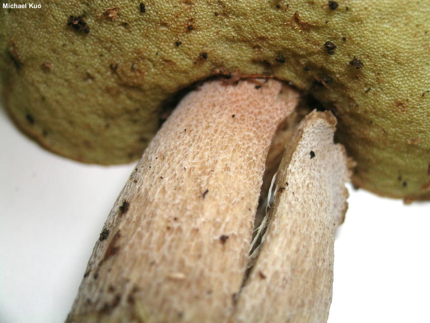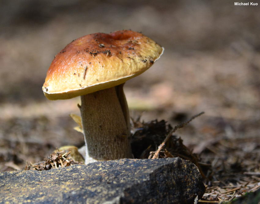 Boletus cf. edulis [ Basidiomycota > Boletales > Boletaceae > Boletus . . . ] by Michael Kuo No, "cf" doesn't stand for "chicken fried," even though I am writing this in the Midwest (where, for the uninitiated, we actually have a popular meal called "chicken fried steak"). It's a mycological convention that abbreviates a Latin verb for "compare" (conferre) Maybe it's Boletus edulis, the well-known, classic European species. Like the European mushroom, our eastern North American version has a tacky, bald cap—and, like the European species, it is usually found under spruces (especially Norway spruce, which is a European import), though it is occasionally found under other conifers or even hardwoods. The cap color, however, is consistently what I would call "orangish brown" or "cinnamon," while the European species is simply brown. For examples of the color difference, compare the photos and drawings here and on the Boletus edulis page. A throng of roughly similar North American species constitutes the North American Boletus edulis group , but most are fairly easily separated from the mushroom described here on the basis of geography and/or physical features.Description: Ecology: Mycorrhizal with conifers, especially spruces (especially Norway spruce), and, reportedly, occasionally with hardwoods; growing alone, scattered, or gregariously; summer and fall; distribution uncertain, but possibly limited to northeastern North America. In my area (central Illinois), I have never found the mushroom I am describing here; I have seen it only in Pennsylvania and in northern Michigan. The illustrated mushrooms are from Pennsylvania and Québec. Cap: 6–10 cm; convex in the button stage, becoming broadly convex to nearly flat; greasy to sticky when fresh; bald; light to dark orangish brown; often somewhat paler toward the margin. Pore Surface: Whitish and "stuffed" at first; becoming pale yellow and eventually olive yellow; not bruising; at maturity with 2–3 round pores per mm; tubes to 2 cm deep. Stem: 5–10 cm long; 2–3 cm thick; usually swollen and club-shaped when young, becoming club-shaped to more or less equal; finely reticulate over at least the upper portion; white to brownish areas. Flesh: White; firm; unchanging when sliced. Odor and Taste: Pleasant, but not distinctive. Chemical Reactions: Ammonia negative on cap surface; bluish, then purplish, then whitish with a purplish ring on flesh. KOH negative on cap surface; dull orange on flesh. Iron salts negative on cap surface; negative on flesh. Spore Print: Olive. Microscopic Features: Spores 12–19 x 4–5 µm; fusiform; smooth; ochraceous in KOH. Pleurocystidia 35–45 x 5–7.5 µm; narrowly fusoid-ventricose; hyaline; smooth; thin-walled; inconspicuous. Pileipellis an ixocutis with transitions to an ixotrichoderm; hyaline in KOH; elements 4–7.5 µm wide, smooth; exserted terminal cells subclavate or cylindric with rounded apices. REFERENCES: (Coker & Beers, 1943; Snell & Dick, 1970; Smith & Thiers, 1971; Grund & Harrison, 1976; Smith, Smith & Weber, 1981; Phillips, 1991/2005; Lincoff, 1992; Both, 1993; Barron, 1999; Roody, 2003; McNeil, 2006; Miller & Miller, 2006; Kuo, 2007.) Herb. Kuo 07221412. This site contains no information about the edibility or toxicity of mushrooms. |