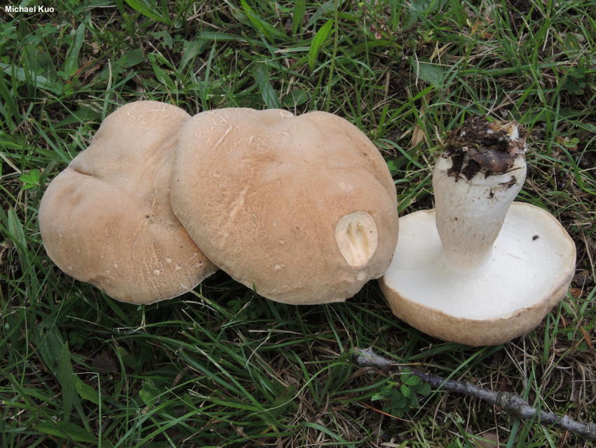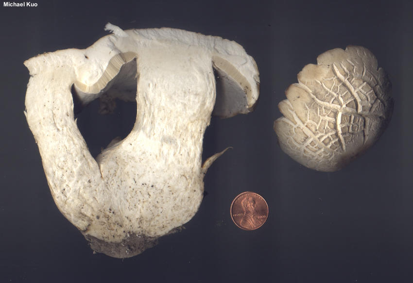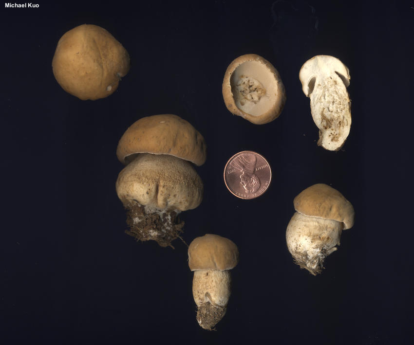 Boletus cf. reticulatus [ Basidiomycota > Boletales > Boletaceae > Boletus . . . ] by Michael Kuo This eastern member of the Boletus edulis group is one of only a few in the group occurring under eastern hardwoods in the summer. The others include Boletus atkinsonii, with a yellowish brown cap that turns purple with ammonia, and Boletus separans, with a liver red cap (when young, at least) that turns green with ammonia. Boletus cf. reticulatus, by contrast, has a pale to dark brown cap that turns a boring orangish tan with ammonia. I am using the mycological convention "cf" (explained here) because the mushroom I'm describing is very similar to Europe's oak-loving summer edulis-like species, Boletus reticulatus (also known as Boletus aestivalis)--but it may well be different, since it occurs on another continent. In fact a preliminary DNA study of this mushroom by Swedish and British scientists in 2004 (unpublished) indicated genetic affinity—but not conspecificity—with European Boletus reticulatus/aestivalis collections for the species illustrated here. I find the illustrated species regularly in central Illinois, under oak and hickory, from late May to August. In one location it reappears consistently each summer, and has done so regularly over a period of about ten years. In dry years, one or two will appear; in wet years I have collected many. Several eastern North American authors describe a very similar, summer fruiting, hardwood-loving species—as Boletus reticulatus (Bessette, Roody & Bessette, 2000) and as Boletus edulis subsp. reticulatus (Snell & Dick, 1970). These descriptions agree with the mushroom described here in most respects, but involve much darker browns on the cap and stem. Description: Ecology: Apparently mycorrhizal with oaks, especially white oak; growing scattered or gregariously (occasionally clustered); late May to August; Douglas and Lawrence Counties, Illinois. Cap: 7–18 cm, convex in the button stage, expanding to broadly convex in age; dry; with the texture of well-worn leather; more or less smooth, but often breaking up and developing deep and prominent cracks; whitish to pale brown, becoming brownish to pale brown or yellow-brown in age; not bruising or discoloring; the margin inrolled when young, splitting with age, typically without a sterile projection. Pore Surface: Whitish to dirty gray when young; becoming pale buff, then olive, then brownish; young pore surface bruising ochraceous to brownish (a sort of watery and darker version of the pore surface color) and older surfaces bruising brownish or not bruising; the pores "stuffed" until the mushroom is quite old; tubes colored like the pore surface, extending to 12 mm deep; eventually receding from the stem. Stem: 4–10 cm long; 2–4 cm. thick; swollen and club-shaped when young, becoming club-shaped or more or less equal; finely reticulate (over the whole stem or, more often, only near the apex); the reticulation typically white but occasionally brownish; often developing fissures and "peeling" sections; whitish; sometimes appearing to stain brownish when handled; solid. Flesh: White; thick throughout; not staining on exposure. Odor and Taste: Pleasant, but not distinctive. Chemical Reactions: Ammonia negative to orangish tan on cap surface; negative on flesh. KOH negative to orangish tan on cap surface; negative on flesh. Iron salts negative on cap surface; negative on flesh. Spore Print: Olive brown. Microscopic Features: Spores 10-15 x 3-4.5 µm; smooth; subfusiform. Pileipellis a collapsing trichoderm; elements 2.5–7.5 µm wide, smooth, yellowish in KOH; terminal cells cylindric with rounded to subacute apices. REFERENCES: (Saccardo, 1888; Snell & Dick, 1970; Breitenbach & Kränzlin, 1991; Hansen & Knudsen, 1992; Bessette, Roody & Bessette, 2000; Kuo, 2007 ["Boletus sp."]; Kuo & Methven, 2014.) Herb. Kuo 06269601, 06210201, 07220319, 05250402. This site contains no information about the edibility or toxicity of mushrooms. |