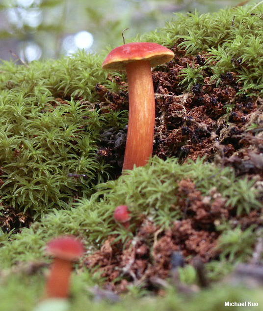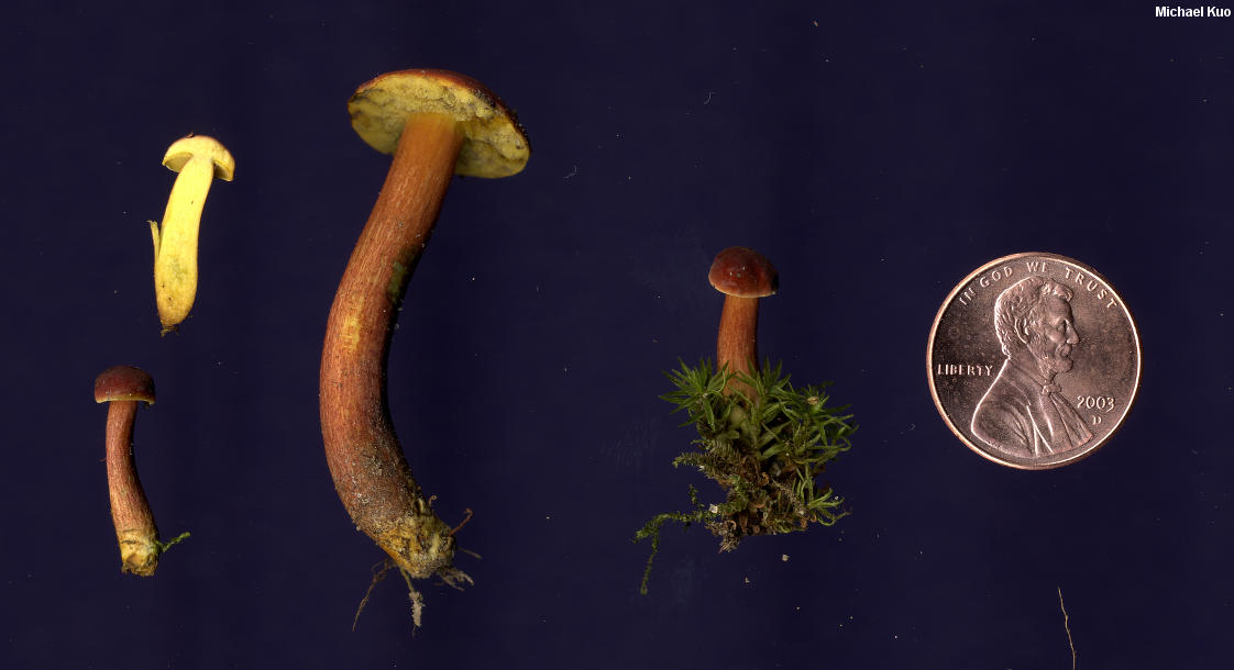 Boletus cokeri [ Basidiomycota > Boletales > Boletaceae > Boletus . . . ] by Michael Kuo Maybe this species is a silly idea. Described from North Carolina in 1943 by Coker and Beers (as "Boletus parvulus"; see note below), its major distinguishing feature is its tiny size; Coker and Beers called it "the smallest Boletus we know." The largest caps of Boletus cokeri are about 2 cm across; other red-capped, blue-staining boletes are either a step or two larger (Boletus harrisonii and ilk, with caps 2-6 cm across) or much larger (Boletus bicolor, for example, with caps up to 15 cm or more across). Boletus cokeri features a stem that is red nearly to the apex, which also helps to separate it, along with flesh that stains blue, then reddish--and a cap surface that turns fleetingly dark gray to black when a drop of KOH is applied. So I'm going there, at least tentatively . . . but if you don't want to come along, I will understand. My sole collection was made in a hardwood forest in Illinois, in moss, and if it weren't for the red stem I would likely have assigned it to Boletus harrisonii, as a miniature version, since microscopic features match that species well. Using the generic concepts of Šutara (2008), Boletus cokeri should probably be placed in Xerocomellus. "Boletus parvulus" was the name this species was originally given by Coker and Beers (1943). However, since the authors did not realize that Boletus parvulus was already a species (named by Massee in 1909) the mushroom was given the new name of Boletus cokeri later in the same year (House, 1943). Description: Ecology: Mycorrhizal with hardwoods; growing gregariously in woods; summer; distribution uncertain. The illustrated and described collection is from Illinois. Cap: Minute to 2 cm across; convex, becoming broadly convex; dry; finely velvety; deep red; the margin yellowish when young. Pore Surface: Bright yellow at first, becoming dull olive yellow; bruising blue and then, over time, orangish to brown; with 2-3 angular pores per mm; tubes 1-2 mm deep. Stem: 2-4 cm long; up to 0.5 cm thick; more or less equal; bald; yellow at the apex; colored like the cap overall, but slightly paler; not reticulate; basal mycelium yellow. Flesh: Yellow; staining faintly greenish blue when sliced, then slowly pinkish red. Odor and Taste: Not distinctive. Chemical Reactions: Ammonia negative on cap surface; negative on flesh. KOH fleetingly dark gray to black on cap surface; rusty orange on flesh. Iron salts negative on cap surface; gray on flesh. Spore Print: Not documented. Microscopic Features: Spores 10-12 x 4-5 µ; subfusiform; smooth; yellow in KOH. Pileipellis a collapsing trichoderm of elements 5-7.5 µ wide; terminal cells often inflated and/or cystidioid; yellow in KOH. REFERENCES: (Coker & Beers, 1943) House, 1943. (Both, 1993.) Herb. Kuo 06150301. This site contains no information about the edibility or toxicity of mushrooms. |