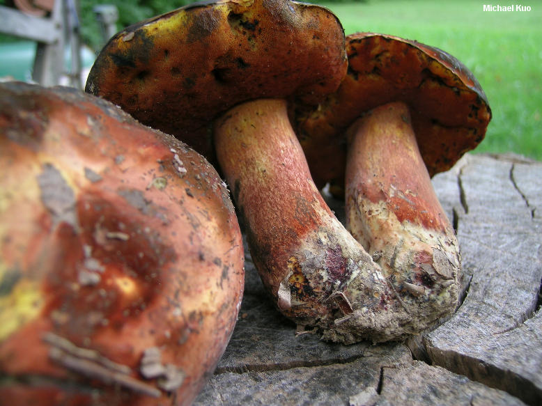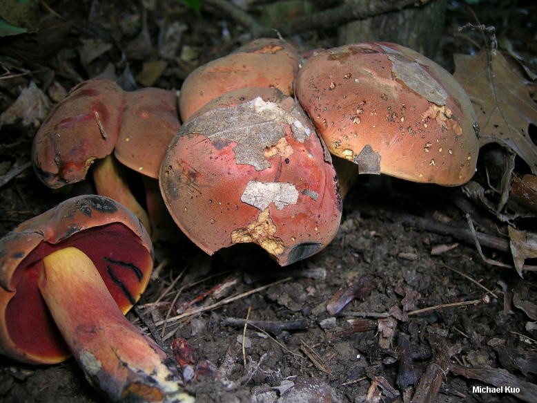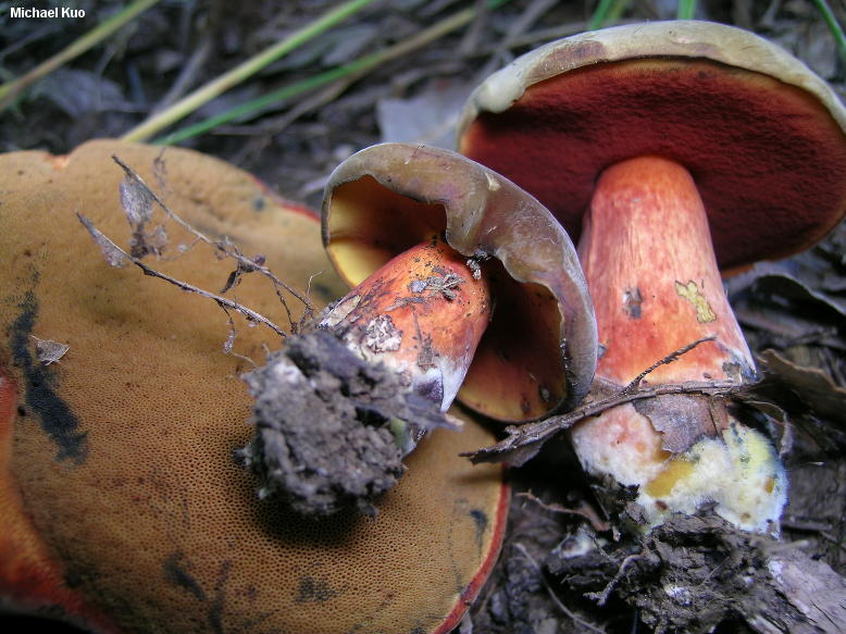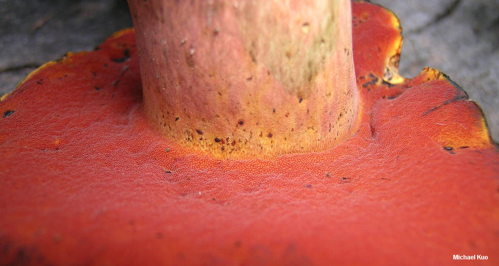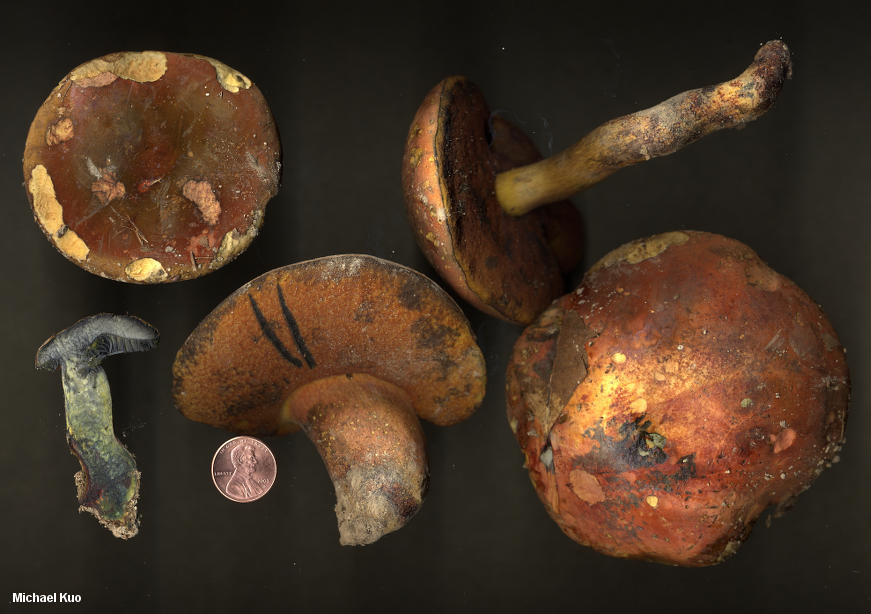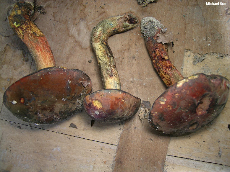 Boletus subluridellus [ Basidiomycota > Boletales > Boletinae > Boletaceae > Boletus . . . ] by Michael Kuo This red-pored, oak-loving bolete features a deep red to brownish red cap that is initially covered with a thin layer of brownish fuzz. At first, the cap surface has a resinous feel to it--but by maturity it feels soft and leathery. When fresh the cap bruises dark violet, rather than blue--and the stem is yellow underneath a healthy coating of red. Microscopic features, which should be confirmed for positive identification, include elongated caulocystidia and pileipellis elements that turn red in Melzer's reagent. Description: Ecology: Mycorrhizal with oaks; growing alone, scattered, or gregariously; summer; possibly widely distributed east of the Great Plains. Cap: 4-13 cm across; convex, becoming broadly convex; dry; finely velvety when young, with a resinous feel; sometimes becoming more or less bald by maturity; brownish red to orangish red, with a thin layer of brownish to olive brown fuzz that can be rubbed away; sometimes with mottled yellow and red shades; when fresh bruising deep violet, then slowly blackish; margin at first inrolled and yellowish, with a narrow sterile overhang. Pore Surface: Initially dark orangish red; fading to orange; bruising promptly dark blue or nearly black; 3-4 round pores per mm; tubes to 1 cm deep. Stem: 4-10 cm long; 1-1.5 cm thick; more or less equal; often curved near the base; not reticulate; yellow, coated with red, especially toward the base; bruising blue; basal mycelium whitish to yellow, bruising dark red. Flesh: Yellow in the cap; darker yellow in the stem; promptly bluing when sliced. Odor and Taste: Not distinctive. Chemical Reactions: Ammonia negative on cap surface; orangish on flesh. KOH orange to red on cap surface; orange on flesh. Iron salts negative on cap surface; negative on flesh. Spore Print: Olive. Microscopic Features: Spores 9-15 x 3.5-4.5 µ; smooth; fusiform; yellow in KOH. Hymenial cystidia inconspicuous; yellow in KOH; widely fusiform; to about 50 µ long. Pileipellis a tightly packed trichoderm of hyphae 2.5-5 µ wide; yellowish to yellow in KOH; terminal elements cylindric with rounded apices, or aciculate, with subacute apices. Some pileipellis and subcuticular elements pinkish red in Melzer's reagent. Caulocystidia of two types: fusoid-ventricose, yellow in KOH, 25-25 µ long; or fusiform to fusoid-ventricose with an extended mucro, to 100+ µ long. REFERENCES: Smith & Thiers, 1971. (Smith, Smith & Weber, 1981; Phillips, 1991/2005; Bessette, Roody & Bessette, 2000; Roody, 2003; Binion et al., 2008.) Herb. Kuo 07250305, 07060705, 07140807. This site contains no information about the edibility or toxicity of mushrooms. |