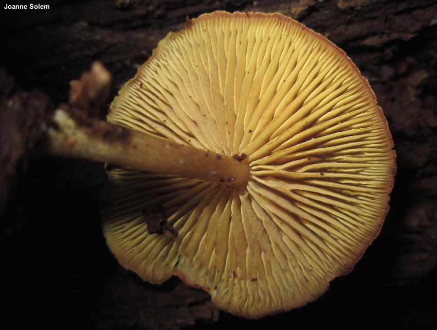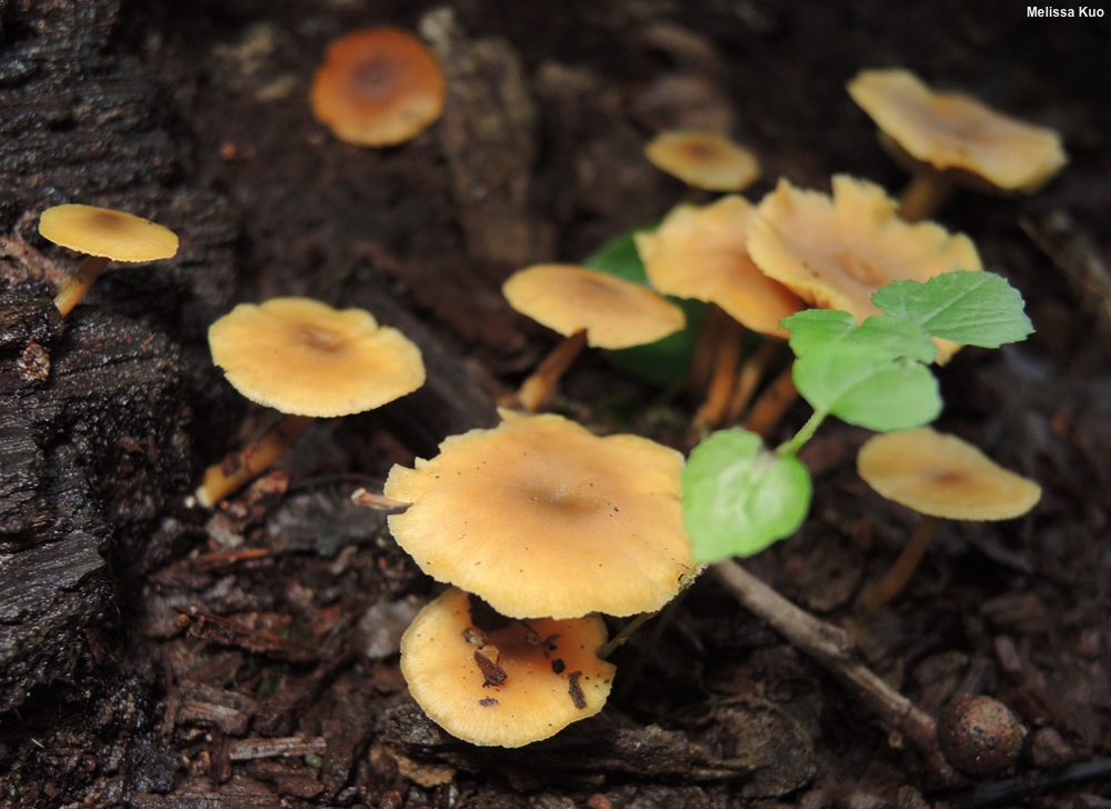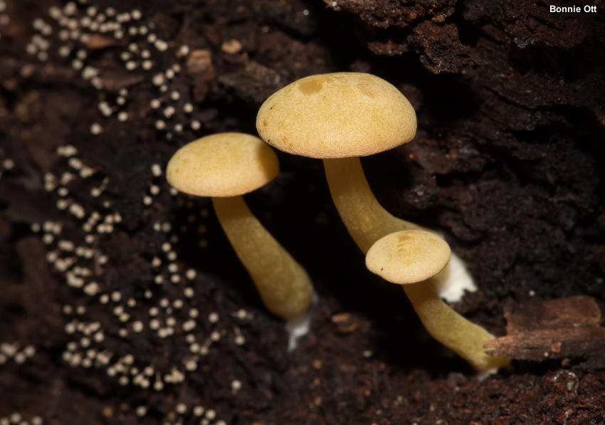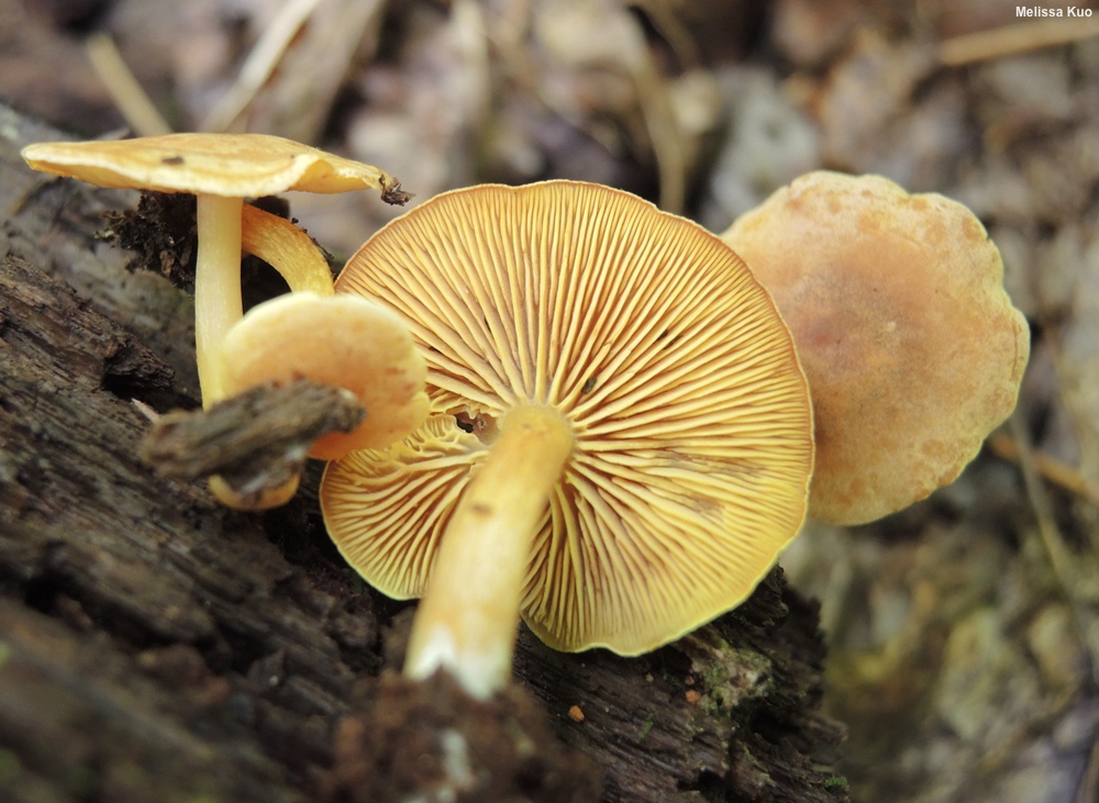 [ Basidiomycota > Agaricales > Callistosporiaceae > Callistosporium . . . ] Callistosporium luteo-olivaceum by Michael Kuo, 10 May 2025 This little mushroom is a decomposer of deadwood—primarily the wood of conifers. It has a golden yellow to olive yellow cap, yellow gills, and a white spore print. Ho-hum. Truth be told, Callistosporium luteo-olivaceum is pretty boring, though it becomes slightly more interesting with the application of KOH (its cap turns purplish red) or under the microscope, where its tissues turn purple in KOH. Tricholomopsis decora and Tricholomopsis sulphureoides can look similar, and also turn red with KOH (despite at least one erroneous report in a field guide). But these species have scaly to fibrillose caps (at least, when fresh), mild taste, and several important microscopic differences. Xeromphalina tenuipes is also similar, and also turns red in KOH. However, it is found on the wood of hardwoods and features tough, nearly rubbery flesh, and a dark stem that becomes finely granular-scaly when it dries; microscopic features also separate it. Callistosporium graminicolor, separated by Lennox (1979) and re-affirmed as a phylogenetic species (Vizzini et al. 2020), differs in its longer spores (6–8 µm long) and smaller fruiting bodies; it is found in the Pacific Northwest. In 2020 researchers (Vizzini et al.) noted three phylogenetically separated groups within the collections of Callistosporium luteo-olivaceum they studied, representing North American, European and Asian collections. The authors designated these groups as "lineages" within a single species, but held out the possibility that future inquiries may separate species—in which case the North American species would retain the name luteo-olivaceum, since the original description (Berkeley & Curtis 1859) was from the northeastern United States. Thanks to Joanne and Bob Solem for collecting, documenting, and preserving Callistosporium luteo-olivaceum for study; their collection is deposited in The Herbarium of Michael Kuo. Description: Ecology: Saprobic on well-decayed deadwood of conifers—occasionally on wood so far decayed that the mushrooms appear terrestrial, and sometimes on buried wood; usually growing gregariously; summer, fall, and winter (in warm climates); originally described from "New England" (Berkeley & Curtis 1859); widely distributed in North America and in Europe; reported from Central America, the Caribbean, South America, eastern Asia, and Oceania. The illustrated and described collections are from Illinois, Maryland, and North Carolina. Cap: 1–4 cm; convex, becoming planoconvex, broadly bell-shaped, or flat; bald or, when young, sometimes with a hoary or frosty appearance; moist when fresh; dull golden yellow; hygrophanous, changing color to yellowish buff, creating a two-toned appearance; the margin not lined, or only faintly so at maturity. Gills: Broadly attached to the stem, sometimes by means of a notch; close; short-gills frequent; usually yellow or pale yellow, but sometimes whitish. Stem: 2–4 cm long; 2–3 mm thick; when young finely dusted overall, becoming bald over the upper half or overall with age; hollowing; colored like the cap; basal mycelium white. Flesh: Thin; insubstantial; yellowish or whitish. Odor and Taste: Odor not distinctive, or a little fragrant; taste bitter. Chemical Reactions: KOH on cap surface purple to purplish red. Spore Print: White. Microscopic Features: Many tissues purple to purple-red when mounted in KOH. Spores 3–5 x 2–4 µm; ellipsoid; smooth; with an apiculus; inamyloid; hyaline and uniguttulate in KOH when fresh, and when free floating in mounts of dried material—but containing purple inclusions when in contact with the hymenium or other tissues in dried specimens. Lamellar trama parallel. Basidia 20–25 x 4–6 µm; clavate; 4-spored; some developing purple inclusions in a KOH mount. Pleurocystidia not found. Cheilocystidia not found. Pileipellis a cutis of elements 3–5 µm wide, with pileocystidia (especially in young specimens) that feature clavate to subclavate apieces and refractive-ochraceous contents in KOH. Clamp connections not found. REFERENCES: (M. J. Berkeley & M. A. Curtis, 1859) R. Singer, 1946. (Lennox, 1979; Redhead, 1982; Arora, 1986; Noordeloos, 1995; Gándara & Guzmán, 2006; Miller & Miller, 2006; Roberts, 2009; Trudell & Ammirati, 2009; Kuo & Methven, 2014; Jančovičová et al., 2016; Siegel & Schwarz, 2016; Vesterholt & Holec, 2018; Læssøe & Petersen, 2019; Kibby, 2020; Vizzini et al., 2020.) Herb. Kuo 08290202, 07250401, 10010501, 06301601, 08271603, 08111907. This website contains no information about the edibility or toxicity of mushrooms. |
