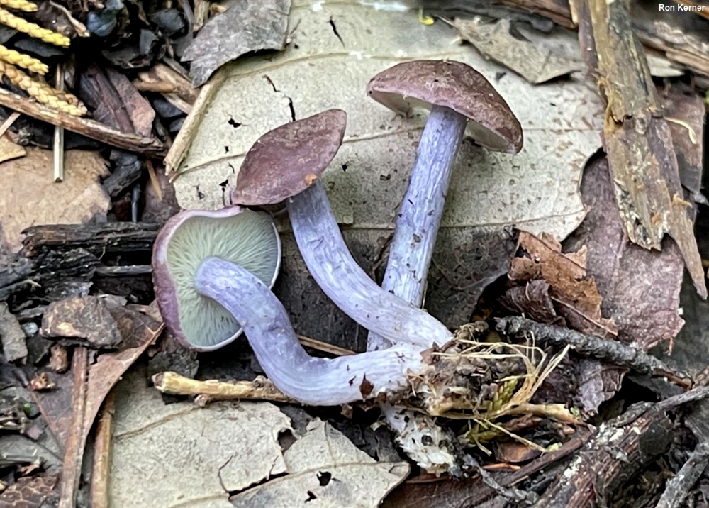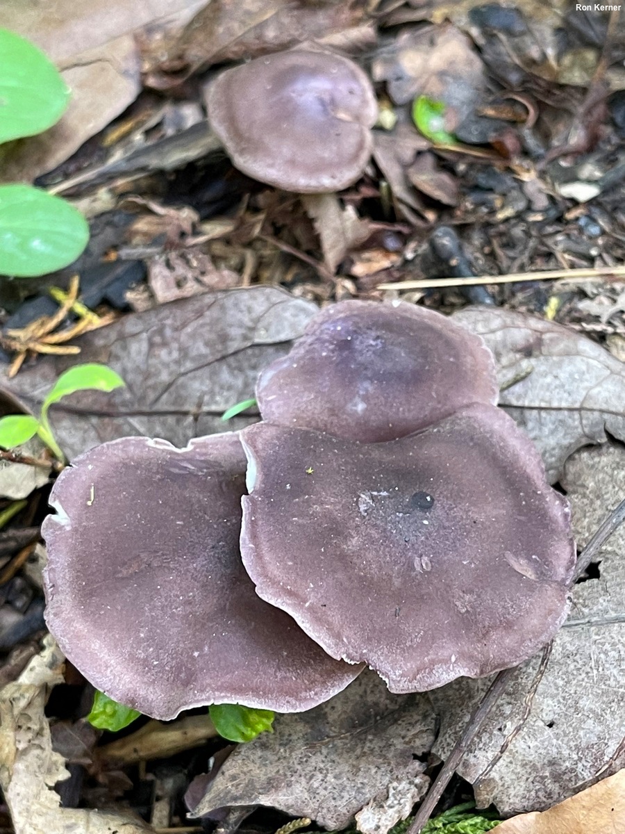 Calocybe ionides [ Basidiomycota > Agaricales > Lyophyllaceae > Calocybe . . . ] by Michael Kuo Here is a beautifully dusky purple, hardwood-loving mushroom, originally described from Europe but also found across North America. The gills are white, which helps to separate Calocybe ionides from Calocybe onychina, which features yellow gills and appears under conifers. The odor of Calocybe ionides is strongly mealy, according to European literature—but North American collections appear to vary. Alexander Smith (1941, 1944) thought that the mealy odor was not typical for North American collections, and named a variety, Tricholoma ionides farinaceum, to account for mealy collections. Rugosomyces ionides and Tricholoma ionides are synonyms. Thanks to Ron Kerner for collecting, documenting, and preserving Calocybe ionides for study; his collection is deposited in The Herbarium of Michael Kuo. Description: Ecology: Probably saprobic; growing alone, scattered, or gregariously under hardwoods; summer and fall; originally described from France; widespread in Europe; apparently widely distributed in North America. The illustrated and described collection is from Indiana. Cap: 2–6 cm; broadly convex becoming broadly bell-shaped or nearly flat; dry; very finely scurfy, or more or less bald; purple to brownish purple or brownish lilac. Gills: Broadly attached to the stem or attached by means of a notch; close or crowded; short-gills frequent; white to cream colored. Stem: 3–7 cm long; up to 1 cm wide; more or less equal; dry; fairly bald; purple to lilac; basal mycelium white. Flesh: Whitish; not changing when sliced. Odor & Taste: Mealy, or not distinctive. Chemical Reactions: KOH gray on cap surface.Spore Print: White. Microscopic Features: Spores 4.5–5 x 2.5–3 µm; ellipsoid; smooth; hyaline in KOH; inamyloid. Basidia 18–25 x 4–5 µm; 4-sterigmate. Hymenial cystidia not found. Lamellar trama subparallel. Pileipellis a trichoderm; hyaline in KOH; terminal cells cylindric with rounded or subclavate apices, 5–10 µm wide. Clamp connections present. REFERENCES: (J. B. F. Bulliard, 1792) M. A. Donk, 1962. (Smith, 1941; Smith, 1944; Singer, 1978; Moser, 1983; Breitenbach & Kränzlin, 1991; Nonis, 2007; Buczacki et al., 2013; Hofstetter et al., 2014; Bellanger et al., 2015; Gminder & Böhning, 2017; Kalamees, 2018; Læssøe & Petersen, 2019; Kibby, 2020.) Herb. Kuo 05232201. This site contains no information about the edibility or toxicity of mushrooms. |