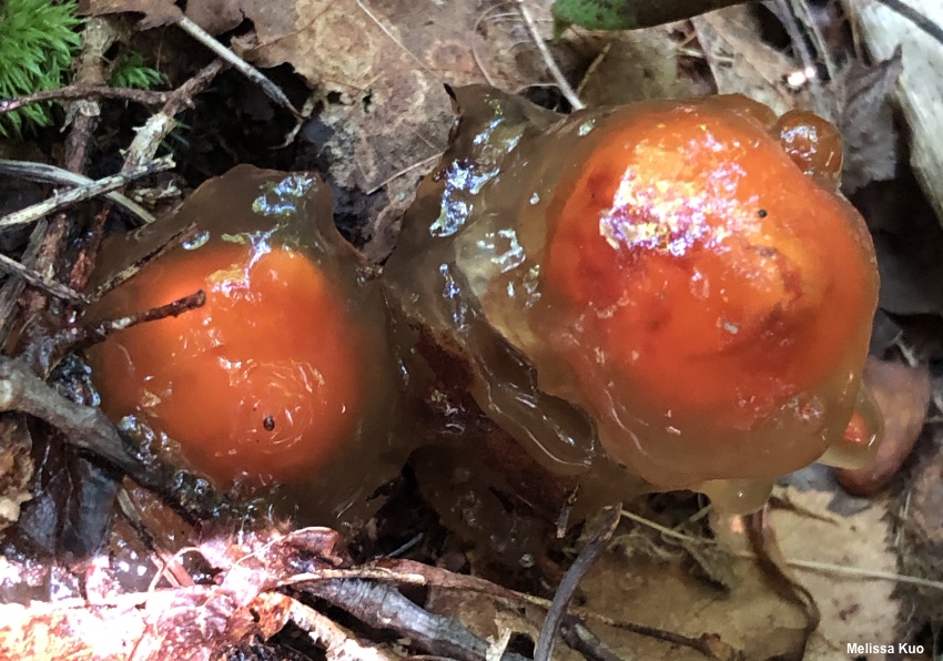 Calostoma cinnabarinum [ Basidiomycota > Boletales > Sclerodermataceae > Calostoma . . . ] by Michael Kuo Readers who are used to my admonitions against identifying mushrooms by comparing them to photographs may be surprised to hear me say that Calostoma cinnabarinum is probably an exception. Roger Phillips (1991/2005) calls Calostoma cinnabarinum the "stalked puffball-in-aspic," which is a very apt description of this beautifully disgusting fungus, since it sheds gelatinous red chunks that slide down its stem and surround it. DNA research has located the genus Calostoma within the bolete order, along with some other rather strange bedfellows—and Wilson and collaborators (2007) used isotopic, molecular, and morphological analysis to demonstrate that Calostoma cinnabarinum is mycorrhizal (like boletes), rather than saprobic as had previously been assumed. Calostoma lutescens has a yellow (rather than red) spore case, a longer stem, a "collar" under the spore case, and round, pitted spores; Calostoma ravenelii has a yellowish spore case with no collar, and ellipsoid spores. Both of these species lack the gelatinous covering. "Calostoma cinnabarina" is a Latin error found in some sources. Thanks to Sherwood Forest Friends for facilitating collection of specimens. Description: Ecology: Mycorrhizal with oaks; growing alone or gregariously, often in moss beds or in low-lying, wet areas; spring through fall; eastern North America, Texas, and perhaps in the Southwest; also Central America and South America, and reported from Asia; apparently more common at higher elevations within its range. The illustrated and described collections are from North Carolina. Fruiting Body: A spore case sitting atop a stem structure; at first covered with a thick, gelatinous covering that sloughs away, slides down the stem, and then surrounds the stem base until drying up and disappearing. Spore case 11–25 mm wide; 11–25 mm high; subglobose; cinnabar red when young and fresh, fading to reddish orange; apex developing a bright red, ridged peristome that looks a bit like a stitched scar; at first covered with gelatin but dry and finely dusted after the gelatin sloughs away; interior filled with whitish to yellowish spore dust. Stem structure 2–5 cm high; 1–2.5 cm wide; composed of tightly wound cords; soft; dull orangish. Microscopic Features: Spores 10–19 x 6–10 µm; ellipsoid; finely punctate; walls about 0.5 µm thick; uniguttulate (occasionally biguttulate) and hyaline in KOH. Capillitial threads 4–6 µm wide; walls to 1 µm thick; hyaline in KOH; clamped. REFERENCES: Corda, 1809. (Saccardo, 1888; Reed, 1910; Coker & Couch, 1928; Smith, Smith & Weber, 1981; Castro-Mendoza et al., 1983; Weber & Smith, 1985; Arora, 1986; Phillips, 1991/2005; Lincoff, 1992; Metzler & Metzler, 1992; Hughey et al., 2000; Roody, 2003; Calonge at al., 2005; Miller & Miller, 2006; Basaeia et al., 2007; Wilson et al., 2007; Kuo & Methven, 2010; Trierveiler-Pereira et al., 2013; Baroni, 2017; Woehrel & Light, 2017; Elliott & Stephenson, 2018.) Herb. Kuo 08091912, 08091913. This site contains no information about the edibility or toxicity of mushrooms. |