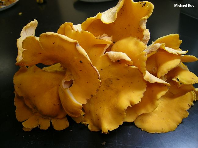 Cantharellus confluens [ Basidiomycota > Cantharellales > Cantharellaceae > Cantharellus . . . ] by Michael Kuo If you want to tell me this species is dubiously separated from Cantharellus lateritius, I won't argue with you--much. Virtually the only feature distinguishing the two species is the fact that in Cantharellus confluens, as the name suggests, the mushrooms are often confluent; stems give rise to more than one cap-like structure. In Cantharellus lateritius this does not usually happen. Both species have a smooth to wrinkled undersurface, and microscopic features are virtually identical. To my knowledge no DNA study has been published in which Cantharellus confluens is considered. Description: Ecology: Mycorrhizal with hardwoods; growing alone, scattered, or gregariously; summer; southern Appalachians, southeastern United States, and Mexico. The illustrated and described collection is from Ohio.Fruiting Body: Up to 10 cm high and 8 cm across; usually with two to several cap-like structures arising from one or more individual or conjoined stem structures. Individual Caps: Flat, becoming centrally depressed but without developing a perforated disc; fleshy; bald or nearly so; dry; orangish yellow; the margin fairly thick, becoming wavy to lobed or irregular. Undersurface: Running down the stem; smooth or with shallow wrinkles or, near the margin, somewhat veined; colored like the cap or paler; bruising and staining dark yellow. Stem: Up to 4 cm long and 2.5 cm thick; tapering to the base; dry; colored like the cap or paler; fleshy (not hollow); bruising and staining dark yellow. Flesh: Whitish; soft; unchanging when sliced. Odor and Taste: Taste not distinctive; odor fragrant and sweet. Spore Print: Pale yellow. Microscopic Features: Spores 7-9 x 4-5 µ; ellipsoid; smooth; inamyloid; ochraceous in KOH; often uniguttulate. Basidia to about REFERENCES: (Berkeley & Curtis, 1866) Petersen, 1979. (Saccardo, 1888; Smith, 1968 [as lateritius?]; Petersen, 1979b; Weber & Smith, 1985.) Herb. Kuo 07171005. This site contains no information about the edibility or toxicity of mushrooms. |