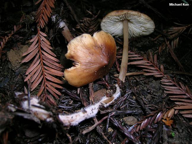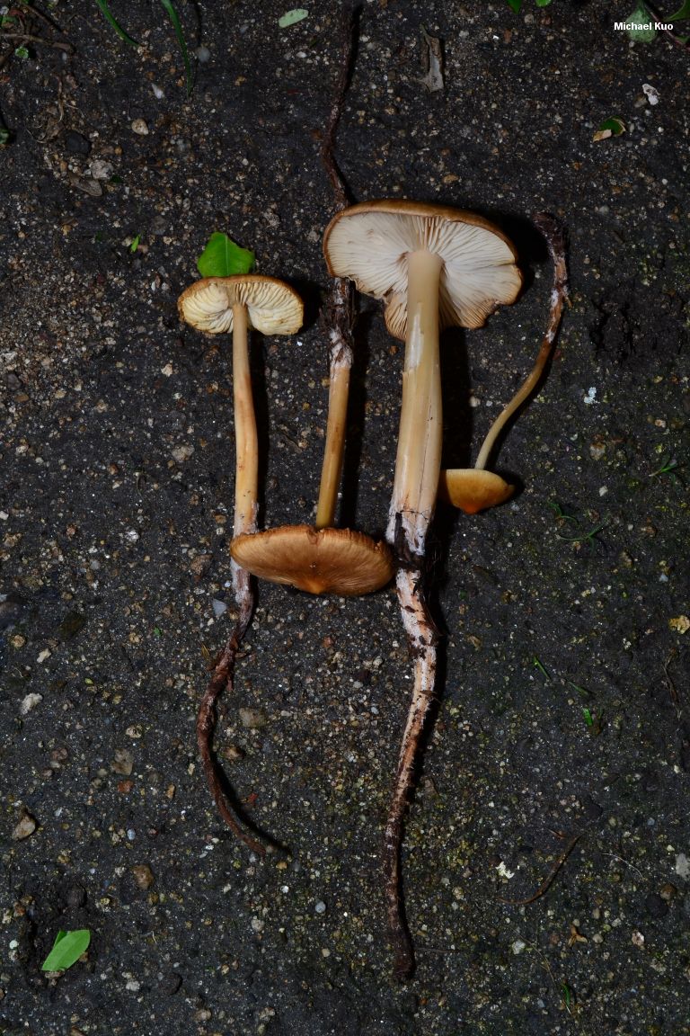Caulorhiza umbonata [ Basidiomycetes > Agaricales > Tricholomataceae > Caulorhiza . . . ] by Michael Kuo Like Stropharia ambigua, Caulorhiza umbonata is a "tourist mushroom," thrilling to those of us who live outside of northern California, but thoroughly ho-hum-ish to the natives. I suppose the mushroom itself would get boring after long-term exposure, since its major morphological claim to fame is the presence of a very long "root" extending the stem deep into the substrate, a little like the root of Hymenopellis furfuracea--an eastern mushroom whose radicating stem, I admit, ceased thrilling me many years ago. The substrate for Caulorhiza umbonata, however, is the humus and soil under redwoods, and how anyone could get bored with hunting mushrooms under redwoods is a mystery to me. No less a life-long naturalist than Richard Dawkins, for example, writes in The Ancestor's Tale (2004, p. 514): "People argue about the one place in the world that you must visit before you die. My candidate is Muir Woods, just north of the Golden Gate Bridge. . . . It is a cathedral of greens and browns and stillness, the nave lofted by the world's tallest trees." And, if you are there in fall or winter, the floor of the cathedral will feature Caulorhiza umbonata--which, incidentally, you may not pick at Muir Woods; visit nearby Salt Point State Park if you want to pick mushrooms. Mycologist Tom Volk (2004) points out that Caulorhiza umbonata serves as a reliable indicator of the presence of redwood trees, which are often elusive and hard to see. Collybia umbonata is a former name. Thanks to Wendell Wood for collecting, documenting, and preserving Caulorhiza umbonata for study; his collection is deposited in The Herbarium of Michael Kuo. Description: Ecology: Presumed to be saprobic on decaying debris under redwoods; growing alone, scattered, or gregariously; fall and winter; throughout the range of Sequoia sempervirens. Cap: 3-17 cm; conical or bell-shaped when young, becoming broadly bell-shaped and typically retaining a central bump or point; dry or a little sticky; smooth; dark brown to reddish brown, fading to tan or yellowish brown. Gills: Attached to the stem, often by means of a notch--or nearly free from the stem in maturity; close; whitish, sometimes discoloring yellowish to pinkish or brownish. Stem: 5-15 cm long above ground, with an additional 30 cm or more below ground; up to about 1.5 cm thick at the widest portion; typically tapering to apex, and with the "root" gradually tapered; dry; smooth; tough; often twisted; whitish or dirty yellowish or tan. Flesh: Whitish, thin. Odor & Taste: Not distinctive. Spore Print: White. Microscopic Features: Spores 5-8 x 3-5 µ; elliptical; smooth; amyloid. Pleuro- and cheilocystidia abundant; 55-90 x 9-15 µ; fusoid to fusoid-ventricose, occasionally with swollen areas; thin-walled. Pileipellis a thin cutis of narrow elements above a cellular-like layer of inflated elements; hyaline to brown in KOH. REFERENCES: (Peck, 1904) Lennox, 1979. (Smith, Smith & Weber, 1979; Arora, 1986; Lincoff, 1992; Kuo & Methven, 2010.) Herb. Kuo 01150511, 01050701, 01161301. This site contains no information about the edibility or toxicity of mushrooms. |