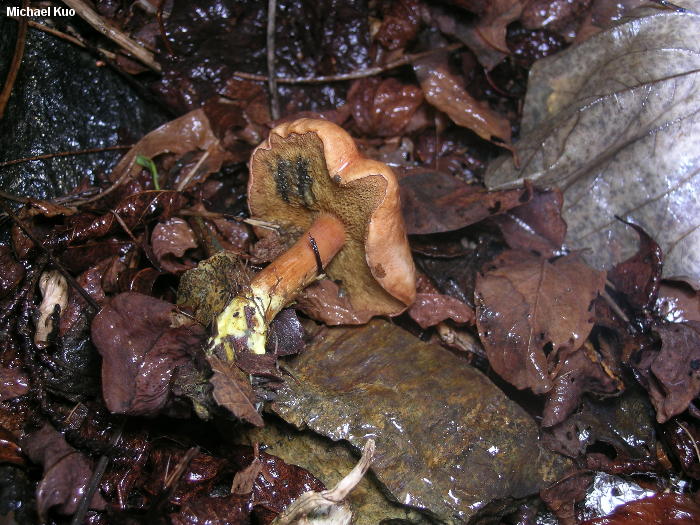 Chalciporus piperatoides [ Basidiomycota > Boletales > Boletaceae > Chalciporus . . . ] by Michael Kuo Similar to the better known Chalciporus piperatus, Chalciporus piperatoides is also a drab, pinkish tan bolete with a reddish pore surface, yellow basal mycelium and a peppery to bitter taste. Unlike its cousin, however, Chalciporus piperatoides bruises blue, and features an olive (rather than brown) spore print. Microscopic differences include smaller spores for Chaliciporus piperatoides, along with a faint greenish-blue reaction of the tubes to Melzer's reagent. Chalciporus piperatoides was originally described from an oak forest in Michigan, and is apparently widely distributed in North America and associated with a wide variety of trees--although this may be an indication that several cryptic species are actually involved. Boletus piperatoides and Suillus piperatoides are synonyms. Description: Ecology: Mycorrhizal with hardwoods and conifers; growing alone, scattered, or gregariously; summer and fall (also over winter along the West Coast); possibly widely distributed, but more common in northern and montane areas. Cap: 3-8 cm; convex or slightly conic, becoming broadly convex; sticky when fresh, but soon dry; bald or very finely velvety when young; shiny; dull red to reddish brown or dull pinkish tan, fading to tan. Pore Surface: Dull brownish orange to dull reddish; bruising blue, then slowly resolving to dark reddish brown; 1-2 pores per mm near the margin and when young, becoming larger and irregular to angular near the stem and with age; tubes to 5 mm deep. Stem: 4-8 cm long; 0.5-1.5 cm thick; more or less equal; dry; colored like the cap; bald; base with bright to dull yellow mycelium. Flesh: Yellowish in the cap; brighter yellow in the stem; bluing erratically when sliced, or not bluing. Odor and Taste: Odor not distinctive; taste strongly peppery or bitter. Chemical Reactions: Ammonia reddish brown on cap surface; brownish on flesh. KOH black on cap surface; brown on flesh. Iron salts negative on cap surface; negative on flesh. Spore Print: Olive. Microscopic Features: Spores 6-8 x 2.5-3.5 µ; smooth; subfusoid; yellowish in KOH. Hymenial cystidia fusoid to fusoid-ventricose; to about 75 x 12 µ. Trama of tubes faintly and erratically greenish-amyloid when dried specimens are studied. Pileipellis a tangled layer of cylindric elements 6-12 µ wide; terminal elements with rounded to subacute apices; hyaline to yellowish. REFERENCES: (Smith & Thiers, 1971) Baroni & Both, 1991. (Smith & Thiers, 1971; Smith, Smith & Weber, 1981; Baroni & Both, 1991; Both, 1993; Bessette, Roody & Bessette, 2000; Roody, 2003; McNeil, 2006.) Herb. Kuo 07171007, 07111203. This site contains no information about the edibility or toxicity of mushrooms. |