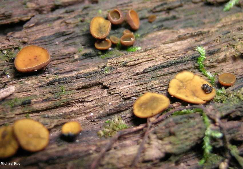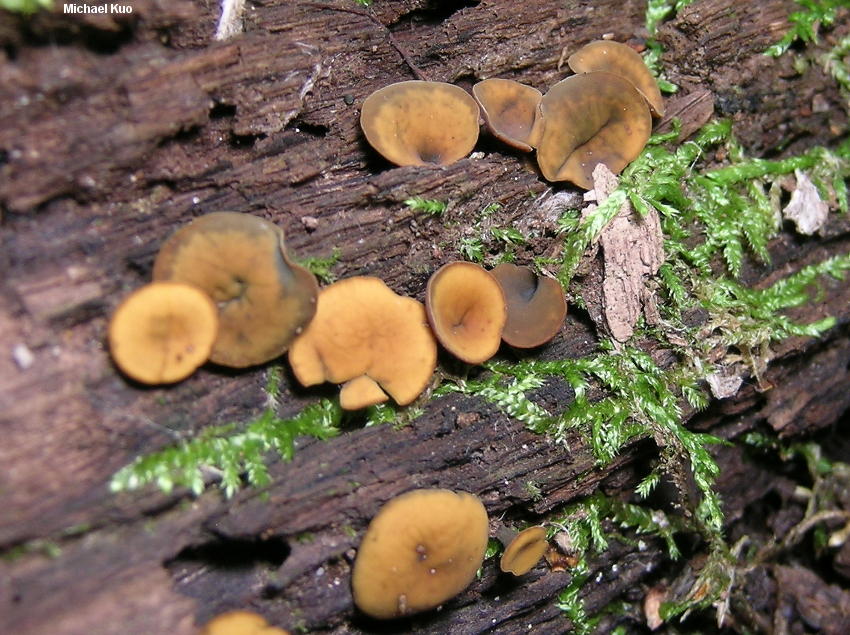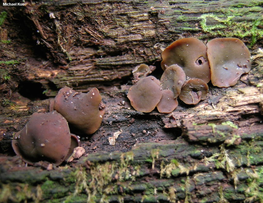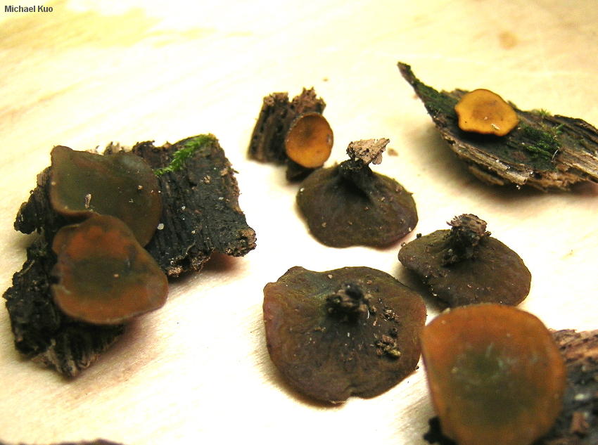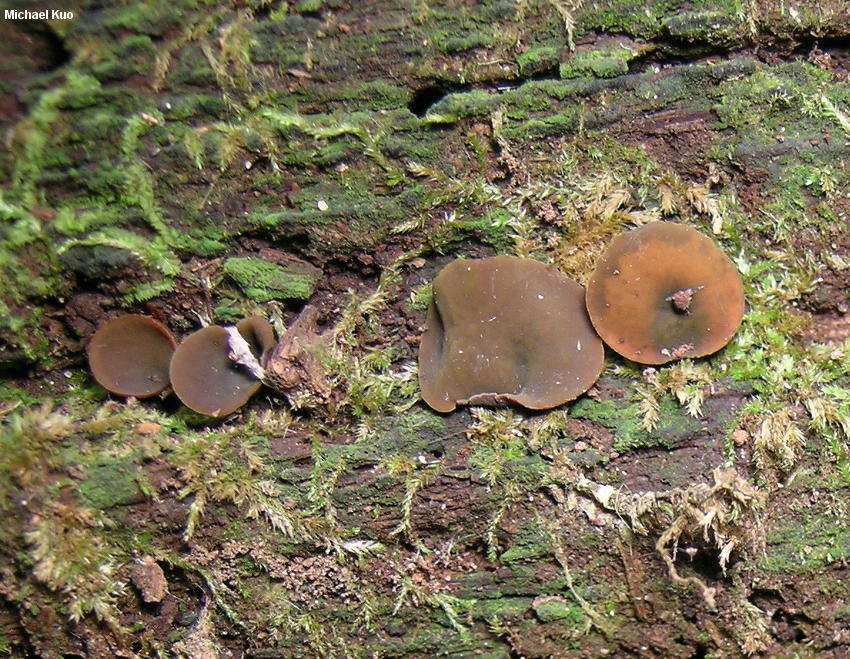 Chlorencoelia torta [ Ascomycota > Helotiales > Hemiphacidiaceae > Chlorencoelia ... ] by Michael Kuo This little cup fungus is boring and brownish on casual inspection, but winds up manifesting some interesting features when studied a bit more closely. Appearing on well-decayed hardwood logs in eastern North America, it features a dirty orange upper surface that soon develops olive stains and discolorations, and then turns brown. Underneath, it features a tiny stem-like structure that becomes increasingly wrinkled with age--and its flesh is cinnamon brown. This macroscopic description applies equally to the better known Chlorencoelia versiformis (AKA Chlorosplenium versiforme), which can only be separated from Chlorencoelia torta by means of a microscope; Chlorencoelia torta has shorter spores, darker brown medullary excipular elements, and excipular terminal cells that are clavate to subglobose, rather than cylindric. It is likely that many North American records of Chlorencoelia versiformis represent misidentifications made without a microscope, and actually represent Chlorencoelia torta; Ramamurthi and collaborators (1957) discovered this to be the case about half the time as they examined specimens from North American herbaria. Chlorosplenium tortum is a synonym. Chlorociboria rugipes, first described from New York by Peck as Helotium rugipes (1874) is also a synonym, according to Dixon (1975)--but Dixon's contention that Peck's North American species is the same as the European species first called Peziza torta by Schweinitz (1832) is not supported by contemporary, DNA-based analysis; it may be the case that "Chlorencoelia rugipes" becomes the correct name for the North American fungus some day. Description: Ecology: Saprobic on well-decayed, barkless hardwood logs; growing gregariously or in loose clusters in late summer and fall; apparently widely distributed in eastern North America. The illustrated and described collections are from Illinois. Fruiting Body: Cup-shaped at first, becoming flattened or disc-shaped; with a rudimentary, central stem; cups 3-15 mm across, bald, moist, dirty orange at first, becoming olive stained and eventually dark brown; undersurface bald, radially wrinkled, colored like the upper surface; stem 2-5 mm high, 1-2 mm wide, tapered to base, bald, colored like the cap, smooth or becoming elaborately wrinkled; flesh cinnamon brown to brownish, unchanging when sliced. Chemical Reactions: KOH negative to blackish on all surfaces. Microscopic Features: Spores 8-12 x 2.5-3.5 µ; long-ellipsoid or nearly cylindric; smooth; hyaline and biguttulate in KOH; hyaline and 1-septate in Melzer's. Asci 125-150 µ long; 8-spored; cylindric; hyaline in KOH; in Melzer's reagent blue to bluish overall when immature, but when approaching maturity hyaline, with a tiny apical blue pore. Paraphyses filiform with subacute or merely rounded apices; 120-150 x 2-4 µ. Medullary excipulum elements dark brown in KOH; dark reddish brown in Melzer's. Terminal cells on excipular surface clavate to subglobose. REFERENCES: (Schweinitz, 1832) Dixon, 1975. (Saccardo, 1889; Ramamurthi, Korf & Batra, 1957.) Herb. Kuo 09280603, 08070904, 08191403. This site contains no information about the edibility or toxicity of mushrooms. |