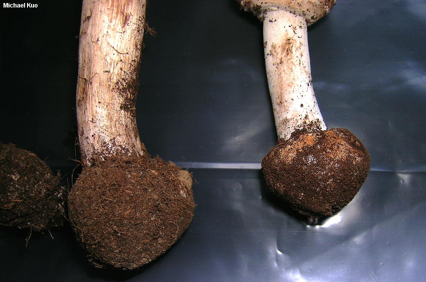 Chlorophyllum brunneum [ Basidiomycota > Agaricales > Agaricaceae > Chlorophyllum . . . ] by Michael Kuo This large, impressive lepiotoid mushroom grows in cultivated areas (gardens, lawns, and so on) in western North America along the West Coast and in Denver--and, much more rarely, in northeastern North America. It is a dead ringer for the better-known Chlorophyllum rhacodes, but can be separated on the basis of its simple ring, its abruptly bulbous stem, and microscopic features, including spores that are consistently truncated at one end. Chlorophyllum rhacodes, by contrast, has a double-edged ring, a gradually thickened stem base, and spores that are both truncated and non-truncated. Although Chlorophyllum brunneum was originally described (as Lepiota brunnea by Farlow & Burt, 1929) on the basis of material collected in a Massachusetts greenhouse, its documentation in eastern North America since then is sketchy, and collections from eastern North America bearing the name "Lepiota brunnea" in herbaria might represent a hodgepodge of Chlorophyllum brunneum and Chlorophyllum rhacodes. Description: Ecology: Saprobic; growing alone, scattered, or gregariously in gardens, waste places, and lawns, or in greenhouses; sometimes forming fairy rings; summer and fall, or over winter in coastal California; common on the West Coast and in the Denver area; rare in northeastern North America (see discussion above). The illustrated and described collections are from California. Cap: 7-12 cm; convex to blocky-convex when young, expanding to broadly convex or nearly flat; dry; bald and dull grayish brown when in the button stage, but soon becoming scaly with brown to gray-brown scales; surface beneath scales radially fibrillose and whitish. Gills: Free from the stem; crowded; short-gills present; whitish; occasionally with brownish edges. Stem: 8-17 cm long; 1.5-2.5 cm thick; more or less equal above an abruptly swollen base that often features a rimmed upper edge; dry; finely fibrillose; whitish, discoloring dull brown; with a fairly tough, thick ring that is not two-layered but features a felty brown underside. Flesh: Whitish throughout; staining reddish orange to reddish or brownish when sliced. Odor and Taste: Not distinctive. Spore Print: White. Microscopic Features: Spores 9-12 x 6-8 µ; ellipsoid with a markedly truncated end; walls 1-2 µ thick; hyaline in KOH; dextrinoid. Cheilocystidia to about 50 x 20 µ; abundant; clavate; not swollen; hyaline in KOH; thin-walled. Pleurocystidia absent. Pileipellis a trichoderm (center of cap, or scales) or cutis (whitish, fibrillose surface). REFERENCES: (Farlow & Burt, 1929) Vellinga, 2002. (Vellinga, 2003a; Vellinga, 2003c; Vellinga, 2007c; Lange, 2008; Vellinga, 2008b; Trudell & Ammirati, 2009) Herb. Kuo 01161106. This site contains no information about the edibility or toxicity of mushrooms. |