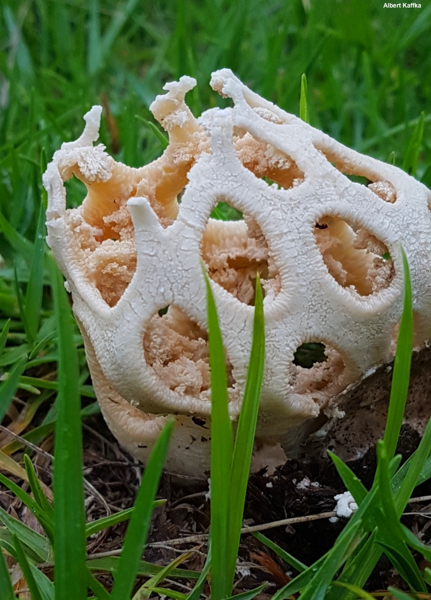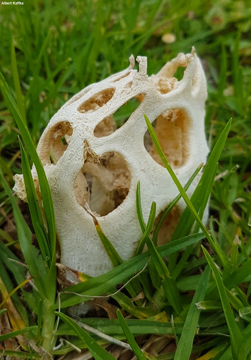 Clathrus baumii [ Basidiomycota > Agaricomycetes > Phallales > Clathraceae > Clathrus . . . ] by Michael Kuo Illustrated and described here is an interesting white stinkhorn from South Africa. It matches Clathrus baumii in the sense of mycologist D. M. Dring (1980), but it is a little uncertain whether Dring's concept corresponds perfectly with Clathrus baumii as it was originally described. The crucial identifying features for this mushroom are: the pale colors, the flattened arms that make up the cage structure, and the fact that the spore slime is produced on fairly large wart-like swellings ("glebifers," in Mycologese) at the intersections of the arms. According to Dring, the species "varies from white to pale ochraceous" and "should be easily recognizable by the strikingly flat outer surface of the arms." Clathrus baumii was originally described from Angola (Hennings, 1903) as a "flavo-aurantio" (Latin for yellow-orange) mushroom, without any mention of flattened arms—seemingly at odds with Dring's concept, although Hennings did emphasize the glebifers: "in axillis verrucam ferentibus pulpa sporarum atro-olivacea tegentem" (more or less: warts in the joints bearing blackish olive spore slime). The species was redescribed in 1963 from South Africa by Dissing and Lange, as "jaune vif à jaune brun" (bright yellow to yellowish brown) and without any mention of flattened arms—but, again, with special attention to the glebifers. In 1980 Dring reiterated Dissing and Lange's description of the species, and cited additional African drawings and collections of Clathrus baumii from Kenya, Tanzania, Uganda, and Zaire. However, Dring also placed the species in the Caribbean and South America, based on collections from R. W. G. Dennis, which Dring said differed from African material only in having "a pinkish volva." Complicating things even more, Dring based his illustrations (line drawings) of the species on the Caribbean and South American material, rather than the African material. Are you done yet? Because things get more complicated. The South American and Caribbean version with the pink volva has since been described as distinct from Clathrus baumii, as Clathrus roseovolvatus, by Lécuru and collaborators (2013). The description and photos portray a white species with arms that are not particularly flattened—and no glebifers; the spore slime of Clathrus roseovolvatus is produced all along the inner surfaces of the arms, without specialized, wart-like structures. Frustratingly, Lécuru and collaborators go to great lengths to compare their species with descriptions of Clathrus baumii, but appear not to have read the previous descriptions very carefully, because they make no note of the glebifer/no-glebifer difference—and in their key to "white or yellowish species of Clathrus" worldwide, they place only one glebifer-bearing species in Africa, Clathrus transvaalensis. The latter species is known from South Africa and features glebifers and pink to pinkish arms. Whew! So, unless I am missing something, the possibilities include: 1) the mushroom illustrated and described here is Clathrus baumii, which is found across Africa and ranges in color from yellow to white; 2) the mushroom is an undescribed species, mistaken for Clathrus baumii by Dring; 3) the mushroom is a pale, flat-armed version of Clathrus transvaalensis (in which case the possibility that Clathrus transvaalensis is really just a pink version of Clahtrus baumii arises). Thanks to Albert Kaffka for documenting, collecting, and preserving this species for study; his collection is deposited in The Herbarium of Michael Kuo. Description: Ecology: Saprobic; growing alone or gregariously in grassy areas; January; possibly widespread across Africa (see discussion above). The illustrated and described collection is from South Africa. Mature Fruiting Body: 8 cm high; 7 cm wide; consisting of a round-ish, hollow lattice that arises from a stemlike structure. Lattice Arms: About 1 cm wide and 3 mm thick; forming about 20 more or less round holes; edges of holes tightly striate for 2–4 mm; outer surfaces white, flattened, minutely pitted and spongelike; hollow; inner surfaces bumpy and dull yellowish; glebifers found on the inner surfaces at the intersections of the arms, 0.5–1.5 cm across, wart-like, bumpy. Pseudostem: Poorly defined; about 2 cm high, whitish to dull yellowish, enclosed in a whitish volva. Volva: Sac-like, encasing the base of the fruiting body; whitish. Spore Slime: Dark brown; covering the glebifers; very malodorous. Microscopic Features: Spores 3.5–5 x 1.5–2 µm; subcylindric; smooth; hyaline in KOH, often with two small guttules. Sphaerocysts of the pseudostipe 12–24 µm; subglobose; walls about 0.5 µm thick; hyaline in KOH. Hyphae of the volva 1–3 µm wide; smooth; thin-walled; hyaline in KOH; septate; clamp connections not found. REFERENCES: Hennings, 1903. (Dring & Rayner, 1967; Dring, 1980; Coetzee, 2010; Lécuru et al., 2013.) Herb. Kuo 01071701. This site contains no information about the edibility or toxicity of mushrooms. |