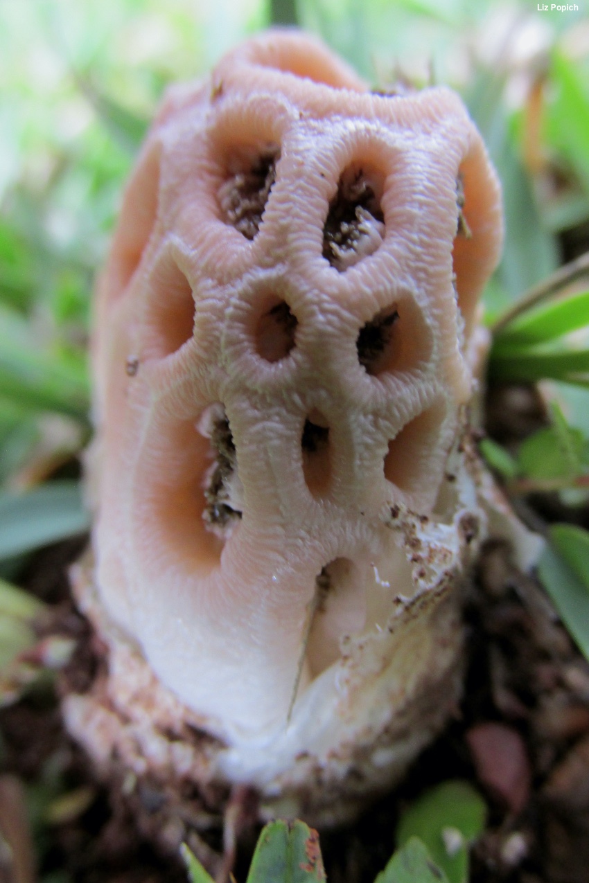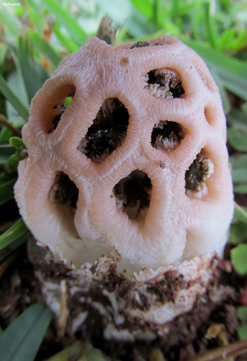 Clathrus transvaalensis [ Basidiomycota > Agaricomycetes > Phallales > Clathraceae > Clathrus . . . ] by Michael Kuo Known from South Africa, this awesome stinkhorn was first described by mycologists who found its "eggs" on a golf course and, worried that golfers would trample the specimens before they matured, brought the eggs to a lab for "incubation" under moist paper towels. When the mature stinkhorns emerged, the mycologists determined that the little guys were not adequately accounted for in stinkhorn literature—so they described a new species (Eicker & Reid 1990). Clathrus transvaalensis can be recognized by its pinkish colors, its range (it appears, so far, to be limited to southern Africa), and the fact that it produces its spore slime on little cushion-shaped bumps located at the intersections of the arms, which form polygonal spaces in a meshed structure. Thanks to Liz Popich for documenting, collecting, and preserving Clathrus transvaalensis for study; her collection is deposited in The Herbarium of Michael Kuo. Description: Ecology: Saprobic; growing alone or gregariously in urban locations, including lawns and golf courses as well as other cultivated areas, and in woodchip beds; January through April; South Africa. The illustrated and described collection is from Gauteng, South Africa. Immature Fruiting Body: Like a whitish to pinkish or brownish "egg"; when sliced revealing the stinkhorn-to-be encased in a gelatinous substance. Mature Fruiting Body: 5–10 cm high; 4–7 cm wide; consisting of a mesh of arms, with the lower meshes elongated vertically (almost appearing like supporting columns) and the upper meshes smaller, creating roundish to polygonal spaces. Arms: Up to about 1 cm thick; hollow; outer surfaces sometimes slightly flattened; densely transversely wrinkled (accordion-like in appearance); grooved between meshes; creamy whitish (especially below) to pinkish or pale salmon. Volva: Sac-like, encasing the base of the fruiting body; whitish to pinkish, with brownish stains. Flesh: Composed of tiny tubes; pinkish; brittle. Spore Slime: Brown; produced on cushion-shaped structures located at the intersections of the arms. Microscopic Features: Spores 4–5 x 1.5–2 µm; subcylindric; smooth; hyaline in KOH. Sphaerocysts of the arms 15–48 µm; irregularly subglobose; smooth; walls 0.5–0.75 µm thick; hyaline in KOH. Hyphae of the volva 2–4 µm wide unless swollen at septa (up to 7 µm); smooth; hyaline in KOH. REFERENCES: Eicker & D. A. Reid, 1990. (Coetzee, 2010; Lécuru et al., 2013) Herb. Kuo 03111401. This site contains no information about the edibility or toxicity of mushrooms. |