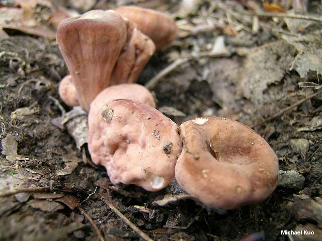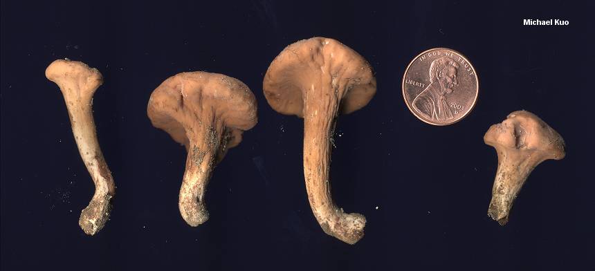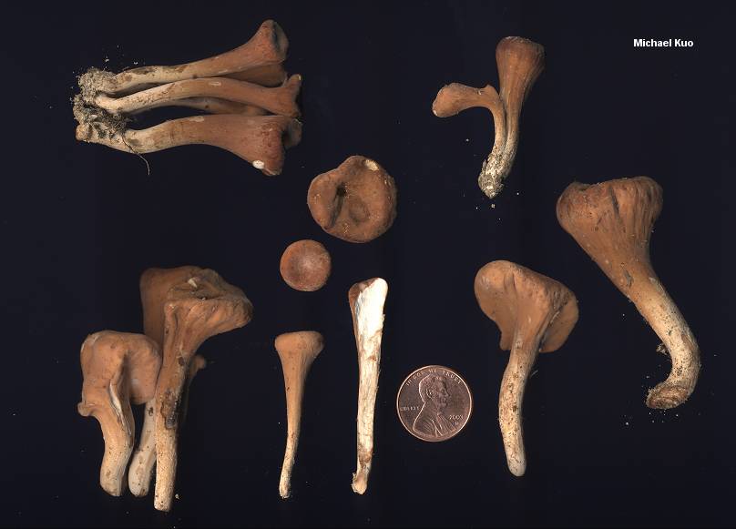 Clavariadelphus unicolor [ Basidiomycetes > Phallales > Gomphaceae > Clavariadelphus . . . ] by Michael Kuo This odd little mushroom is fairly easily recognized, but not so easily found. It typically fruits in the fall, just as the leaves of deciduous trees are falling. Mushroom hunters in areas where oaks and hickories predominate sometimes call this time of year "helmet season," referring to the danger posed by falling acorns and nuts; hunters who frequent walnut groves call it "body armor season." Clavariadelphus unicolor, with its pinkish to reddish brown colors, is hard to distinguish from fallen foliage. The defining features of Clavariadelphus unicolor include the shape of the mature mushrooms (which look cut-off and flattened), its colors (reddish brown to violet brown), and its bright yellow reaction to KOH. Its relatively small spores and mild taste also help to separate it from look-alikes. Description: Ecology: Mycorrhizal with hardwoods or conifers--particularly oaks and pines; growing alone, scattered, gregariously, or in small clusters; widely distributed east of the Rocky Mountains (also recorded from Texas and Mexico); fall. Fruiting Body: 3-10 cm high; 2-6 cm wide; cylindric or club-shaped when young, later enlarging at the top and appearing cut-off and flattened; surface smooth or broadly wrinkled; pinkish to reddish brown; sometimes bruising darker brown; the base inserted into the soil. Flesh: White; soft; sometimes staining brownish orange on exposure. Odor and Taste: Not distinctive. Chemical Reactions: Surface bright yellow in KOH. Spore Print: White. Microscopic Features: Spores 8.5-11.5 x 4.5-6 µ; broadly elliptical; smooth. REFERENCES: Corner, 1950. (Smith, Smith & Weber, 1981; Methven, 1990.) Herb. Kuo 10030301, 10160302. This site contains no information about the edibility or toxicity of mushrooms. |