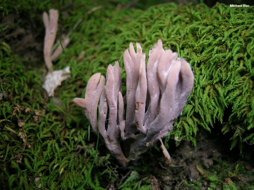Clavulina amethystinoides [ Basidiomycetes > Cantharellales > Clavulinaceae > Clavulina . . . ] by Michael Kuo Rarely if ever featured in field guides, Clavulina amethystinoides is an odd little fungus--a drab, purplish, Clavaria zollingeri wannabe. Its microscopic features (two-spored basidia, nearly round spores, and clamp connections) place it in the genus Clavulina, where it looks somewhat like a soiled Clavulina rugosa, and even occasionally develops branch tips approximating the "cristate" branch tips found in Clavulina cristata. Clavulina amethystina is a similar but more purple European species. "Clavaria amethystina" is an outdated synonym for Clavulina amethystina that is sometimes misapplied in field guides; see the comments on the page for Clavaria zollingeri. Description: Ecology: Presumably mycorrhizal; found under conifers and hardwoods; growing alone, scattered, or gregariously--but not in clusters; often in moss or in moist areas; summer and fall; southeastern United States to Massachusetts and Illinois. Fruiting Body: 2-6 cm high; usually moderately and irregularly branched, antlered, or lobed--but sometimes branched sparingly or not at all; when branched up to 4 cm wide. Branches: Fairly smooth, or finely rugged (but bald); fleshy tan to drab lilac or drab purple; tips colored like the sides, bluntly to sharply pointed or occasionally vaguely "cristate" with sharp points. Base: Up to about 3 cm long; velvety at the base; colored and textured like the branches. Flesh: Colored like the surfaces; brittle in the branches and tougher in the stem. Odor and Taste: Not distinctive. Spore Print: White. Chemical Reactions: Irons salts negative on branches. Microscopic Features: Spores 7.5-8.5 x 6-7.5 µ; subglobose or broadly ellipsoid; smooth; with an apiculus. Basidia clavate; 2-sterigmate with long, incurved sterigmata. Clamp connections present. REFERENCES: (Peck, 1907) Corner, 1950. (Saccardo, 1912; Coker, 1923; Corner, 1950.) Herb. Kuo 07050801. This site contains no information about the edibility or toxicity of mushrooms. |