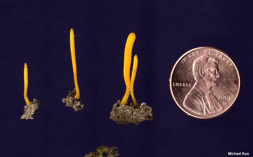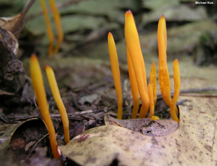 Clavulinopsis laeticolor [ Basidiomycota > Agaricales > Clavariaceae > Clavulinopsis . . . ] by Michael Kuo This tiny club fungus is easily overlooked, and can be quite a challenge to collect, unless you happen to carry tweezers with you when you go collecting. And, to be honest, if you do carry tweezers on your woodland mushroom outings, you probably need help. At any rate, Clavulinopsis laeticolor is, as a translation of its Latin name suggests, joyfully colored; it is typically orange or bright orangish yellow. It is distinguished from similar tiny, yellowish club mushrooms by its dry surface, its tiny size (often only a few centimeters in height), and its tendency to grow alone or gregariously, rather than in tightly packed clusters. Under the microscope, Clavulinopsis laeticolor has distinctive, oddly-shaped spores. Clavulinopsis fusiformis is similar but larger; it grows in clusters and has differently shaped spores. Clavaria laeticolor, Clavaria pulchra, Clavulinopsis pulchra, and Ramariopsis laeticolor are synonyms. Thanks to Sue Moody for documenting, collecting, and preserving Clavulinopsis laeticolor for study; her collection is deposited in The Herbarium of Michael Kuo. Description: Ecology: Presumably saprobic; growing alone, scattered, gregariously, or in loose groups under hardwoods or conifers; usually terrestrial but occasionally appearing on well-rotted, moss-covered stumps; summer and fall (also winter in warmer climates); originally described from Cuba; widely distributed in North America; also documented from Central America, South America, Europe, Asia, and Oceania. The illustrated and described collections are from Illinois and Minnesota. Fruiting Body: 17–50 mm high; 1–4 mm wide; cylindrical and unbranched; sometimes somewhat flattened, or with a groove or a twist; dry; bald; bright orange or yellow; fading with age; whitish at the extreme base; at maturity often with a somewhat pointed tip that ages or discolors somewhat reddish or orange. Flesh: Whitish to pale yellow or orange; thin. Odor and Taste: Not distinctive. Chemical Reactions: Iron salts negative to grayish on surfaces; KOH orangish. Microscopic Features: Spores 5–7 x 3.5–5 µ; irregularly subellipsoid to subamygdaliform, with a large protruding apiculus; smooth; hyaline and often uniguttulate in KOH; inamyloid. Basidia 35–55 x 5–8 µm; subclavate; 4-sterigmate. Cystidia not found. Contextual hyphae 3–5 µm wide; smooth; thin-walled; hyaline to golden in KOH; with small clamp connections. REFERENCES: (Berkeley & Curtis, 1869) R. H. Petersen, 1965. (Coker, 1923; Corner, 1950; Petersen, 1965; Petersen, 1968; Petersen, 1978; Smith, Smith & Weber, 1981; Arora, 1986; Breitenbach & Kränzlin, 1986; Barron, 1999; McNeil, 2006; López & García, 2008; Trudell & Ammirati, 2009; Buczacki et al., 2012; Birkebak et al., 2013; Desjardin, Wood 7 Stevens, 2015; Messuti & Lorenzo, 2015; Furtado et al., 2016; Siegel & Schwarz, 2016; Baroni, 2017; Elliott & Stephenson, 2018; Læssøe & Petersen, 2019.) Herb. Kuo 06200301, 07200705, 09221201, 08202001. This site contains no information about the edibility or toxicity of mushrooms. |