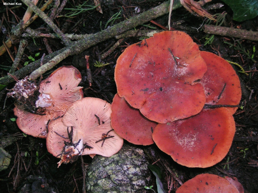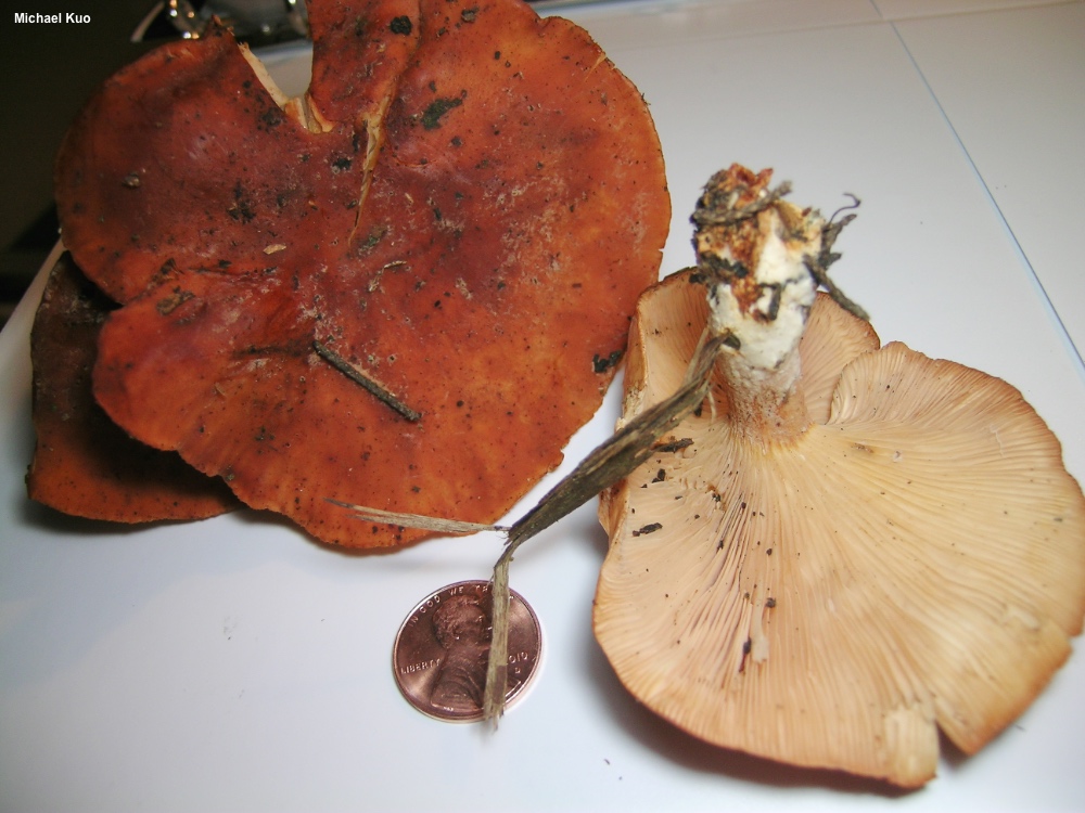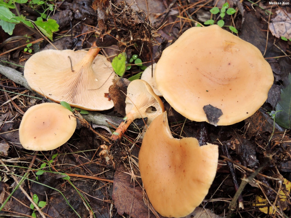 Clitocybe flaccida [Basidiomycota > Agaricales > Tricholomataceae > Clitocybe . . . ] by Michael Kuo Clitocybe flaccida is a brownish orange, sweet-smelling clitocyboid mushroom found under conifers, binding needle duff with its copious mycelium. On our continent the species is common in the Pacific Northwest and California, and occasional throughout northern and montane regions. Aside from the cap color and odor, distinguishing features include the orangish tinge to the gills (which becomes more pronounced with maturity), and very small, spiny spores. Vizzini and Ercole (2012) provided preliminary support for consideration of Clitocybe flaccida and closely related species in a separate genus, "Paralepista," but the authors jumped the gun by quite a bit, creating combinations for more than a dozen species in Paralepista without citing any collections or molecular evidence for most of the species transferred—and, even in the case of Clitocybe flaccida, which they did study, they provide no discussion to justify the new genus. Moreover, by more recent standards for creation of genera (Vellinga et al. 2014), they fail to support the genus in several important ways. Thus I will wait for more thorough science to support the idea. Lepista flaccida is a synonym (see the page for clitocyboid mushrooms if you care that I am not using this name), as are Clitocybe/Lepista inversa and Clitocybe/Lepista splendens. Description: Ecology: Saprobic; growing scattered or gregariously on conifer litter; summer and fall, or over winter in warm climates; originally described from and widely distributed in Europe; also found in western Asia; in North America distributed from the Pacific Northwest to the Great Lakes and Maine, extending southward in the Rocky Mountains and Appalachian Mountains. The illustrated and described collections are from California and Michigan. Cap: 4–10 cm; convex with an inrolled margin at first, becoming flat or shallowly vase-shaped; sticky when fresh but soon dry; fairly smooth; brownish orange to reddish orange, orangish yellow, or pale brownish orange; the margin not lined. Gills: Running down the stem; close; short-gills frequent; pinkish buff or orangish, becoming darker orange to brownish with maturity. Stem: 2–7 cm long; 1–1.5 cm thick; more or less equal; dry; colored like the cap but paler; with copious whitish to orangish mycelium at the base. Flesh: Thin; whitish to orangish or brownish; not changing when sliced. Odor and Taste: Odor sweet and fragrant; taste not distinctive, or slightly bitter. Chemical Reactions: KOH yellow on cap surface. Spore Print: Whitish to pale yellowish or pinkish. Microscopic Details: Spores 3–4.5 x 3.5–5 µm including ornamentation; subglobose to broadly ellipsoid; with spines 0.5–1 µm long; hyaline to yellowish in KOH; inamyloid; cyanophilic. Basidia 22–28 x 4–6 µm; clavate; 4-sterigmate. Cystidia not found. Pileipellis poorly differentiated; cap surface elements 1.5–3 µm wide, smooth, tangled, hyaline in KOH. Clamp connections present. REFERENCES: (Sowerby, 1799) N. T. Patouillard, 1887. (Smith, 1949; Bigelow & Smith, 1969; Smith, Smith & Weber, 1979; Bigelow, 1981; Phillips, 1981; Bigelow, 1985; Arora, 1986; Breitenbach & Kränzlin, 1991; Schalkwijk-Barendsen, 1991; Kuyper, 1995; Gregory, 2007; Buczacki et al., 2012; Vizzini & Ercole, 2012; Desjardin, Wood & Stevens, 2014; Siegel & Schwarz, 2016; Gminder & Böhning, 2017; Læssøe & Petersen, 2019.) Herb. Kuo 01130601, 01141102. This site contains no information about the edibility or toxicity of mushrooms. |