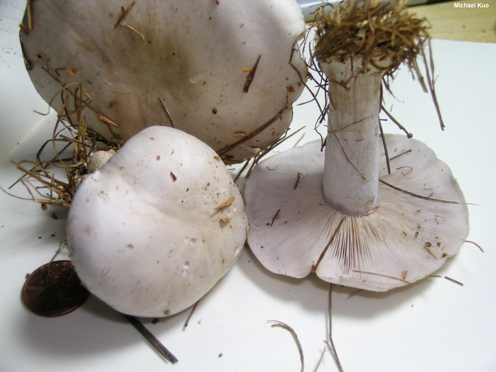 Clitocybe glaucocana [Basidiomycota > Agaricales > Tricholomataceae > Clitocybe...] by Michael Kuo I'm not entirely convinced that Clitocybe glaucocana is actually a species—as opposed to merely representing very pale collections of the well-known species Clitocybe nuda, although one does not find Clitocybe glaucocana mixed with Clitocybe nuda (in my collecting experience, anyway), lending support to the idea that the pale colors of the former represent, at the least, population differences. Aside from the pale colors, no features definitively separate Clitocybe glaucocana, to the naked eye or with a microscope, nor do the mushrooms appear in different ecosystems. Like Clitocybe nuda, Clitocybe glaucocana features narrowly attached gills and a pinkish spore print. But there is only the faintest hint of lilac in the cap, gills, stem, and flesh, even when the mushrooms are young. Clitocybe personata, also known as Clitocybe saeva, is also similar but features a darker purple stem and a brownish (but never purple) cap. In 2007 Gregory wrote that "Clitocybe glaucocana, C. nuda, and C. saeva may be more closely related than individual species, but research needs to be done to ascertain this." To my knowledge such research has not been done since; it would require DNA- and morphology-based examination of many carefully documented collections. Lepista glaucocana is a synonym. Description: Ecology: Saprobic; growing scattered or gregariously in organic debris—in woods, grasslands, or in urban settings; late summer and fall (and over winter in warm climates); originally described from Italy; widespread in Europe and North America. The illustrated and described collections are from Illinois. Cap: 3–9 cm across; convex with an inrolled margin when young, becoming broadly convex to nearly flat—or with an uplifted, wavy margin in age; bald; whitish to very pale tan, with the faintest hints of lilac. Gills: Attached to the stem, sometimes by a notch; crowded; short-gills frequent; very pale lilac. Stem: 3–8 cm long; 1.5–2 cm thick; usually featuring an enlarged base; dry; finely fibrillose; very pale lilac; staining and discoloring a little brownish; basal mycelium white to lilac. Flesh: Thick; soft; whitish, or pale purplish under the cap cuticle; not changing when sliced. Odor and Taste: Odor fragrant and sweet, or sometimes slightly foul; taste not distinctive. Chemical Reactions: KOH negative to slightly grayish on cap surface and on flesh. Spore Print: Pale salmon. Microscopic Details: Spores 5–8 x 2.5–4 µm; ellipsoid; very finely verrucose, or smooth; inamyloid; hyaline in KOH; cyanophilic; adhering in twos, threes, and fours. Basidia 25–27 x 4–6 µm; clavate; 4-sterigmate. Cystidia not found. Pileipellis an ixocutis of elements 3–6 µm wide, smooth, hyaline in KOH; clamp connections present. REFERENCES: (G. Bresàdola, 1790) H. E. Bigelow & A. H. Smith, 1969. (Smith, Smith & Weber, 1979; Bigelow, 1982; Breitenbach & Kränzlin, 1991; Gregory, 2007; Baroni, 2017; Christensen & Gulden, 2018; Kibby, 2020.) Herb. Kuo 10090305, 10251402. This site contains no information about the edibility or toxicity of mushrooms. |