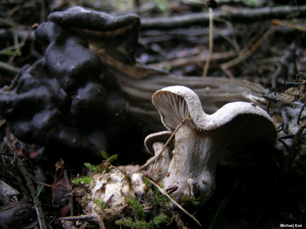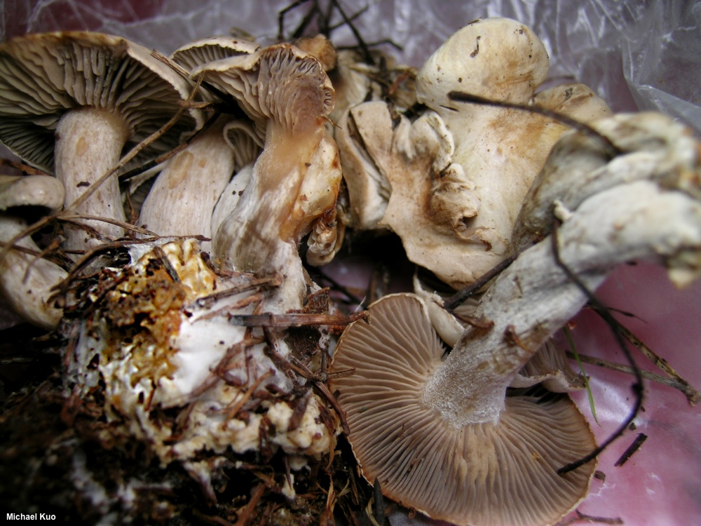 Clitocybe sclerotoidea [Basidiomycota > Agaricales > Tricholomataceae > Clitocybe...] by Michael Kuo Poor Helvella lacunosa. Despite being one of the coolest, funkiest mushrooms around, it just can't seem to catch a break. It is regularly parasitized by both Hypomyces cervinigenus and Clitocybe sclerotoidea. A gilled mushroom like Clitocybe sclerotoidea parasitizing an ascomycete is a bit of a novelty; usually it is the other way around–or the gilled mushroom parasitizes another gilled mushroom, as in the case of Entoloma abortivum, which attacks Armillaria mellea (though scientists used to think the parasitism was reversed). But Clitocybe sclerotoidea does, indeed, appear to "require Helvella-produced metabolites for initiation or maturation" of mushrooms (Trappe, 1972). Microscopic analysis of the large, swollen mass that is always at the base of Clitocybe sclerotoidea reveals the presence of cells from both species, and proves the direction of the parasitism. Clitocybe sclerotoidea is thus easily recognized by the fact that it grows with Helvella lacunosa in the Pacific Northwest and has a stem that arises from a swollen mass of tissue. Its dirty whitish cap, darkening gills, lack of a distinctive odor or taste, and microscopic features also help to distinguish it. Thanks to Jim Trappe for teaching me this mushroom. Description: Ecology: Parasitic on Helvella lacunosa; growing under conifers in clusters, often with malformed mushrooms also present; fall and winter (rarely in summer); Pacific Northwest. The illustrated and described collections are from California. Cap: 1–4 cm; convex, becoming planoconvex; bald to the naked eye but finely hairy with a hand lens; dirty whitish to pale grayish or brownish, often with watery spots; sometimes blackening in places with age or on handling; the margin at first inrolled. Gills: Attached to the stem or beginning to run down it; nearly distant; short-gills present; whitish at first, darkening to grayish brown. Stem: 1–3 cm long; 1–1.5 cm thick; more or less equal; finely velvety or hairy; arising from a swollen mass of fuzzy white tissue measuring up to 6 x 4 cm. Flesh: Whitish. Odor and Taste: Odor foul, or not distinctive; taste not distinctive. Chemical Reactions: KOH negative on cap surface. Spore Print: White. Microscopic Details: Spores 8–10 x 2.5–3.5 µm; subfusiform to fusiform; smooth; hyaline in KOH; inamyloid. Basidia 30–35 x 5–6 µm; subclavate; 4-sterigmate. Cystidia not found. Pileipellis a cutis or ixocutis; elements 2.5–5 µm wide, smooth, hyaline to yellowish in KOH, with clamp connections. REFERENCES: (Morse, 1943) Bigelow, 1958. (Trappe, 1972; Smith, 1975; Smith, Smith & Weber, 1979; Bigelow, 1982; Arora, 1986; Gregory, 2007; Kuo & Methven, 2010; Nguyen et al., 2013; Desjardin, Wood & Stevens, 2014; Siegel & Schwarz, 2016.) Herb. Kuo 01150501. This site contains no information about the edibility or toxicity of mushrooms. |