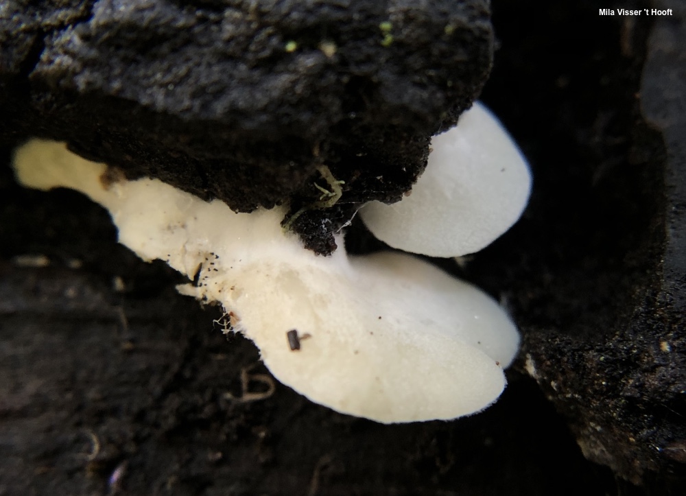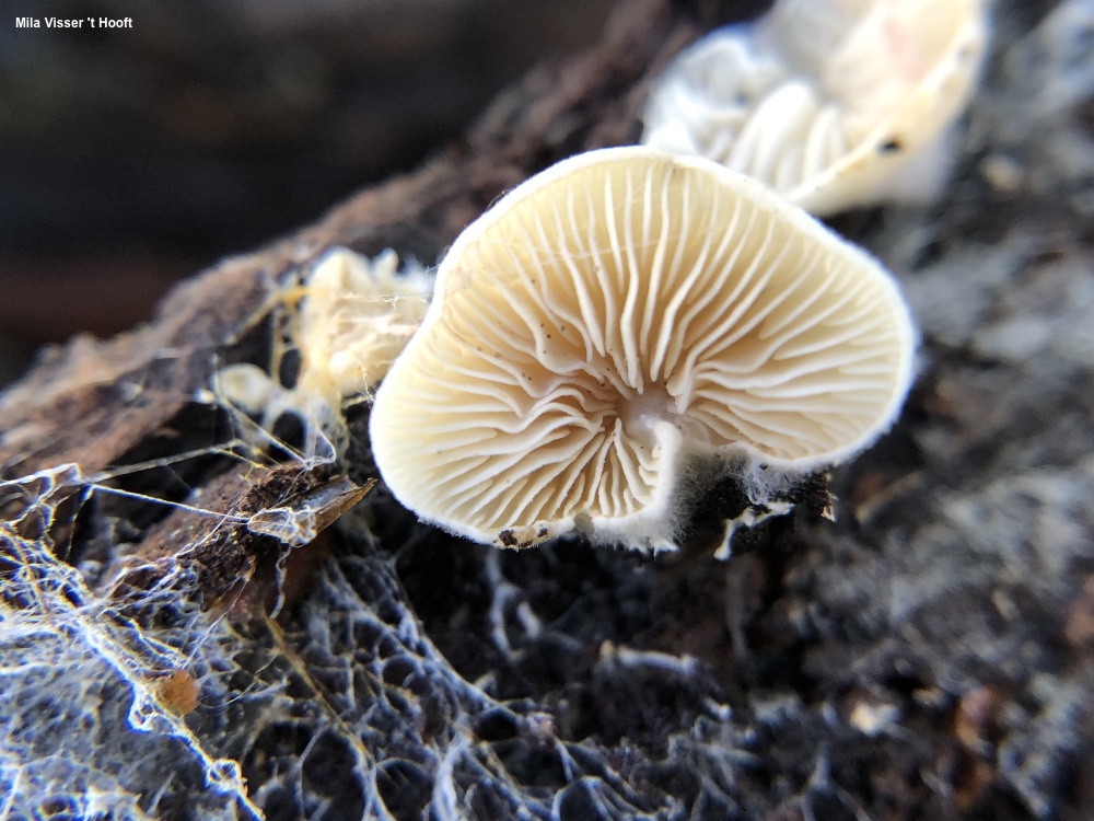 Clitopilus hobsonii [Basidiomycota > Agaricales > Entolomataceae > Clitopilus . . . ] by Michael Kuo Clitopilus hobsonii is a tiny white mushroom, usually pleurotoid in shape, growing on deadwood, grasses, or plant stems. Its gills turn pinkish with age and, under the microscope, its spores are ridged—although the ridges are very difficult to see and show up best when spores are viewed from the end. As it is currently defined Clitopilus hobsonii is found in many places across the globe, from tropical to temperate and even boreal areas. Many species of Crepidotus can look similar, but have gills that eventually turn brownish to brown. Clitopilus scyphoides is similar but grows from the ground and features a fairly well-developed stem. Clitopilus daamsii (putatively separated by its larger spores) and Clitopilus rhodophyllus (larger, with caps up to 45 mm across) may or may not represent separate species. Thanks to Mila Visser 't Hooft for documenting, collecting, and preserving Clitopilus hobsonii for study; her collection is deposited in The Herbarium of Michael Kuo. Description: Ecology: Saprobic; growing alone or gregariously on various plant substrates, including deadwood, bark, grasses, and plant stems; summer and fall, or over winter in warm climates; originally described from England, and found throughout Europe; in North America found east of the Great Plains and on the West Coast; also found in Oceania, Central America, and South America. The illustrated and described collection is from California. Cap: 5–15 mm across; in outline semicircular to somewhat irregularly shaped; planoconvex; finely silky or nearly bald toward the margin, but velvety to thickly fuzzy near the point of attachment to the substrate; watery whitish. Gills: Close or nearly distant; short-gills frequent; whitish. Stem: Absent. Flesh: Insubstantial; white; unchanging when sliced. Odor and Taste: Not distinctive. Spore Print: Pinkish. Microscopic Features: Spores 5–7 x 3–5 µm; ellipsoid; ridged longitudinally (but appearing nearly smooth in side view); angular in end view; hyaline in KOH; inamyloid. Basidia 25 x 6 µm; clavate; 4-sterigmate. Cystidia not found. Pileipellis a tightly packed cutis of elements 2–3 µm wide, smooth, hyaline in KOH; with occasional exserted, cystidioid terminal cells. Clamp connections not found. REFERENCES: (M. J. Berkeley & C. E. Broome, 1860) P. D. Orton, 1960. (Noordeloos, 1988; Breitenbach & Kränzlin, 1995; Baroni & Halling, 2000; Buczacki et al., 2012; Garnier-Delcourt et al., 2012; Siegel & Schwarz, 2016; Noordeloos, 2018; Læssøe & Petersen, 2019; Baroni et al., 2020; Jian et al., 2020.) Herb. Kuo 01262003. This site contains no information about the edibility or toxicity of mushrooms. |