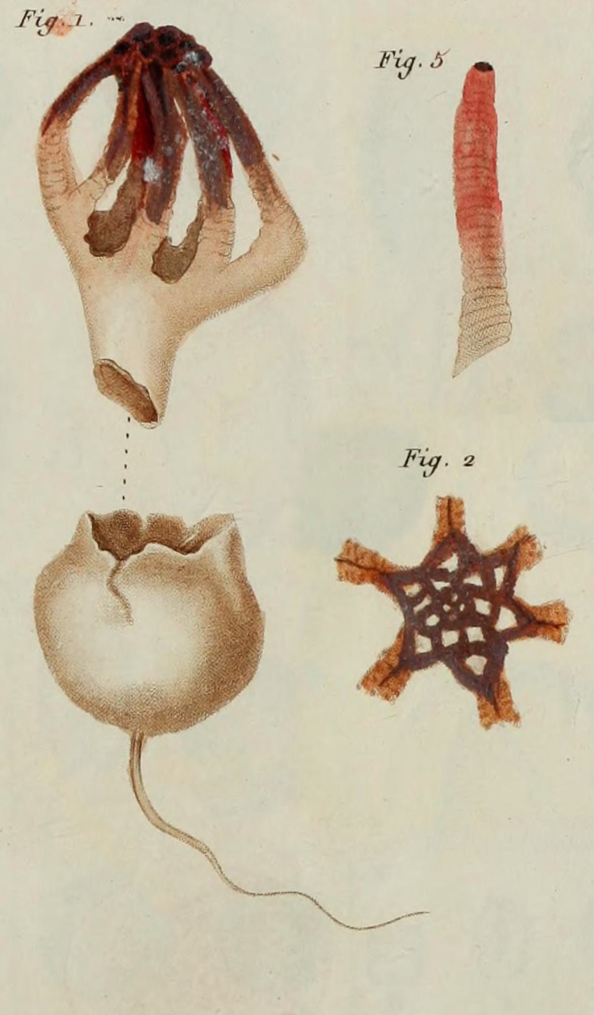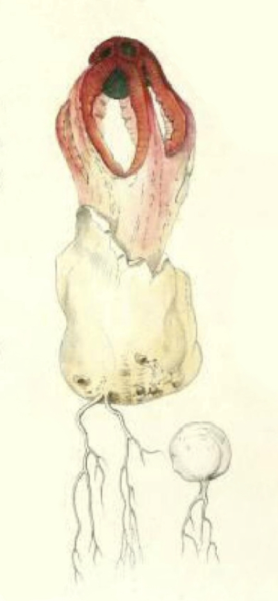 Colus hirudinosus [ Agaricomycetes > Phallales > Clathraceae > Colus . . . ] by Michael Kuo This primarily Mediterranean stinkhorn features a cage-like structure above a stubby stem. The arrangement of the "cage" distinguishes it: 4–6 arms are fairly widely spaced for most of the cage—but at the top, an abrupt network of smaller spaces develops. Colus hirudinosus is similar to Oceania's Colus pusillus (and it may occur in Oceania as well, if online photos are accurate), but that species does not develop the abrupt network at the top, and is generally a bit larger and more red. As you can see from the illustrations, which represent a herbarium specimen and type illustrations from the 19th Century, I have not seen Colus hirudinosus in the fresh state. Have you collected it recently? I would love to study well-documented, preserved collections, in order to make this page more scientific. If you're interested in helping, please send me an email at . Clathrus hirudinosus is a synonym. Thanks to the Herbarium of the University of California, Berkeley for facilitating study of the Colus hirudinosus collection cited below. Description: Ecology: Saprobic; growing alone or gregariously; in woods or in cultivated areas; year-round; originally described from southern France; distributed around the Mediterranean in Europe, the Middle East, and northern Africa; reported from Jamaica. The collection studied is from Israel. Fruiting Body: Initially a whitish to brownish "egg" up to 1 cm across, attached to white cords; rupturing, with the stinkhorn emerging as a cage-like structure, 3–5 cm high and about 3 cm wide, composed of 4–6 corrugated arms that fuse into a stem-like base; arms widely spread until the apex; apex of the cage structure with an abrupt network of small openings; arms usually dark red, when fresh, near the apex—becoming paler (reddish orange, pink, pale orange) toward the base; the inner surfaces of the cage covered with foul-smelling, olive brown slime; the egg tissue creating a whitish volva at the base of the stinkhorn. Odor: Unpleasant and strong. Microscopic Features: Spores 3–5 x 1.5–2 µm; subcylindric; smooth; hyaline in KOH. Sphaerocysts of the pseudostipe 9–43 µm; subglobose, pyriform, or irregular; smooth; walls about 1 µm thick; hyaline to faintly yellowish in KOH. Hyphae of the volva 1–4 µm wide; smooth; occasionally branched; thin-walled; hyaline in KOH; septate; clamp connections not found. REFERENCES: A. Cavalier & P. Séchier, 1835. (Tulasne, 1849; Lloyd, 1907; Cunningham, 1931; Cunningham, 1944; Dring, 1964; Dring, 1980; Akata & Gürkanli, 2018.) Herb. UC 955042 (GenBank MK607412). This site contains no information about the edibility or toxicity of mushrooms. |