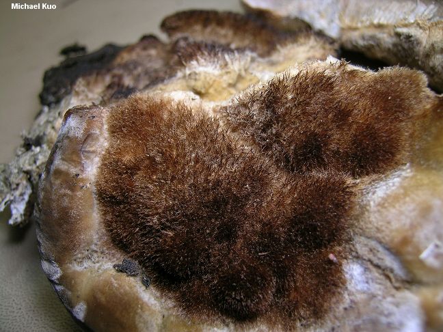 Coriolopsis gallica [ Basidiomycetes > Polyporales > Polyporaceae > Coriolopsis . . . ] by Michael Kuo This rare polypore needs a haircut. Its cap surface is not just "tomentose" or "hispid" (to use the well-behaved terms of official mycology), or even "hirsute." No, Coriolopsis gallica is downright hairy and unkempt. It is a widespread decomposer of the deadwood of willows and cottonwoods, characterized by its hairy cap, its gray to grayish brown pore surface, its large and distinctively angular pores, its rusty brown flesh, and microscopic features (see below). Trametes hispida in the sense of some North American authors (eg E. C. Smith, 1930; Overholts, 1953) is a synonym. Description: Ecology: Saprobic on the deadwood of willows and cottonwoods (and occasionally other hardwoods); causing a white rot; also parasitic on apple trees in orchards (at least in Colorado; see E. C. Smith, 1930); growing alone or gregariously; annual; summer and fall (and over winter in warm climates); widely distributed in North America but apparently absent in the southeastern United States. Cap: Usually present and well developed, but sometimes present merely as a folded-over edge above a spreading pore surface; up to about 20 cm wide and 10 cm deep but usually about 10 cm wide; convex; semicircular, bracket-shaped, or somewhat irregular; sometimes fused laterally with other caps; brown to grayish brownish or gray; densely hairy, becoming bald on the margin. Pore Surface: Gray to gray-brown; not bruising, but discoloring reddish brown in places; with angular, 4- to 6-sided pores 1-3 mm wide, becoming elongated and jagged (and sometimes nearly maze-like or gill-like in places) with age; tubes to 15 mm deep, often paler than the pore surface or the flesh. Stem: Absent Flesh: Rusty brown to dull brown; corky or tough and leathery. Chemical Reactions: KOH dark gray to black on flesh--fading slowly back to the original color. Spore Print: Not documented. Microscopic Features: Spores extremely variable in size, even within a single mushroom; (8-) 10-16 (-21) x 3-5 µ; smooth; cylindric; inamyloid; hyaline in KOH. Cystidia absent. Hyphal system trimitic, with thin-walled, hyaline, clamped generative hyphae; thick-walled, golden, tortuous binding hyphae; and thick-walled, golden, aseptate skeletal hyphae. REFERENCES: (Fries, 1821) Ryvarden, 1973. (Saccardo, 1888; E. C. Smith, 1930; Overholts, 1953; Breitenbach & Kränzlin, 1986; Gilbertson & Ryvarden, 1987.) Herb. Kuo 08120705. This site contains no information about the edibility or toxicity of mushrooms. |