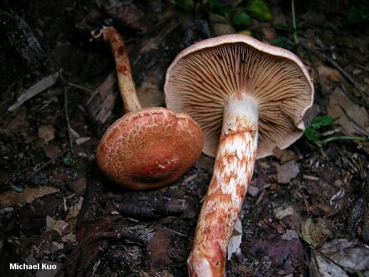 Cortinarius bolaris [Basidiomycetes > Agaricales > Cortinariaceae > Cortinarius ... ] by Michael Kuo This species is fairly easily recognized (for a Cortinarius) by the bright, brownish red scales covering its cap and stem. Additional identifying features include the cylindric (rather than swollen) shape of the stem, the rusty orange bruising of the stem base, and the fact that the cap and stem are dry. Like other species of Cortinarius it grows on the ground and features a cortina and a rusty brown spore print. Description: Ecology: Mycorrhizal with hardwoods (perhaps exclusively with beech and oaks, though it is sometimes reported under conifers), often in wet areas; growing alone, gregariously, or in small troops; summer and fall; widely distributed in eastern North America, and documented in Costa Rica. Cap: 2.5-8 cm; convex or broadly bell-shaped at first, becoming broadly convex, broadly bell-shaped, or nearly flat; dry; covered with red to brownish red, appressed scales that become more separated as the cap expands, revealing the whitish to yellowish or pinkish flesh beneath. Gills: Attached to the stem; close or crowded; dirty yellowish to dull cinnamon at first, becoming cinnamon to rusty; covered by a whitish cortina when young. Stem: 4-10 cm long; up to 1.5 cm thick; more or less equal; dry; whitish underneath stretched-out, red scales or irregular bands; discoloring and bruising rusty orange to red near the base; usually with a rusty ring zone above the scales and bands. Flesh: Whitish, becoming slowly yellowish when sliced and exposed to air. Odor and Taste: Not distinctive. Chemical Reactions: KOH on cap surface black. Spore Print: Rusty brown. Microscopic Features: Spores 6-8 x 5-6 µ; subglobose to ovoid; moderately verrucose. Pleurocystidia absent. Marginal cells clavate to subclavate. Pileipellis a cutis of orangish elements REFERENCES: (Persoon, 1801) Fries, 1838. (Fries, 1821; Saccardo, 1887; Kauffman, 1918; Kauffman, 1932; Smith, Smith & Weber, 1979; Phillips, 1991/2005; Roody, 2003; McNeil, 2006; Miller & Miller, 2006; Binion et al., 2008.) Herb. Kuo 08180608. This site contains no information about the edibility or toxicity of mushrooms. |