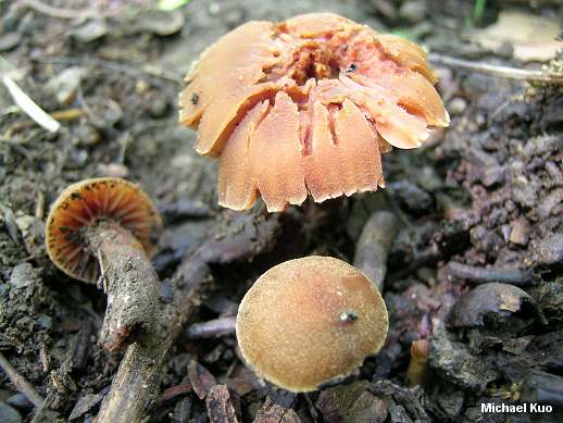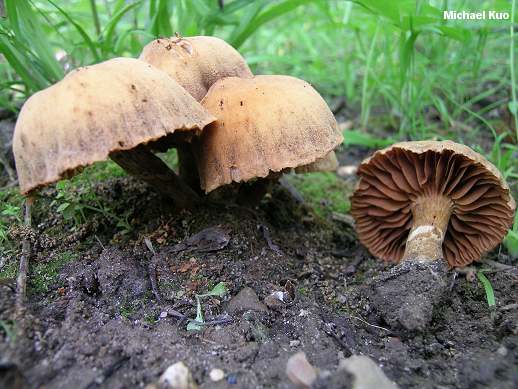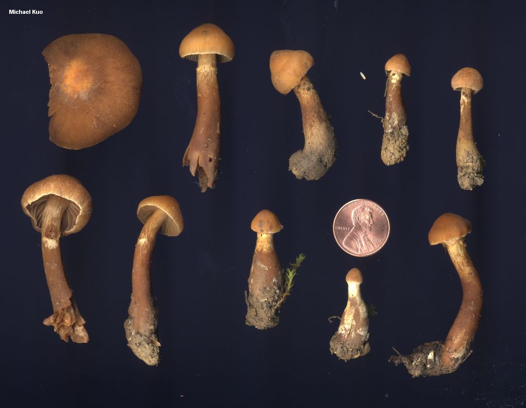 Cortinarius distans [Basidiomycetes > Agaricales > Cortinariaceae > Cortinarius ... ] by Michael Kuo This little Cortinarius is often one of the first mycorrhizal mushrooms to appear in eastern North America's hardwood forests, beginning to fruit in May or even April, depending on the weather. It is one of many boring, brownish, hard-to-identify species in the subgenus Telamonia, but its distantly spaced gills, its grainy cap surface, its whitish ring zone and its early appearance combine to help set it apart. A western variety of this species, Cortinarius distans var. olympianus, has been described (Smith, 1944) as associated with conifers in Washington; it also differs in having slightly less distant gills, a yellowish ring zone, and a stem that bruises reddish brown when handled. The European species Cortinarius hinnuleus is similar but has a fairly bald, less bell-shaped cap, and closer gills. Roger Phillips's North American treatment of "Cortinarius hinnuleus" may represent Cortinarius distans. Description: Ecology: Mycorrhizal with hardwoods, especially oaks and, in my experience, hickories; growing alone or gregariously; common in spring and early summer, but appearing through fall; widely distributed east of the Rocky Mountains (see comments below for western collections). Cap: 2-7 cm; bell-shaped to conical, becoming broadly bell-shaped or convex; moist when fresh; usually finely grainy or scaly, at least when young; orangish brown, changing color markedly as it dries out and becoming dull orangish tan; the margin at first whitish, often splitting in age. Gills: Attached to the stem, often by a notch; distant; pale brownish to nearly yellowish at first, becoming cinnamon brown; initially covered by a white cortina. Stem: 4-8 cm long; up to 1.5 cm thick; equal or club-shaped (especially when young); finely silky; brownish, with a paler apex when young; often with a white ring zone; basal mycelium whitish. Flesh: Whitish when young but soon brownish; becoming crumbly in the stem with age. Odor: Radishlike, sweetish and fragrant, or not distinctive. Chemical Reactions: KOH on cap surface slowly dark reddish brown. Spore Print: Rusty brown. Microscopic Features: Spores 6-9 x 4-6 µ; ellipsoid, often with one subfusoid end; moderately to finely ornamented; dextrinoid; orangish brown in KOH. Cheilo- and pleurocystidia absent. Pileipellis a cutis. REFERENCES: Peck, 1872. (Saccardo, 1887; Kauffman, 1918; Kauffman, 1932; Smith, 1944; Smith, Smith & Weber, 1979; Phillips, 1991/2005 [as C. hinnuleus]; Horn, Kay & Abel, 1993; Roody, 2003; Binion et al., 2008.) Herb. Kuo 06129501, 06130207, 05210403, 05260405, 05270401, 05270402, 06070803. This site contains no information about the edibility or toxicity of mushrooms. |