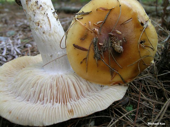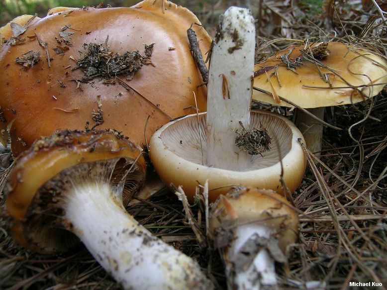 Cortinarius mucosus [Basidiomycetes > Agaricales > Cortinariaceae > Cortinarius ... ] by Michael Kuo Despite its disgusting name, Cortinarius mucosus is an attractive (if slimy) species, characterized by its brownish orange cap, its Russula-like stature, its straight and slimy stem, and its preference for pines. Under the microscope it features a gelatinized pileipellis and large, flask-shaped spores. Description: Ecology: Mycorrhizal with pines (especially, but not exclusively, with 2- and 3-needled pines) and with other conifers; growing alone, scattered, or gregariously; late summer and fall; apparently widely distributed in North America. Cap: 4-12 cm; convex, becoming broadly convex or nearly flat; slimy when fresh; bald; brownish orange, fading to orangish or yellowish with age. Gills: Attached to the stem; close or nearly crowded; creamy at first, becoming cinnamon to rusty brown. Stem: 4-10 cm long; up to about 2.5 cm thick; more or less equal; white; covered with a glutinous slime veil when fresh and young, but eventually more or less dry; often with rusty fibrils or a ring zone. Flesh: Whitish. Odor and Taste: Not distinctive. Chemical Reactions: KOH blackish red on cap surface. Spore Print: Rusty brown. Microscopic Features: Spores 11-17 x 5-7.5 µ; amygdaliform; moderately to strongly verrucose. Pleuro- and cheilocystidia absent; marginal cells occasional. Pileipellis an ixocutis of clamped, ochraceous elements. REFERENCES: (Bulliard, 1792) J. J. Kickx, 1867. (Saccardo, 1887; Kauffman, 1932; Smith, Smith & Weber, 1979; Moser, 1983; Weber & Smith, 1985; Arora, 1986; Hansen & Knudsen, 1992; Breitenbach & Kränzlin, 2000; McNeil, 2006.) Herb. Kuo 09110502. This site contains no information about the edibility or toxicity of mushrooms. |
