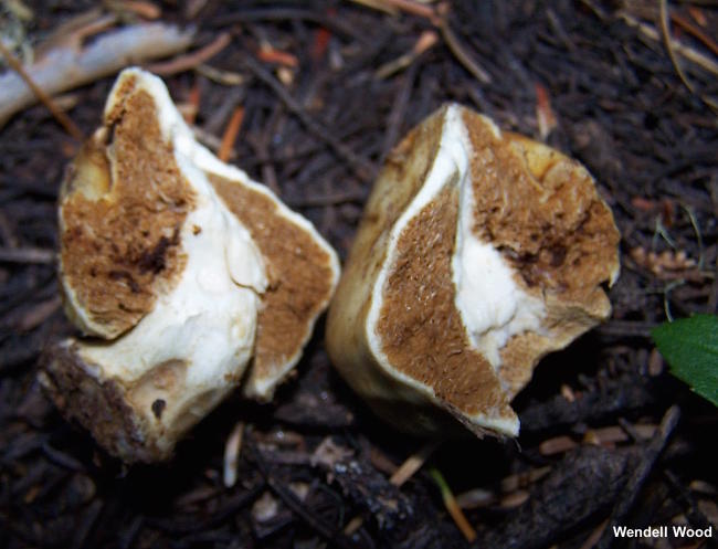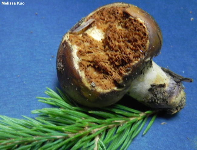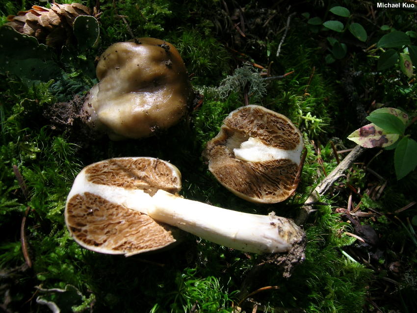 Cortinarius pinguis [Basidiomycota > Agaricales > Cortinariaceae > Cortinarius ... ] by Michael Kuo Formerly known as Thaxterogaster pingue, this oddball of the western mountains is actually a "gasteroid" species of Cortinarius. Its cap begins to develop but never opens up to expose the gills, which are consequently poorly formed. The microscopic spore-producing machinery works perfectly well, however, manufacturing Cortinarius-like spores that are presumably dispersed when the cap begins to disintegrate, or when foraging creatures have a yummy meal and continue foraging elsewhere. Mycologists have long debated the evolutionary significance of gasteroid gilled mushrooms and boletes like Cortinarius pinguis, and have often been tempted to see these mushrooms as "transitional" forms. But recent DNA analyses have begun to place some gasteroid genera like Thaxterogaster smack in the middle of "normal" genera—indicating the likelihood that gastroid forms evolved independently as adaptations to certain environments. Cortinarius pinguis appears to be closely related to Cortinarius collinitus and similar species in subgenus Myxacium (see Peintner and collaborators, 2004). Cortinarius pinguis is a common late summer and fall find under conifers in the Rocky Mountains, and it also occurs in the Cascades and the Sierra Nevada. It has an olive brown, sticky cap, and a whitish cortina. It usually features a fairly well-developed stem, but when it grows underground or partially submerged the stem may be rudimentary or nearly absent. The interior of the cap, when sliced open, features a mass of poorly formed, reddish brown gills. Cortinarius pavelekii (née Thaxterogaster pavelekii; see Trappe & Castellano, 2000) is a similar but rare species known from the West Coast, best separated with microscopic analysis; it lacks clamp connections. Cortinarius pingue is an alternate spelling. Thanks to Wendell Wood for collecting, documenting, and preserving some of the illustrated and described specimens; his collection is deposited in The Herbarium of Michael Kuo. Description: Ecology: Mycorrhizal with conifers, especially firs and Engelmann spruce; growing scattered or gregariously, often partially submerged in needle duff; summer and fall; common in the Rocky Mountains but occasionally reported from the Sierra Nevada and the Cascades (under firs). The illustrated and described collections are from Colorado and Oregon. Cap: 1–3 cm; convex or irregularly blockish; sticky or slimy; broadly wrinkled or more or less smooth; bald; olive brown or brownish yellow; the margin fused to the stem with whitish, cortina-like material; never opening to expose the interior. Interior: Reddish brown; a mass of poorly formed "gills" and occasional air pockets. Stem: Sometimes absent or rudimentary (especially in drier regions, where Cortinarius pinguis grows partially submerged or nearly underground); 2–4 cm long; 0.5-1 cm thick; more or less equal; dry; whitish or pale brownish, but often with pinkish or lilac flushes near the base. Flesh: Whitish; unchanging when sliced; forming a central column through the interior of the cap. Odor: Strong and sweet, reminiscent of the foetid russulas. Microscopic Features: Spores 14–18 x 8–12 µm; ellipsoid; moderately verrucose; orangish brown in KOH; dextrinoid. Clamp connections present in hymenium and in columella trama. REFERENCES: (Zeller, 1941) Peintner, Moser & Vilgalys, 2002. (Smith, Smith & Weber, 1981; Arora, 1986; Phillips, 1991/2005; Evenson, 1997; Peintner, Moncalvo & Vilgalys, 2004; Trappe, Evans & Trappe, 2007.) Herb. Kuo 09010604, 09261205. Herb. DBG RMNP 2008-034, ROMO 2012 5023-20, ROMO 2012 5025-01. This site contains no information about the edibility or toxicity of mushrooms. |