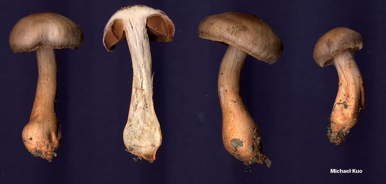 Cortinarius rubripes [Basidiomycetes > Agaricales > Cortinariaceae > Cortinarius ... ] by Michael Kuo The fiery orange base of this hardwood-loving Cortinarius is quite distinctive, separating it from the hordes of dull, boring members of subgenus Telamonia. Like other Telamonias it is "hygrophanous"--the term in Mycologese for a cap that is moist at first, but soon begins to dry out and change color markedly. When young the cap has purple shades that create an appealing contrast to the orange stem base--but by maturity it becomes more or less dingy cinnamon brown. Cortinarius bulliardii is a similar European species. Below I have cited Kauffman (1906) as the authority for the name Cortinarius rubripes, but Peck's 1906 publication of the same name is a potential competitor. Although my understanding of such things is incomplete, it appears to me that someone in a position of taxonomic authority needs to figure out which 1906 publication was published first. Kauffman (1932) confidently lists Peck's name as a synonym of his own species--although he was less sure in a previous publication (1918) that the mushrooms described by the two authors did indeed represent the same species. Neither MycoBank nor Index Fungorum mentions the Kauffman publication--but this is probably because Peck's publications are incorporated into these databases, while Kauffman's are not entirely incorporated. Description: Ecology: Mycorrhizal with hardwoods, especially oaks; growing alone, scattered, or gregariously; summer and fall; possibly widely distributed in North America (versions of the species, at any rate, are recorded from eastern North America and from California). Cap: 2.5-12 cm; convex, becoming broadly convex, flat, or broadly bell-shaped; moist becoming dry; smooth or silky; purplish cinnamon at first, changing to reddish brown or cinnamon brown as it dries out. Gills: Attached to the stem; fairly well spaced; pale or pale purplish when young, becoming cinnamon to rusty; covered by a cortina when young. Stem: 3-9 cm long; 0.5-2.5 cm thick at the apex; somewhat swollen at the base; dry or moist; smooth or finely silky; pale purplish to brownish, with a fiery orange or bright to brick red base; basal mycelium also brightly colored; sometimes with a rusty ring zone. Flesh: Whitish or dingy brownish. Odor: Fragrant, or not distinctive. Chemical Reactions: KOH gray to purplish on cap surface; instantly dark blue to dark purple on orange surfaces. Spore Print: Rusty brown. Microscopic Features: Spores 7-10 x 4-5.5 µ; ellipsoid, often with one subfusoid end; weakly to moderately roughened; orangish brown in KOH. Cheilo- and pleurocystidia absent. Pileipellis a cutis. REFERENCES: Kauffman, 1906. (Kauffman, 1906; Peck, 1906; Kauffman, 1918; Kauffman, 1932; Smith, Smith & Weber, 1979; Arora, 1986; Kuo & Methven, 2010.) Herb. Kuo 08240205, 08270213, 07230801. This site contains no information about the edibility or toxicity of mushrooms. |