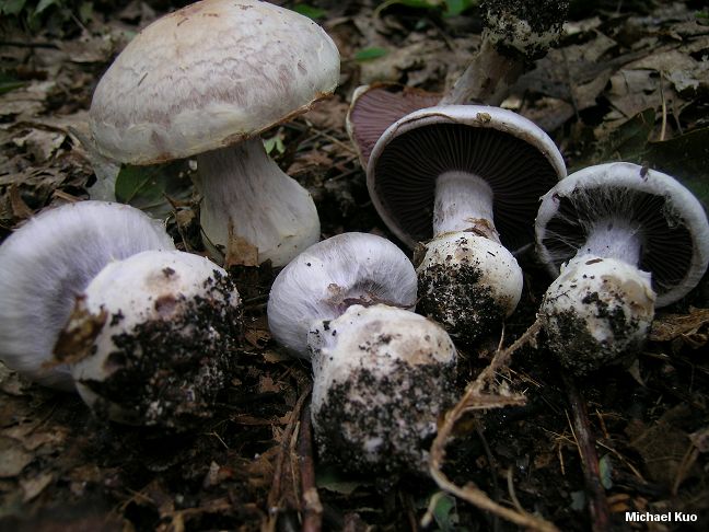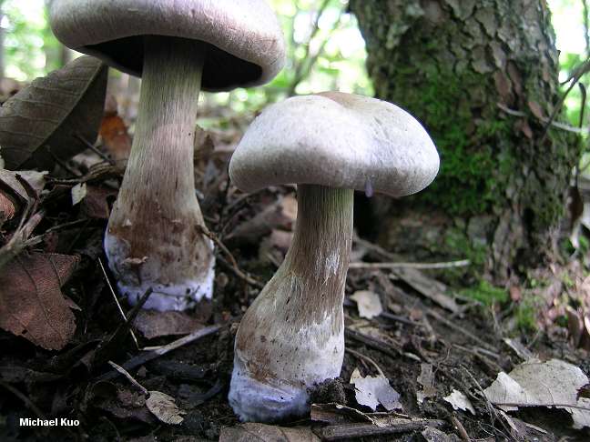 Cortinarius subpulchrifolius appears in the summer and fall, and is apparently common in the Great Lakes region. Its colors and stature are reminiscent of Laccaria ochropurpurea, but that species has a white spore print and gills that remain purplish, rather than eventually becoming rusty brown. Description: Ecology: Mycorrhizal with hardwoods, especially oaks; growing alone or scattered; summer and fall; known from the Great Lakes region. Cap: 4-10 cm; convex, becoming broadly convex; dry; silky; gray to silvery buff, sometimes with pale lilac shades when young; developing rusty to brownish areas and stains. Gills: Attached to the stem; distant or nearly so; thick; deep dusky purple when young, becoming cinnamon to rusty brown; covered by a white cortina when young. Stem: 5-10 cm long; 1-1.5 cm thick at the apex; usually club-shaped; dry; silky; pale lilac near the apex, silvery to grayish elsewhere; sheathed or "booted" with white to pale lilac veil material over the lower portion; often with a rusty ring zone. Flesh: Whitish, grayish, or pale lilac. Odor: Usually somewhat fragrant; sometimes not distinctive. Chemical Reactions: KOH on cap surface negative. Spore Print: Rusty brown. Microscopic Features: Spores 8-10 x 5-6.5 µ; flask-shaped; moderately and widely roughened. Cheilo- and pleurocystidia absent. Pileipellis a cutis. REFERENCES: Kauffman, 1918. (Kauffman, 1918; Kauffman, 1936; Smith, Smith & Weber, 1979.) Herb. Kuo 07170406, 09110505, 09111016. Two species described by Peck, Cortinarius pulchrifolius and Cortinarius rimosus, are similar (see Peck's descriptions, below). The former, apparently, has no "boot" of veil material around the stem base, and the latter has a cap that becomes cracked and reddish brown with maturity. Both species are stocky in comparison to Cortinarius subpulchrifolius. Whether or not contemporary investigation of Peck's species would reveal that they represent the same species in different stages of development or, in the case of Cortinarius pulchrifolius, poor documentation of stem details, remains to be seen. It is at least conceivable that Peck's species are the same, and are identical to Kauffman's Cortinarius subpulchrifolius. Peck, C. H. (1883), Annual Report of the New York State Museum 33: 20. Peck, C. H. (1897), Annual Report of the New York State Museum 48: 12. This site contains no information about the edibility or toxicity of mushrooms. |