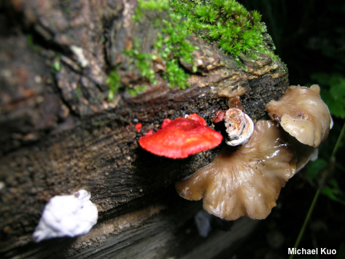 Crepidotus cinnabarinus [ Basidiomycota > Agaricales > Inocybaceae > Crepidotus . . . ] by Michael Kuo Like other species of Crepidotus, Crepidotus cinnabarinus features a brown spore print and a small, fan-shaped fruiting body—but unlike other species in the genus, it is brightly colored, making it fairly unmistakeable. The little mushrooms are brightly colored and fairly easy to see, but they are particularly tiny, maxing out at about 2 cm across. Both of the collections featured here (mine, from Michigan 2008, and one sent to me from Ohio by Crystal Davidson in 2018) were growing on very old deadwood, alongside putrified, decaying remains of another, larger pleurotoid mushroom (possibly another species of Crepidotus). The same phenomenon can be observed in a number of online photos of Crepidotus cinnabarinus, raising the possibility that some sort of parasitism or mutualism is occurring. Crepidotus cinnabarinus was originally described from Michigan, but its range has since been extended into Canada and southward into Mexico—and it has apparently made a fairly recent debut in Europe, as well. Thanks to Crystal Davidson for collecting, documenting, and preserving Crepidotus cinnabarinus for study; her collection is deposited in The Herbarium of Michael Kuo. Description: Ecology: Probably saprobic, but see the comments above; growing alone, scattered, or gregariously on the well decayed deadwood of hardwoods (especially basswood and aspens); fairly rare; widely distributed east of the Great Plains, from southern Canada to Mexico. The illustrated and described collections are from Michigan and Ohio. Cap: 2–18 mm across; semicircular, shell-shaped, or fan-shaped; finely fuzzy when fresh, becoming minutely pitted or more or less bald; dry; bright orangish red. Gills: Close or nearly distant; when young yellow with red edges or red overall; becoming dull brown with maturity. Stem: Absent, but a pale, lateral pseudostem is occasionally present. Flesh: Soft; thin; whitish to yellowish; unchanging when sliced. Odor and Taste: not distinctive. Chemical Reactions: KOH on cap surface slowly dark red. Spore Print: Brown. Microscopic Features: Spores 5–7 x 4–5 µm; broadly ellipsoid; finely roughened, but often appearing more or less smooth; hyaline in KOH; faintly to moderately dextrinoid. Basidia 4-sterigmate. Pleurocystidia not found. Cheilocystidia 50–60 x 6–6 µm; cylindric with rounded or subfusiform apices; flexuous; smooth; thin-walled; hyaline in KOH. Pileipellis a cutis; elements 2.5–5 µm wide, hyaline to pinkish orange in KOH, smooth. Clamp connections not found. REFERENCES: Peck, 1895. (Saccardo, 1899; Kauffman, 1918; Hesler & Smith, 1965; Luther & Redhead, 1981; Schalkwijk-Barendsen, 1991; Bandala & Montoya, 2000; McNeil, 2006; Kuo & Methven, 2010.) Herb. Kuo 09140801, 09161801. This site contains no information about the edibility or toxicity of mushrooms. |
