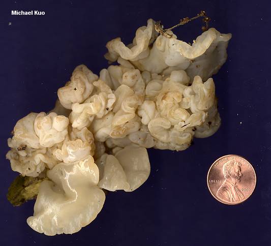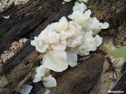 Ductifera pululahuana [ Basidiomycetes > Tremellales > Exidiaceae > Ductifera ... ] by Michael Kuo Ductifera pululahuana (now there's a mouthful) is fairly widely distributed, at least in eastern and southern North America, and its range extends well into South America. It fruits on the decayed wood of hardwoods, and is apparently one of the later fungal species that line up to decompose dead wood when a trees falls, since it typically appears on well rotted logs after the bark has disappeared. Exidia alba is a synonym. Tremella fuciformis is similar but less glob-ish and (slightly) more graceful; it lacks gloeocystidia. Tremella reticulata grows on the ground and has a nearly coral-shaped fruiting body. The tongue-twisting species epithet of Ductifera pululahuana results from the fact that Patouillard originally collected the type specimen in Pululahua, Ecuador. Description: Ecology: Probably saprobic on decaying hardwood logs (typically after the bark has disappeared); late spring, summer, and fall (probably to be expected in winter in tropical and subtropical areas); distribution uncertain but documented in eastern and southern North America, and as far south as Ecuador. Fruiting Body: A mass of individual whitish, jelly-like globs growing in close proximity and often fusing together to form structures reminiscent of exposed brains; individual globs up to about 3 cm across, irregularly shaped but frequently roughly fan-shaped; stemless; flesh thick and gelatinous. Older specimens may discolor somewhat yellowish, brownish, or even pinkish to purplish. Microscopic Features: Spores 9-12 x 4.5-7 µ; sausage shaped or broadly elliptical. Basidia longitudinally septate, with sterigmata to 75 µ long. Gloeocystidia present; often 80 µ long or longer. REFERENCES: (Patouillard, 1893) Donk. (Wells, 1958; Lowy, 1971; Barron, 1999; McNeil, 2006.) Herb. Kuo 06130201, 06070303. This site contains no information about the edibility or toxicity of mushrooms. |