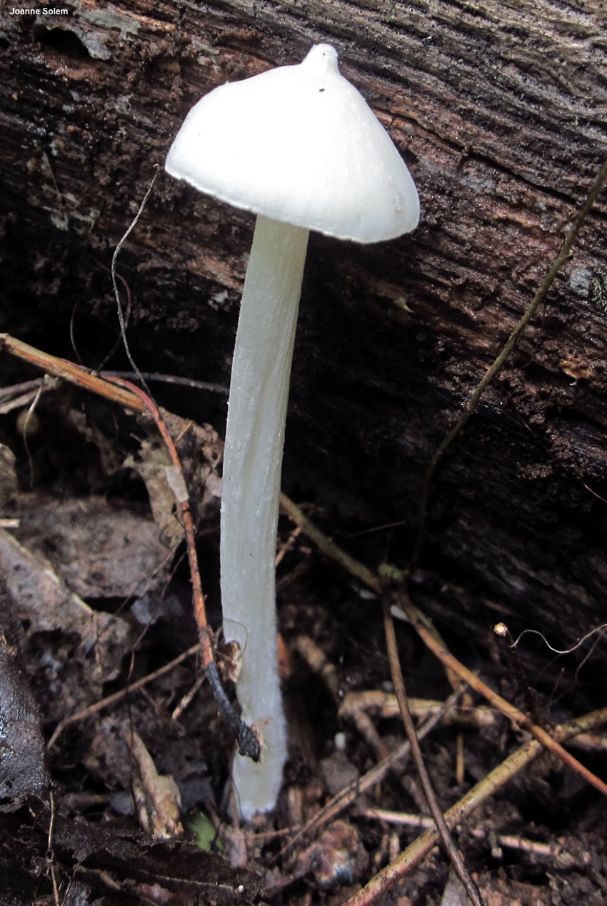 Entoloma alboumbonatum [Basidiomycota > Agaricales > Entolomataceae > Entoloma . . . ] by Michael Kuo This striking entolomatoid mushroom has a conic, white cap with a silky appearance and a protruding central "nipple." It looks a bit like a white version of Entoloma murrayi, which is yellow, or Entoloma quadratum, which is orange—and, like those species, it features cuboid spores that are 4-sided in profile view and look like little ice cubes. The stem of Entoloma alboumbonatum is also white, and remains so through development. The gills are initially white, but with maturity they develop the pink tones characteristic of entolomatoid gills and spore prints. Entoloma alboumbonatum is the same as Entoloma conicum, according to Baroni (2017) and Largent (1994). I have not studied the type collections, but the two collections I have studied manifest enough differences that they should probably be treated separately: