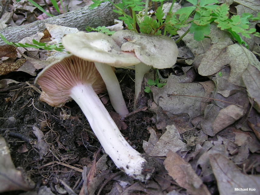 Entoloma griseum [Basidiomycota > Agaricales > Entolomataceae > Entoloma . . . ] by Michael Kuo Entoloma griseum is a medium-sized springtime species with a dull, brownish gray cap that is not pointy like the caps of several other vernal entolomatoid mushrooms. The cap is fairly fragile, and develops a silky sheen as it dries out. Other distinguishing features include the mealy odor and taste; the whitish to grayish gills that become pink with maturity; the whitish stem, which develops hollow pockets with age; and microscopic features (see below). My treatment of Entoloma griseum may or may not agree with your field guide's treatment--or in one case, it may agree with the photo but not with the description. See the explanation below if you care. Description: Ecology: Saprobic; growing alone, scattered, or gregariously under hardwoods in low, wet woods; limited to spring in my area (central Illinois), but reported in Michigan by Kauffman (1918) from "May to October"; apparently limited to eastern North America. Smith, Smith & Weber (1979) report it "in late August and September . . . in rather dry upland hardwood stands." I suspect there are several species involved--a vernal species from low, wet areas (described here), and one or more autumnal species from dry woods. The latter may actually be, at least in part, Entoloma grayanum (Peck) Saccardo, which is very similar. Cap: 4-9 cm; convex with a slight central bump, becoming broadly convex or nearly flat, but usually retaining a slight bump in the center; at first firm, but soon fragile and thin; tacky but not slimy when fresh, becoming dry and silky; brownish gray to silvery gray, fading to buff as it dries out, often resulting in a mottled appearance (hygrophanous); the margin not prominently lined but sometimes faintly lined when wet. Gills: Attached to the stem; close or nearly distant; whitish or very pale gray at first, becoming pink with maturity. Stem: 3-9 cm long; 4-15 mm thick; more or less equal; fairly dry; bald; whitish to pale grayish; "its interior . . . composed of a fibrous pith at first which disappears in places leaving cavities" (Kauffman, 1918). Flesh: Thin; fragile; whitish to grayish. Odor and Taste: Mealy. Chemical Reactions: KOH on cap surface negative. Spore Print: Pink. Microscopic Features: Spores 8-11 x 6-8 µ; 5- and 6-sided; smooth; inamyloid. Hymenial cystidia absent. Pileipellis a cutis with occasional upright elements; elements hyaline to brownish in KOH. Clamp connections absent. REFERENCES: Peck, 1904. (Saccardo, 1912; Kauffman, 1918; Hesler, 1963 [not 1967]; Smith, Smith & Weber, 1979; Phillips, 1991/2005 [see comments below].) Herb. Kuo 05079502, 05070401, 05070704. In 1904 Charles Peck described Entoloma griseum, the mushroom treated above. He had described a different mushroom, "Leptonia grisea" (1893), a few years earlier. When mycologists later folded Leptonia into Entoloma, the result was two species with the same name. Hesler's 1967 treatment of "Entoloma griseum" is actually a treatment of Peck's Leptonia, and therefore bears the official name "Entoloma griseum (Peck) Hesler," since Peck was the original author of the species name, but Hesler put the species in Entoloma. However, this created a conflict with Peck's Entoloma griseum--a mistake Hesler later realized and corrected (1974) by simply providing a "nom. nov." (new name) for the taxon: Entoloma squamatum. "Entoloma griseum Peck," the mushroom featured on this page, has not changed its name since it was first described. It is featured in Saccardo, 1912 and thoroughly described in Kauffman (1918). Smith, Smith & Weber (1979) treated Entoloma as "Rhodophyllus," and their "R. griseus (Peck)" is an incorrectly made, unofficial combination into Rhodophyllus--although the mushroom they describe, along with Helen Smith's illustration, does correspond to Peck's Entoloma griseum (which they say they include "because it is an example of a ubiquitous mushroom easily confused with half a dozen other species in the genus some of which are poisonous"). Roger Phillips (1991/2005) provides a photo that appears to match Peck's Entoloma griseum and the photos above--but his description follows Peck's Leptonia grisea and is correctly labeled "Entoloma griseum (Peck) Hesler." To verify my claim, note among other things that Phillips cites the width of the stem as "3-4 mm," clearly not matching the more robust stems in the photo. I suspect that Phillips took photos of specimens correctly identified as Entoloma griseum by others at a mushroom foray, and later consulted the Hesler monograph when writing text for his book, without noticing the problem. This site contains no information about the edibility or toxicity of mushrooms. |