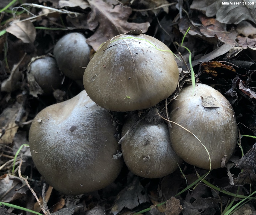 Entoloma lividoalbum [Basidiomycota > Agaricales > Entolomataceae > Entoloma . . . ] by Michael Kuo This large entolomatoid mushroom is fond of hardwoods in western North America (especially quaking aspen and coast live oak), and can be recognized by its fairly large stature (often reminiscent of a Tricholoma), the yellow-brown cap that does not develop a prominently lined margin, the finely lined white stem, and the mealy odor—although the mealy odor is absent in one West-Coast form. Crucial microscopic features include 5- to 6-sided, heterodiametric spores; intracellular pigment in the pileipellis; and the presence of clamp connections. Similar species under hardwoods in the western states include Entoloma ferruginans and Entoloma cinereolamellatum, both of which have gray gills (before turning pink from maturing spores)—and Entoloma subsaundersii, which usually grows in tightly packed clusters and features a cap that is pale when young, from a coating of whitish fibrils, becoming darker brown with age as the fibrils separate (the opposite of the dark-to-light progression of Entoloma lividoalbum). Species in the Entoloma rhodopolium group have lined cap margins and are less sturdy. Entoloma lividoalbum was originally described (Kühner & Romagnesi 1954) from Europe; our North American versions may represent as-yet unnamed species. Thanks to Mila Visser 't Hooft for documenting, collecting, and preserving Entoloma lividoalbum for study; her collection is deposited in The Herbarium of Michael Kuo. Description: Ecology: Saprobic; growing alone, scattered, or gregariously under hardwoods (including quaking aspen and coast live oak); summer and fall, or over winter in coastal California; fairly widely distributed west of the Great Plains; occasionally (perhaps erroneously?) reported from northeastern North America; also known from temperate Europe. The illustrated and described collections are from California and Colorado. Cap: 5–7 cm; conico-convex to bell-shaped or convex at first, becoming broadly convex, broadly bell-shaped, or nearly flat; greasy when fresh; bald; dark grayish brown when young, quickly fading to yellow-brown or grayish tan; the margin not lined or only faintly lined at maturity. Gills: Narrowly attached to the stem; close or nearly distant; at first white, becoming pink with maturity. Stem: 5–8 cm long; 1–2 cm thick; more or less equal; dry; bald but finely lined longitudinally; white. Flesh: Thin; fragile; white. Odor and Taste: Mealy or, in forma inodoratum, not distinctive. Chemical Reactions: KOH on cap surface negative. Spore Print: Pink. Microscopic Features: Spores 7–10 x 6–8 µm; mostly 5- and 6-sided; heterodiametric; smooth; hyaline in KOH. Basidia mostly 4-sterigmate. Hymenial cystidia not found. Pileipellis a cutis with intracellular brownish pigment; elements 5–7.5 µm wide, smooth, hyaline in KOH; terminal cells cylindric with rounded or subacute apices. Clamp connections present. REFERENCES: (Kühner & Romagnesi, 1954) Kubicka, 1975. (Noordeloos, 1988; Largent, 1994; Breitenbach & Kränzlin, 1995; Evenson, 1997; Miller & Miller, 2006; Noordeloos, 2008; Desjardin, Wood & Stevens, 2015; Evenson, 2015; Cripps, Evenson & Kuo, 2016.) Herb. Kuo 08150712, 01122004. This site contains no information about the edibility or toxicity of mushrooms. |