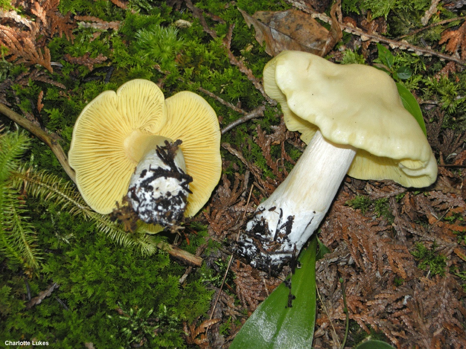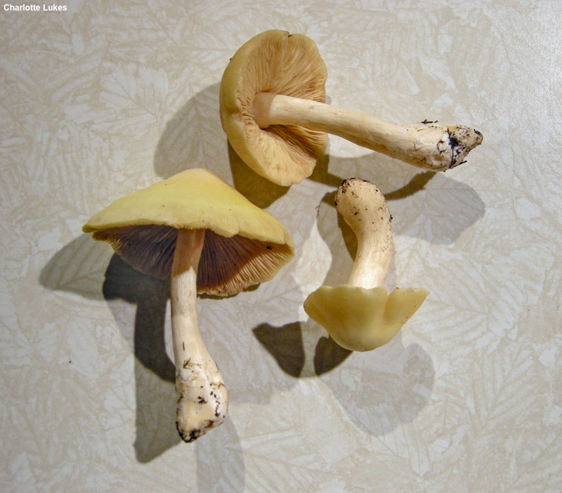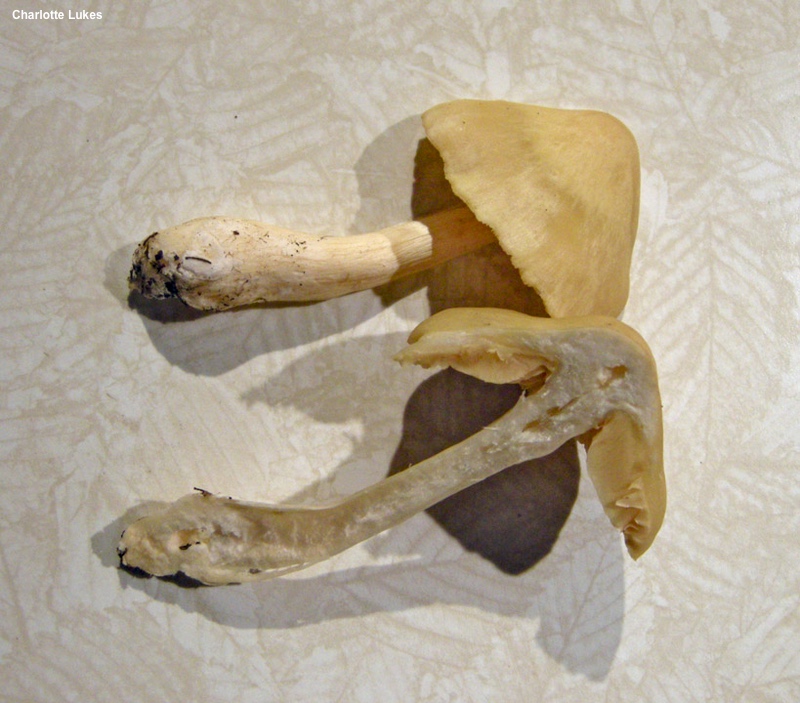 [Basidiomycota > Agaricales > Entolomataceae > Entoloma . . . ] Entoloma luridum by Michael Kuo, 19 March 2024 This eastern North American entolomatoid mushroom is found under conifers from the Great Lakes region to the Appalachians and the Maritime Provinces. Like other entolomatoids it features a brownish pink spore print and gills that are attached to the stem—but it separates itself with a combination of features: the gills are yellow before being covered with spore dust; the mature cap is pale yellow and bell-shaped, with a broadly wrinkled margin; the flesh is thick and firm; the odor is not distinctive; and, under the microscope, the spores are thin-walled, angular, and vaguely 7-sided. Look-alikes include Entoloma subsinuatum, with a white, more convex cap and gills that are only pale yellow when young, before fading to whitish and then picking up pink spore dust; Entoloma whiteae, with a pale brown cap, pale yellow gills, and a strong, foul odor; and Entoloma flavifolium, with a smaller, convex cap, fragile flesh, and thick-walled spores. Outside of Entoloma, Tricholoma equestre is similar, but features a white spore print, a mealy odor, and very different microscopic features. Thanks to Charlotte Lukes for collecting, documenting, and preserving Entoloma luridum for study; her collection is deposited in The Herbarium of Michael Kuo. Description: Ecology: Saprobic (possibly mycorrhizal?); growing alone or gregariously under conifers; late summer and fall; originally described from Tennessee (Hesler 1967); distributed in eastern North America from the Great Lakes region to the Appalachians and the Maritime Provinces. The illustrated and described collection is from Wisconsin. Cap: 5–8 cm across; broadly conic to broadly bell-shaped; bald; moist or dry; the margin becoming broadly wrinkled; pale creamy yellow; hygrophanous. Gills: Narrowly attached to the stem; close; short-gills frequent; fairly bright yellow, becoming brownish pink as spores mature. Stem: 6–10 cm long; 1–2 cm thick; equal or slightly tapered to apex; dry; bald; whitish to yellowish; basal mycelium white. Flesh: Thick; white; unchanging when sliced. Odor: Not distinctive. Spore Print: Brownish pink. Microscopic Features: Spores 5–10 x 5–7 µm; angular; predominately 7-sided; subglobose to ellipsoid overall, with a large apiculus; smooth; thin-walled; hyaline in KOH; inamyloid. Basidia 35–40 x 6–10 µm; clavate; 4-sterigmate. Hymenial cystidia not found. Pileipellis an ixocutis; elements 4–8 µm wide, smooth, hyaline in KOH; subcutis of inflated elements. Clamp connections present. REFERENCES: L. R. Hesler, 1967. (Hesler, 1967; Noordeloos, 1988; Roody, 2003; Binion et al, 2008; Morgado et al., 2013; Baroni, 2017.) Herb. Kuo 09072301. This site contains no information about the edibility or toxicity of mushrooms. |