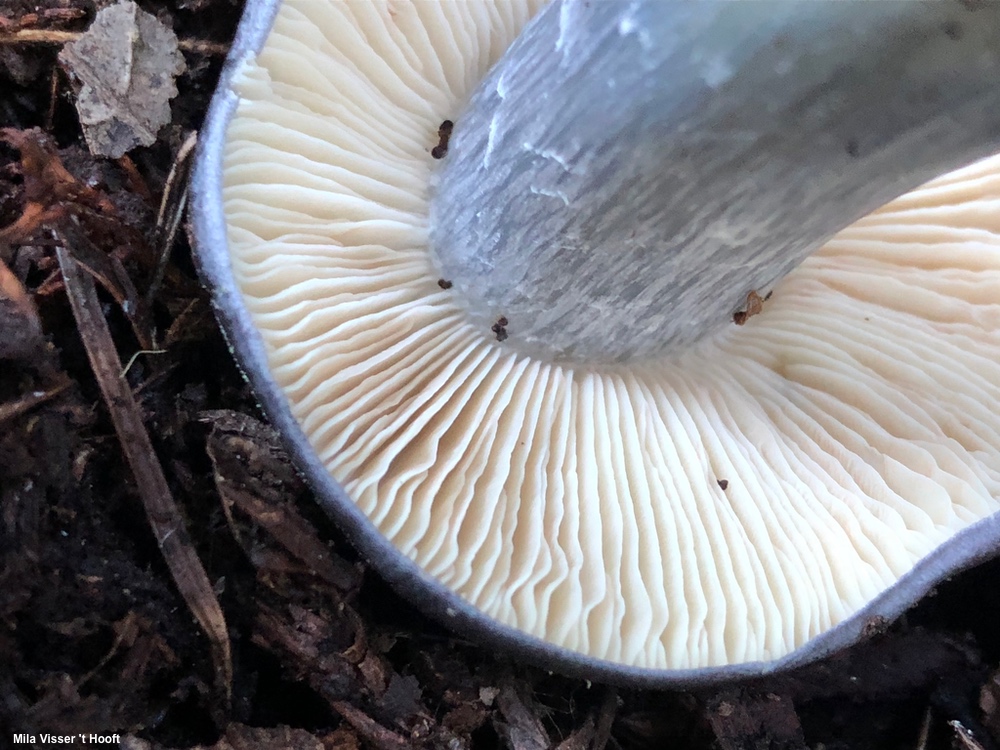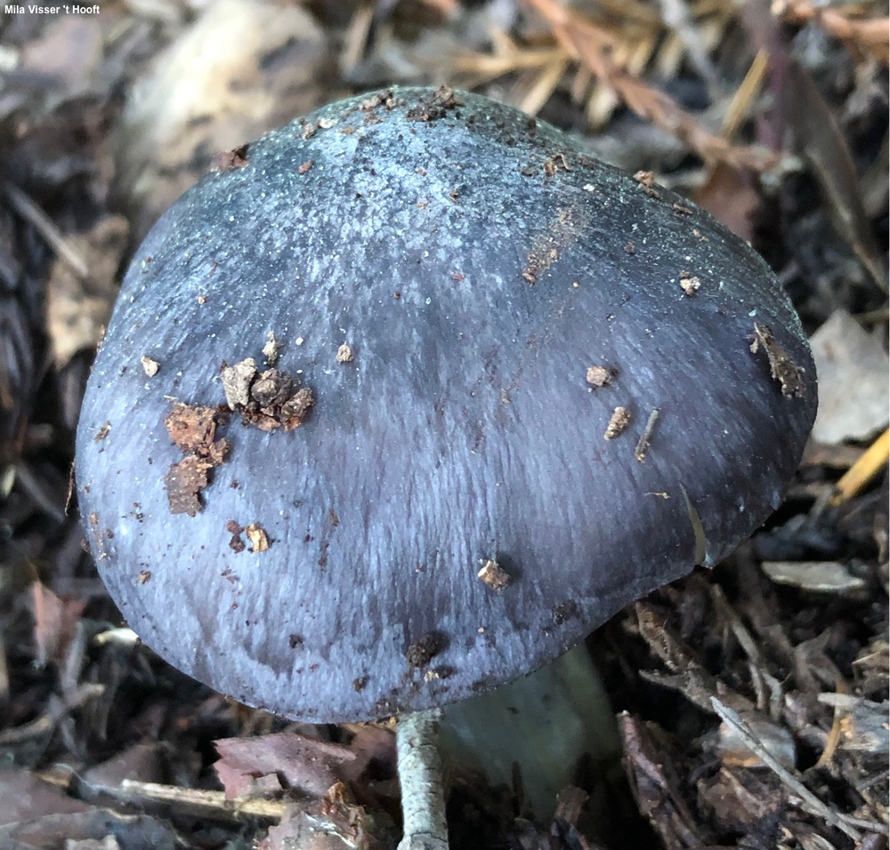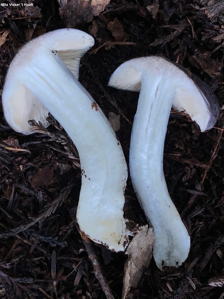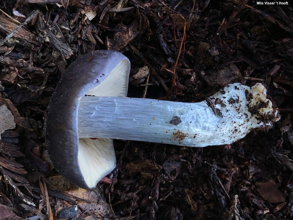 [Basidiomycota > Agaricales > Entolomataceae > Entoloma . . . ] Entoloma species 02 by Michael Kuo, 30 October 2024 This North American West Coast entolomatoid mushroom has a sticky, blue-gray to purple-gray cap, and a white stem that develops grayish to bluish hues. It is a fairly large mushroom, reminiscent of a Tricholoma in stature, with a mealy odor. The species described here is very similar to the European species Entoloma bloxamii, but is phylogenetically distinct, according to Morgado et al. (2013); the authors called the species "Entoloma bloxamii–NA" and said they "prefer to wait for further collections to give a full description and propose this taxon as a new species." Although an intervening online publication, without peer review, gave the species a name (see discussion), I will defer using it until the hypothesis is supported in an actual scientific publication. Thanks to Mila Visser 't Hooft for collecting, documenting, and preserving Entoloma species 02 for study; her collection is deposited in The Herbarium of Michael Kuo. Description: Ecology: Saprobic; growing alone or gregariously under various trees in mixed coastal redwood forests; winter; northern California and the Pacific Northwest. The illustrated and described collections are from California. Cap: 5–10 cm across; convex becoming broadly convex, broadly bell-shaped, or nearly flat; bald; sticky when fresh; deep bluish gray to lilac gray or blackish gray; the pigment sometimes breaking up to create a streaked appearance; the margin not lined. Gills: Attached to the stem by means of a notch; close; short-gills frequent; white, becoming pink as spores mature. Stem: 5–7 cm long; 1–2 cm thick; tapered to base; dry; bald or a little pruinose; whitish or bluish gray; basal mycelium white. Flesh: White; unchanging when sliced. Odor: Mealy. Spore Print: Pink. Microscopic Features: Spores 6–10 x 5–9 µm; angular; 6- or 7-sided, with shallow angles; more or less subglobose overall, with a narrowed apicular end; smooth; hyaline in KOH or ammonia; inamyloid. Basidia 38–50 x 6–8 µm; clavate; 4-sterigmate. Hymenial cystidia not found. Pileipellis an ixocutis; elements 2–6 µm wide, smooth, hyaline to yellowish in KOH; clamp connections present. Subcutis elements 5–15 µm wide; septate; smooth; hyaline to brown in KOH. REFERENCES: (Arora, 1986; Largent, 1994; Morgado et al., 2013; Desjardin, Wood & Stevens, 2015; Siegel & Schwarz, 2016.) Herb. EIU ASM 373. Herb. Kuo 01191302, 01182102. This site contains no information about the edibility or toxicity of mushrooms. |