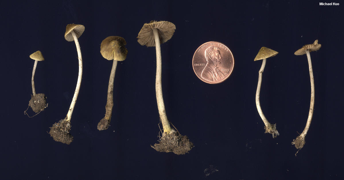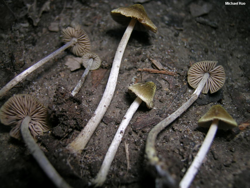 Entoloma versatile [Basidiomycota > Agaricales > Entolomataceae > Entoloma . . . ] by Michael Kuo Entoloma versatile is a rare and interesting entolomatoid mushroom with a small, conic cap, reminiscent of a mycenoid mushroom or even an Inocybe. However, its pink spore print and angular spores place it definitively in Entoloma. Its cap is radially fibrillose and dark brownish olive, and its thin, whitish stem has a covering of stiff hairs near the base. It's like someone decided to shrink Tricholoma sejunctum and turn it into an Inocybe (even giving it brownish gills)--but then changed her mind and decided to give it Entoloma traits at the last second. However, it is under the microscope that Entoloma versatile really stands out: it has impressive, lageniform cheilocystidia (sterile cells on the edges of the gills) that look like half-inflated balloons with sharpened points. Entoloma versatile is a European species first named in the nineteenth century. In North America it has been reported from Washington state by Largent (1994)--and, here, from Illinois. Only one other collection labeled Entoloma versatile (or "Pouzarella versatilis," a synonym), from Iowa, shows up in a search of the nation's major herbaria at MyCoPortal. There are small differences in color, odor, and morphology of cystidia between Largent's description of Washington material, my collection (described below), and European descriptions of the species--either indicating substantial variability in the species, or that several members of a species group are involved. Description: Ecology: Saprobic; growing gregariously in bare soil under oaks and other hardwoods; fall; North American distribution uncertain (the illustrated and described collection was made in Illinois; see also the comments above about reports from Washington and Iowa). Cap: 1-2 cm; conic to broadly conic; dry; finely radially fibrillose and silky; dark brownish olive; the margin not lined. Gills: Narrowly attached to the stem; nearly distant; dull brownish at first, becoming darker brownish with a pinkish hue. Stem: 3-6 cm long; 1-3 mm thick; equal, or slightly tapered toward the apex; dry; finely fibrillose or nearly bald; whitish; discoloring brownish to yellowish near the base; base with stiff whitish hairs. Flesh: Thin; insubstantial; whitish to brownish. Odor and Taste: Odor unpleasant; taste mealy. Chemical Reactions: KOH on cap surface negative. Spore Print: Pink. Microscopic Features: Spores 7-11 x 5-7 µ; mostly 6-sided; heterodiametric; angular; smooth; hyaline. Pleurocystidia absent. Cheilocystidia abundant; mostly lageniform with a long, pointed neck, but occasionally widely fusiform or subsaccate (when collapsed); 35-65 x 12-20 µ. Pileipellis a cutis; elements brown to brownish in 10% ammonia, finely encrusted, 5-10 µ wide. Clamp connections not found. REFERENCES: (Gillet, 1876) M. M. Moser, 1978. (Moser, 1983; Noordeloos, 1988; Largent, 1994; Breitenbach & Kränzlin, 1995; Noordeloos, 2008.) Herb. Kuo 09300508. This site contains no information about the edibility or toxicity of mushrooms. |