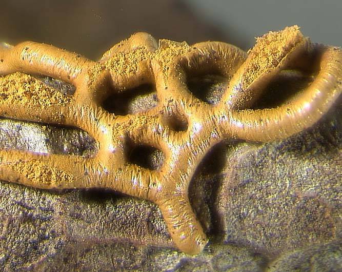 Plasmodiocarpo: Cuerpo fructífero sésil , ramificado, en forma de anillos o como una red que se forma cuando un plasmodio se concentra en sus venas principales (sin dividirse en unidades mas pequeñas) durante la fructificación