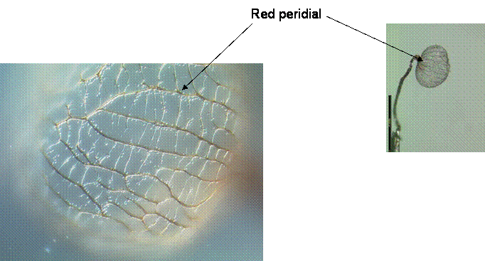 Red peridial: Estructura reticulada formada cuando ciertas porciones del peridio persisten en el cuerpo fructífero maduro. Característica de algunos miembros del orden Liceales