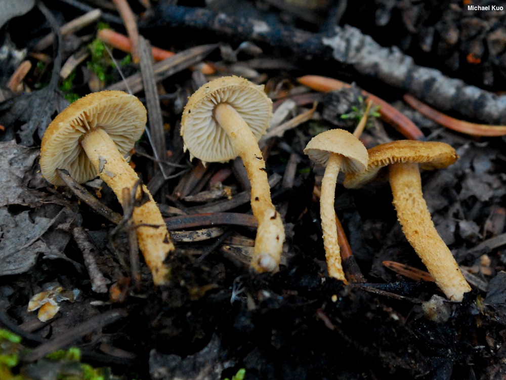 [ Basidiomycota > Agaricales > Tubariaceae > Flammulaster . . . ] Flammulaster carpophilus by Michael Kuo, 29 January, 2026 This little guy has caused an awful lot of confusion over the years. Flammulaster carpophilus is a tiny, fibrillose-scaly mushroom found in Europe and North America, usually arising from leaf litter in hardwood or mixed forests. Its cap and stem are granular- to fibrillose-scaly, and its gills are well spaced, and attached to the stem. It is similar to Flammulaster erinaceellus, but smaller and paler—and it does not grow on wood like the latter species. Flammulaster carpophilus is often mistaken for a Cystoderma since its cap and stem are granular-scaly; in fact it was treated as Cystoderma rhombosporum by North American authors until at least the late 1970s. It has also been placed in the genus Phaeomarasmius, as well as other genera. Further complicating things, several versions of Flammulaster carpophilus have been, and sometimes continue to be, treated as separate species. The version with papillate spores is sometimes treated as Flammulaster rhombosporus; a pale, pinkish version with capitate cheilocystidia is sometimes called Flammulaster subincarnata. Here I follow Vellinga (1986) and treat carpophilus as a broadly defined species encompassing the others as forms or varieties. Description: Ecology: Saprobic; growing alone or gregariously in leaf litter or conifer duff in hardwood forests or in mixed woods; spring through fall; originally described from Scandinavia (Fries 1815); fairly widespread in Europe, especially in beech forests; North American distribution uncertain, but usually reported from northern and montane regions. The illustrated and described collection is from Colorado. Cap: 5–12 mm; convex becoming broadly convex; dry; densely covered with granular to fibrillose scales; yellow-brown; the margin hung with triangular toothlike remnants of the fibrillose partial veil. Gills: Narrowly attached to the stem; nearly distant; short-gills frequent near the margin; whitish to pale yellow at first, becoming faintly brownish. Stem: 10–23 mm long; 1–4 mm mm thick; equal; smooth and yellowish at the apex, but elsewhere covered with fibrillose scales like the cap; basal mycelium white. Flesh: Yellowish to brownish; unchanging when sliced. Odor: Not distinctive. Spore Print: Not documented. Microscopic Features: Spores 8–11 x 4–6 µm; amygdaliform, or exceptionally subpapillate; smooth; hyaline in KOH; inamyloid. Basidia 25–28 x 4–6 µm; clavate; 4-sterigmate. Cheilocystidia 25–40 x 2–5 µm; fusiform to nearly aciculate; smooth; thin-walled; hyaline in KOH. Pleurocystidia not found. Pileipellis composed of chained subglobose to globose elements 6–20 µm wide, smooth or roughened, orange-brown in KOH. Clamp connections present. REFERENCES: (E. M. Fries, 1815) F. S. Earle ex E. C. Vellinga, 1986. (Singer & Smith, 1945; Smith, Smith & Weber, 1979; Vellinga, 1986; McNeil, 2006; Boccardo et al., 2008; Buczacki et al., 2012; Gmnider & Böhning, 2017; Vesterholt & Rald, 2018; Læssøe & Petersen, 2019.) Herb. Kuo 07252102. This site contains no information about the edibility or toxicity of mushrooms. |